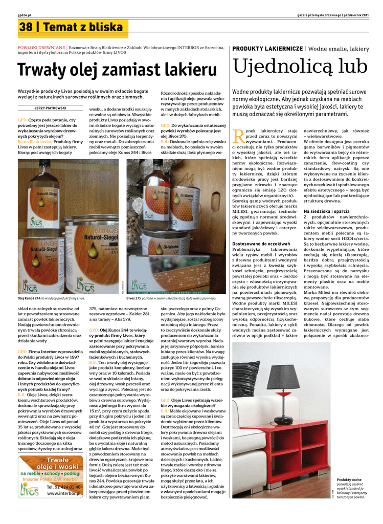 gpd24.pl gazeta przemysłu drzewnego | październik 2011 38 | Temat z bliska POWŁOKI DREWNIANE | Rozmowa z Beatą Blatkiewicz z Zakładu Wielobranżowego INTERBOR ze Szczecina, importera i dystrybutora na Polskę produktów firmy LIVOS PRODUKTY LAKIERNICZE | Wodne emalie, lakiery Wszystkie produkty Livos posiadają w swoim składzie bogate wyciągi z naturalnych surowców roślinnych oraz ziemnych. Wodne produkty lakiernicze pozwalają spełniać surowe normy ekologiczne. Aby jednak uzyskana na meblach powłoka była estetyczna i wysokiej jakości, lakiery te muszą odznaczać się określonymi parametrami. Trwały olej zamiast lakieru Ujednolicą lub GPD: Często pada pytanie, czy potrzebny jest jeszcze lakier do wykańczania wyrobów drzewnych pokrytych olejem? Beata Blatkiewicz: Produkty firmy Livos w pełni zastępują lakiery. Biorąc pod uwagę ich bogaty wosku, a dodane środki osuszające wolne są od ołowiu. Wszystkie produkty Livos posiadają w swoim składzie bogate wyciągi z naturalnych surowców roślinnych oraz ziemnych. Nie posiadają terpentyny oraz metali. Do zabezpieczania mebli wewnątrz pomieszczeń polecamy oleje Kunos 244 i Bivos GPD: Do wykańczania ostatecznej powłoki wyrobów polecany jest olej Bivos 375. B.B.: Doskonale spełnia rolę wosku na meblach, bo posiada w swoim składzie dużą ilość płynnego wo- R ynek lakierniczy staje przed coraz to nowszymi wyzwaniami. Producenci oczekują nie tylko produktów o wysokiej jakości, ale też takich, które spełniają wszelkie normy ekologiczne. Rozwiązaniem mogą być wodne produkty lakiernicze, dzięki którym środowisko pracy jest bardziej przyjazne zdrowiu i znacząco ogranicza się emisję LZO (lotnych związków organicznych). Szeroką gamę wodnych produktów lakierniczych oferuje marka MILESI, gwarantując technologię zgodną z normami środowiskowymi i zapewniając wysoki standard jakościowy i estetyczny tworzonych powłok. fot. Interbor Dostosowane do oczekiwań Olej Kunos 244 to wiodący produkt firmy Livos. skład naturalnych surowców, od lat z powodzeniem są stosowane zamiast powłok lakierniczych. Nadają powierzchniom drewnianym trwałą powłokę chroniącą przed skutkami zabrudzenia oraz działania wody. GPD: Firma Interbor wprowadziła do Polski produkty Livos w 1997 roku. Czy wieloletnie doświadczenie w handlu olejami Livos zapewnia nabywcom możliwość dobrania odpowiedniego oleju i innych produktów do specyficznych potrzeb każdej firmy? B.B.: Oleje Livos, dzięki szerokiemu wachlarzowi produktów, doskonale sprawdzają się przy pokrywaniu wyrobów drzewnych wewnątrz oraz na zewnątrz pomieszczeń. Oleje Livos od ponad 35 lat są produkowane z wysokiej jakości pozyskiwanych surowców roślinnych. Składają się z oleju lnianego tłoczonego na kilka sposobów, żywicy naturalnej oraz Bivos 375 posiada w swoim składzie dużą ilość wosku płynnego. 375, natomiast na zewnętrzne zestawy ogrodowe – Kaldet 281, a na tarasy – Alis 579. GPD: Olej Kunos 244 to wiodący produkt firmy Livos, który w pełni zastępuje lakier i znajduje zastosowanie przy pokrywania mebli sypialnianych, stołowych, łazienkowych i kuchennych. B.B.: Ten trwały olej występuje jako produkt kompletny, bezbarwny oraz w 16 kolorach. Posiada w swoim składzie olej lniany, olej drzewny, wosk pszczeli oraz wyciągi z żywic. Polecany jest do ostatecznego pokrywania wyrobów z drewna surowego. Wydajność z jednego litra wynosi do 15 m2, przy czym zużycie spada przy drugim pokryciu i jeden litr produktu wystarcza na pokrycie 40 m2. Gdy jest stosowany do mebli czy podłóg z drewna litego, dodatkowo podkreśla ich piękno, bo uwydatnia słoje i naturalną głębię koloru drewna. Może być z powodzeniem stosowany na drewno egzotyczne, krajowe oraz fornir. Dużą zaletą jest też możliwość wykańczania powłok po bejcach olejem bezbarwnym Kunos 244. Powłoka pozostaje trwała i dodatkowo powstaje warstwa zabezpieczająca przed płowieniem koloru czy powstawaniem plam. sku pszczelego oraz z palmy Copernica. Aby jego nakładanie było wydajniejsze, został wzbogacony odrobiną oleju lnianego. Przez to rzeczywiście doskonale służy producentom do wykańczania ostatniej warstwy wyrobu. Nadaje jej satynowy półpołysk, bardzo lubiany przez klientów. Na uwagę zasługuje również wysoka wydajność. Jeden litr tego oleju pozwala pokryć 100 m2 powierzchni. I co ważne, może on być z powodzeniem wykorzystywany do pielęgnacji wykonywanej przez klienta oraz do pokrywania rzeźb. GPD: Oleje Livos spełniają wszelkie wymagania ekologiczne? B.B.: Meble olejowane i woskowane są coraz częściej kupowane i świadomie wybierane przez klientów. Dostrzegają oni ekologiczne walory pokrywania drewna olejami i woskami, bo pragną powrócić do metod naturalnych. Posiadamy atesty świadczące o możliwości stosowania powłok na meblach dziecięcych i kuchennych. Ładne, trwałe meble i wyroby z drewna litego, które cieszą oko i nie są pokryte warstwami lakierów, mogą służyć przez lata, a ich użytkownicy z łatwością i zgodnie z własnymi upodobaniami mogą je bezpiecznie pielęgnować. Problematyka lakierowania wielu typów mebli i wyrobów z drewna produktami wodnymi związana jest z kwestią szybkości schnięcia, przejrzystością powstałej powłoki oraz – bardzo często – własnością utrzymywania się produktów lakierniczych na powierzchniach pionowych, zwaną powszechnie tiksotropią. Wodne produkty marki Milesi charakteryzują się wysokim wypełnieniem, przejrzystością oraz wysoką odpornością fizykochemiczną. Ponadto, lakiery z cykli wodnych można zastosować zarówno w opcji: podkład + lakier nawierzchniowy, jak również – wielowarstwowo. W ofercie dostępna jest szeroka gama barwników i pigmentów do wytwarzania bejcy do różnorakich form aplikacji: poprzez zanurzenie, flow-coating czy standardowy natrysk. Są one wykonywane na życzenie klienta z dostosowaniem do konk