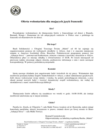 Oferta wolontariatu dla znających język francuski Kto? Poszukujemy wolontariuszy do tłumaczenia listów z francuskiego od dzieci z Ruandy, Burundi, Konga i Kamerunu do ich adopcyjnych rodziców w Polsce oraz z polskiego na francuski od ofiarodawców do dzieci. Dla kogo? Ruch Solidarności z Ubogimi Trzeciego Świata „Maitri” od 40 lat zajmuje się organizowaniem pomocy do wybranych ośrodków w Afryce, Azji i w znacznie mniejszym stopniu w Ameryce Łacińskiej (Peru, Brazylia). Podstawowym programem pomocy jest „Adopcja Serca” – patronat nad konkretnym, znanym z imienia i nazwiska, dzieckiem w Afryce. Ofiarodawca płaci co miesiąc składkę o równowartości 13 EUR. Po trzech miesiącach od pierwszej wpłaty otrzymuje zdjęcie dziecka, podstawowe informacje o nim i może nawiązać korespondencję. W pomocy pośredniczą misjonarki. Kontakt Istotą naszego działania jest angażowanie ludzi świeckich do tej pracy. Wolontariat daje możliwość poznania kultury krajów frankofońskich w Afryce, a także odmienności językowych. Jeśli chcesz wykorzystać swoje talenty i wiedzę, by pomóc potrzebującym dzieciom, a przy okazji poznać nowych ludzi i tworzyć dynamiczny zespół wolontariuszy, nie wahaj się skontaktować z nami: [email protected]. Kiedy? Tłumaczenie listów odbywa się zasadniczo we wtorki w godz. 16:00-18:00, ale istnieje możliwość umówienia się w innym terminie. Gdzie? Parafia św. Józefa, ul. Filaretów 7, sala Matki Teresy (wejście od ul. Rymwida, należy minąć kancelarię parafialną, skręcić korytarzem w prawo, ostatnie drzwi po lewej stronie to Biuro „Adopcji Serca” – sala Matki Teresy). Konrad Czernichowski Odpowiedzialny za lubelską wspólnotę Ruchu „Maitri” Ruch Solidarności z Ubogimi Trzeciego Świata „Maitri” – wspólnota lubelska Parafia św. Józefa ul. Filaretów 7 20-609 Lublin PeKaO SA III/O Lublin 76 1240 2382 1111 0000 3926 0677 e-mail: [email protected] www.maitri.pl tel. 81 525 78 56 (wt, 16:00-18:00)