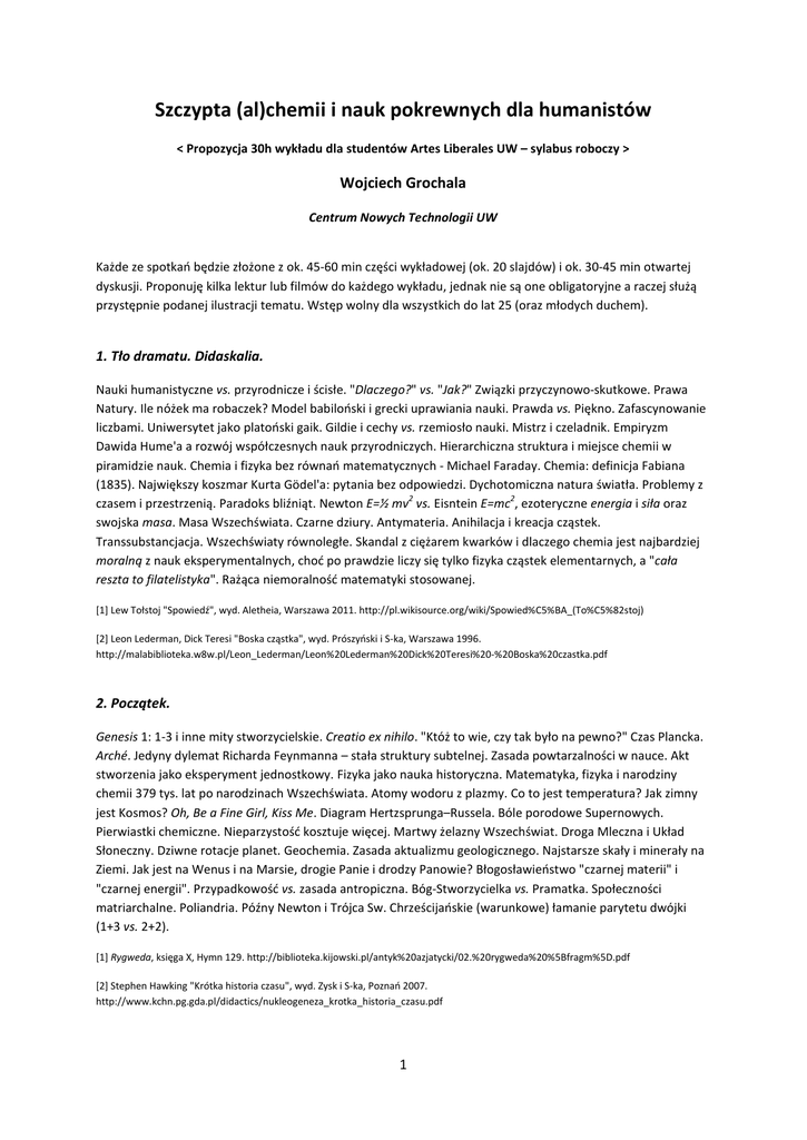 Szczypta (al)chemii i nauk pokrewnych dla humanistów < Propozycja 30h wykładu dla studentów Artes Liberales UW – sylabus roboczy > Wojciech Grochala Centrum Nowych Technologii UW Każde ze spotkań będzie złożone z ok. 45-60 min części wykładowej (ok. 20 slajdów) i ok. 30-45 min otwartej dyskusji. Proponuję kilka lektur lub filmów do każdego wykładu, jednak nie są one obligatoryjne a raczej służą przystępnie podanej ilustracji tematu. Wstęp wolny dla wszystkich do lat 25 (oraz młodych duchem). 1. Tło dramatu. Didaskalia. Nauki humanistyczne vs. przyrodnicze i ścisłe. "Dlaczego?" vs. "Jak?" Związki przyczynowo-skutkowe. Prawa Natury. Ile nóżek ma robaczek? Model babiloński i grecki uprawiania nauki. Prawda vs. Piękno. Zafascynowanie liczbami. Uniwersytet jako platoński gaik. Gildie i cechy vs. rzemiosło nauki. Mistrz i czeladnik. Empiryzm Dawida Hume'a a rozwój współczesnych nauk przyrodniczych. Hierarchiczna struktura i miejsce chemii w piramidzie nauk. Chemia i fizyka bez równań matematycznych - Michael Faraday. Chemia: definicja Fabiana (1835). Największy koszmar Kurta Gödel'a: pytania bez odpowiedzi. Dychotomiczna natura światła. Problemy z 2 2 czasem i przestrzenią. Paradoks bliźniąt. Newton E=½ mv vs. Eisntein E=mc , ezoteryczne energia i siła oraz swojska masa. Masa Wszechświata. Czarne dziury. Antymateria. Anihilacja i kreacja cząstek. Transsubstancjacja. Wszechświaty równoległe. Skandal z ciężarem kwarków i dlaczego chemia jest najbardziej moralną z nauk eksperymentalnych, choć po prawdzie liczy się tylko fizyka cząstek elementarnych, a "cała reszta to filatelistyka". Rażąca niemoralność matematyki stosowanej. [1] Lew Tołstoj "Spowiedź", wyd. Aletheia, Warszawa 2011. http://pl.wikisource.org/wiki/Spowied%C5%BA_(To%C5%82stoj) [2] Leon Lederman, Dick Teresi "Boska cząstka", wyd. Prószyński i S-ka, Warszawa 1996. http://malabiblioteka.w8w.pl/Leon_Lederman/Leon%20Lederman%20Dick%20Teresi%20-%20Boska%20czastka.pdf 2. Początek. Genesis 1: 1-3 i inne mity stworzycielskie. Creatio ex nihilo. "Któż to wie, czy tak było na pewno?" Czas Plancka. Arché. Jedyny dylemat Richarda Feynmanna – stała struktury subtelnej. Zasada powtarzalności w nauce. Akt stworzenia jako eksperyment jednostkowy. Fizyka jako nauka historyczna. Matematyka, fizyka i narodziny chemii 379 tys. lat po narodzinach Wszechświata. Atomy wodoru z plazmy. Co to jest temperatura? Jak zimny jest Kosmos? Oh, Be a Fine Girl, Kiss Me. Diagram Hertzsprunga–Russela. Bóle porodowe Supernowych. Pierwiastki chemiczne. Nieparzystość kosztuje więcej. Martwy żelazny Wszechświat. Droga Mleczna i Układ Słoneczny. Dziwne rotacje planet. Geochemia. Zasada aktualizmu geologicznego. Najstarsze skały i minerały na Ziemi. Jak jest na Wenus i na Marsie, drogie Panie i drodzy Panowie? Błogosławieństwo "czarnej materii" i "czarnej energii". Przypadkowość vs. zasada antropiczna. Bóg-Stworzycielka vs. Pramatka. Społeczności matriarchalne. Poliandria. Późny Newton i Trójca Sw. Chrześcijańskie (warunkowe) łamanie parytetu dwójki (1+3 vs. 2+2). [1] Rygweda, księga X, Hymn 129. http://biblioteka.kijowski.pl/antyk%20azjatycki/02.%20rygweda%20%5Bfragm%5D.pdf [2] Stephen Hawking "Krótka historia czasu", wyd. Zysk i S-ka, Poznań 2007. http://www.kchn.pg.gda.pl/didactics/nukleogeneza_krotka_historia_czasu.pdf 1 3. Atom. Z czego "składa się" materia? Atomos vel "niepodzielny". Czy proton plus elektron = neutron? Modele atomu: Thompsona, Rutherforda i Bohra. Ile waży atom wodoru – izolowany, w cząsteczce H2 oraz w cząsteczce wody, H2O? Leucyp. Wesoły Demokryt, determinizm i podejrzenia o szaleństwo. John Dalton, symbole i prawo stosunków wielokrotnych (sic!). Mikroskop elektronowy. Jak "wyglądają" i jak duże są atomy? Ile atomów mieści się na główce szpilki? Manipulacje atomami. Izotopy. Promieniotwórczość. Chemia jądrowa. Rożne typy reakcji jądrowych i wielorakie typy przyzwolenia na podzielność atomu. Wychwyt elektronu. Gwiazdy neutronowe. [1] Henryk Jerzy Chmielewski "Tytus, Romek i A'Tomek, księga XX", wyd. Prószyński i S-ka, Warszawa 1992. [2] Ignacy Eichstaedt "Księga pierwiastków", wyd. Wiedza Powszechna, Warszawa 1973. 4. Układ Okresowy Pierwiastków Chemicznych. Pierwiastek chemiczny - definicja Boyle'a (1661). Symbole pierwiastków. Okresowość – co to takiego? Jeden czy wielu odkrywców? Kolejny rosyjski męczennik i profeta (z Tobolska). Po co nam Układ Okresowy? Monotoniczność (prawie) trendów. Ten brzydki Einstein (pierwiastki "relatywistyczne"). W czym pomylił się Mendelejew? Co ma wspólnego mechanika kwantowa z Układem Okresowym? Pierwiastki "żeńskie" i "męskie". W czym Układ Okresowy trochę oszukuje? Metale vs. niemetale. [1] Theodore Gray "Wielka księga pierwiastków, z których zbudowany jest Wszechświat", wyd. Bellona, Warszawa 2011. [2] Eric Scerri "Układ Okresowy: historia i znaczenie", wyd. Politechnika Wrocławska, Wrocław 2013. 5. Cząsteczka. Jak powstaje cząsteczka chemiczna? Co to są wiązania chemiczne (wg. Mullikena, Coulsona, alternatywne ujęcia)? Jak się rusza cząsteczka (translacje, oscylacje, rotacje, wzbudzenia elektronowe)? Co to jest i jak zachodzi reakcja chemiczna? Elektron i proton - znowu główne zmartwienia (reakcje utleniania/redukcji, kwas/zasada). Wykrywanie pojedyńczych cząsteczek. Uparte pierwiastki, które nie chcą tworzyć cząsteczek. Nieaddytywność. Misja chemii. Samoorganizacja. Chemia supramolekularna. Estetyka chemii. Symetria. Kosmochemia: chemia kosmosu i chemia w warunkach kosmicznych. [1] Penny Le Counter, Jay Burreson "Guziki Napoleona", Wydawnictwo Książkowe Twój Styl, Warszawa 2004. [2] Bill Bryson "Krótka historia prawie wszystkiego", wyd. Zysk i S-ka, Poznań 2009. 6. Chemia życia. Dynamiczna samoorganizacja materii. Nierównowaga termodynamiczna. Skład chemiczny Wszechświata, skorupy ziemskiej i organizmów żywych. Dlacze
