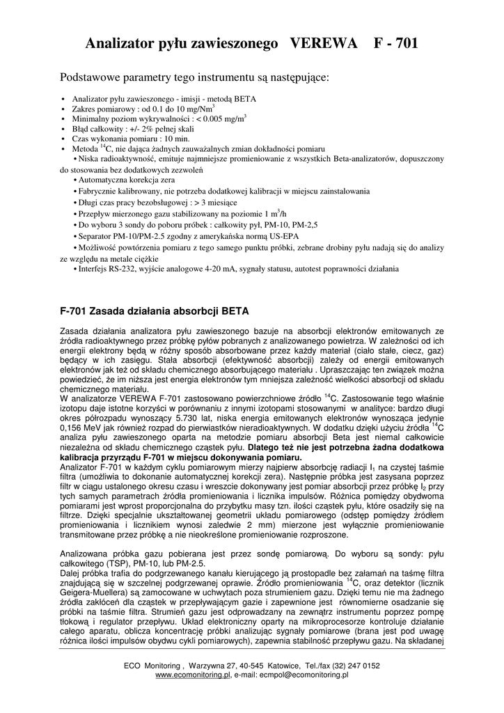 Analizator pyłu zawieszonego VEREWA F - 701 Podstawowe parametry tego instrumentu s nast puj ce: Analizator pyłu zawieszonego - imisji - metod BETA Zakres pomiarowy : od 0.1 do 10 mg/Nm3 Minimalny poziom wykrywalno ci : < 0.005 mg/m3 Bł d całkowity : +/- 2% pełnej skali Czas wykonania pomiaru : 10 min. Metoda 14C, nie daj ca adnych zauwa alnych zmian dokładno ci pomiaru Niska radioaktywno , emituje najmniejsze promieniowanie z wszystkich Beta-analizatorów, dopuszczony do stosowania bez dodatkowych zezwole Automatyczna korekcja zera Fabrycznie kalibrowany, nie potrzeba dodatkowej kalibracji w miejscu zainstalowania Długi czas pracy bezobsługowej : > 3 miesi ce Przepływ mierzonego gazu stabilizowany na poziomie 1 m3/h Do wyboru 3 sondy do poboru próbek : całkowity pył, PM-10, PM-2,5 Separator PM-10/PM-2.5 zgodny z ameryka ska norm US-EPA Mo liwo powtórzenia pomiaru z tego samego punktu próbki, zebrane drobiny pyłu nadaj si do analizy ze wzgl du na metale ci kie Interfejs RS-232, wyj cie analogowe 4-20 mA, sygnały statusu, autotest poprawno ci działania F-701 Zasada działania absorbcji BETA Zasada działania analizatora pyłu zawieszonego bazuje na absorbcji elektronów emitowanych ze ródła radioaktywnego przez próbk pyłów pobranych z analizowanego powietrza. W zale no ci od ich energii elektrony b d w ró ny sposób absorbowane przez ka dy materiał (ciało stałe, ciecz, gaz) b d cy w ich zasi gu. Stała absorbcji (efektywno absorbcji) zale y od energii emitowanych elektronów jak te od składu chemicznego absorbuj cego materiału . Upraszczaj c ten zwi zek mo na powiedzie , e im ni sza jest energia elektronów tym mniejsza zale no wielko ci absorbcji od składu chemicznego materiału. 14 W analizatorze VEREWA F-701 zastosowano powierzchniowe ródło C. Zastosowanie tego wła nie izotopu daje istotne korzy ci w porównaniu z innymi izotopami stosowanymi w analityce: bardzo długi okres półrozpadu wynosz cy 5.730 lat, niska energia emitowanych elektronów wynosz ca jedynie 14 0,156 MeV jak równie rozpad do pierwiastków nieradioaktywnych. W dodatku dzi ki u yciu ródła C analiza pyłu zawieszonego oparta na metodzie pomiaru absorbcji Beta jest niemal całkowicie niezale na od składu chemicznego cz stek pyłu. Dlatego te nie jest potrzebna adna dodatkowa kalibracja przyrz du F-701 w miejscu dokonywania pomiaru. Analizator F-701 w ka dym cyklu pomiarowym mierzy najpierw absorbcj radiacji I1 na czystej ta mie filtra (umo liwia to dokonanie automatycznej korekcji zera). Nast pnie próbka jest zasysana poprzez filtr w ci gu ustalonego okresu czasu i wreszcie dokonywany jest pomiar absorbcji przez próbk I2 przy tych samych parametrach ródła promieniowania i licznika impulsów. Ró nica pomi dzy obydwoma pomiarami jest wprost proporcjonalna do przybytku masy tzn. ilo ci cz stek pyłu, które osadziły si na filtrze. Dzi ki specjalnie ukształtowanej geometrii układu pomiarowego (odst p pomi dzy ródłem promieniowania i licznikiem wynosi zaledwie 2 mm) mierzone jest wył cznie promieniowanie transmitowane przez próbk a nie nieokre lone promieniowanie rozproszone. Analizowana próbka gazu pobierana jest przez sond pomiarow . Do wyboru s sondy: pyłu całkowitego (TSP), PM-10, lub PM-2.5. Dalej próbka trafia do podgrzewanego kanału kieruj cego j prostopadle bez załama na ta m filtra 14 znajduj c si w szczelnej podgrzewanej oprawie. ródło promieniowania C, oraz detektor (licznik Geigera-Muellera) s zamocowane w uchwytach poza strumieniem gazu. Dzi ki temu nie ma adnego ródła zakłóce dla cz stek w przepływaj cym gazie i zapewnione jest równomierne osadzanie si próbki na ta mie filtra. Strumie gazu jest odprowadzany na zewn trz instrumentu poprzez pomp tłokow i regulator przepływu. Układ elektroniczny oparty na mikroprocesorze kontroluje działanie całego aparatu, oblicza koncentracj próbki analizuj c sygnały pomiarowe (brana jest pod uwag ró nica ilo ci impulsów obydwu cykli pomiarowych), zapewnia stabilno przepływu gazu. Na składanej ECO Monitoring , Warzywna 27, 40-545 Katowice, Tel./fax (32) 247 0152 www.ecomonitoring.pl, e-mail: [email protected] Analizator pyłu zawieszonego VEREWA F - 701 płycie czołowej obudowy aparatu (obudowa kombinowana - biurkowa z wykorzystaniem paneli 19calowych) umieszczony jest cyfrowy wy wietlacz, klawiatura do zadawania parametrów pracy analizatora oraz zielona/czerwona lampka (dioda LED) - OK/nieOK. Za płyta czołow znajduj si podzespoły, które wymagaj regularnego nadzoru (role z ta m filtra). Pompa tłokowa znajduje si równie wewn trz obudowy analizatora. Wyposa ona jest ona w silnik liniowy zapewniaj cy zminimalizowanie wibracji i cich prac aparatu. Dane Techniczne analizatora pyłu zawieszonego VEREWA F-701 3 Zakres pomiarowy do wyboru pomi dzy 0-0.1 i 0-10 mg/m 3 Dolna granica wykrywalno ci < 0.005 mg/m Dopuszczalny bł d pomiarowy< +/- 2% zakresu pomiarowego Zale no temperaturowa o punktu zerowego < 1%/10 zmiany temperatury o Zale no temperaturowa czuło ci analizatora < 1%/10 zmiany temperatury Dryft czasowy punktu zerowego < +/- 1% na tydzie (automatyczna korekcja zera) Zale no od napi cia zasilania < 2%/10% Zmiany napi cia Dyspozycyjno przyrz du > 95% Czas rozruchu 10 minut Okres mi dzyobsługowy > 3 miesi ce Zasilanie 230V/50Hz, +10%, -15% 110V/60Hz, +10%, -15% Pobór mocy ca. 0.7 kVA, @ 230V o o Dopuszczalna temperatura pracy0 C do 50 C Wyj cia pomiarowe 0/4-20mA, RS-232 14 ródło promieniowania Powierzchniowe ródło C, zamkni te Okres półrozpadu ródła 5 730 lat Całkowita radioaktywno < 500 kBq (< 13.5 µCi) Detektor Licznik Geigera-Muellera Materiałfiltra Włókno szklane 99.95% > 0.3 µm o Komora filtra 25-80 C, termostatowana, zadawane pre-kondycjonowanie filtra 2 Powierzchnia filtra 0.79 cm Posuw filtra 36 mm na punkt pomiarowy Długo ta my filtra 30m, 45m 3 Przepływ gazu 1 m /h +/- 5% (regulowany kontrolerem przepł.) Cykl pomiarowy zadawany pomi dzy 15min - 24h Operacja (tam/z po