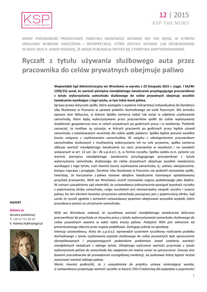 12 | 2015 KSP TAX NEWS MAMY PRZYJEMNOŚĆ PRZEDSTAWIĆ PAŃSTWU NAJNOWSZE WYDANIE KSP TAX NEWS, W KTÓRYM OPISUJEMY WYBRANE ORZECZENIA I INTERPRETACJE, KTÓRE ZOSTAŁY WYDANE LUB OPUBLIKOWANE W MAJU 2015 R. MAMY NADZIEJĘ, ŻE NASZA PUBLIKACJA SPOTKA SIĘ Z PAŃSTWA ZAINTERESOWANIEM. Ryczałt z tytułu używania służbowego auta przez pracownika do celów prywatnych obejmuje paliwo EKSPERT Elżbieta Lis doradca podatkowy T: +48 32 731 68 58 E: [email protected] Wojewódzki Sąd Administracyjny we Wrocławiu w wyroku z 23 listopada 2015 r. (sygn. I SA/Wr 1595/15) uznał, że wartość pieniężna nieodpłatnego świadczenia przysługującego pracownikowi z tytułu wykorzystania samochodu służbowego do celów prywatnych obejmuje wszelkie świadczenia wynikające z tego tytułu, w tym także koszt paliwa. Sprawa prawa dotyczyła spółki, która wystąpiła o wydanie interpretacji indywidualnej do Dyrektora Izby Skarbowej w Poznaniu w sprawie podatku dochodowego od osób fizycznych. We wniosku opisano stan faktyczny, w którym Spółka zamierza nabyć lub wziąć w odpłatne użytkowanie samochody, które będą wykorzystywane przez pracowników spółki do celów wykonywanej działalności gospodarczej oraz w celach prywatnych po godzinach pracy i w weekendy. Podatnik zaznaczył, że możliwe są sytuacje, w których pracownik po godzinach pracy będzie używał samochodu z zatankowanym wcześniej dla celów spółki paliwem. Spółka będzie ponosić wszelkie koszty związane z użytkowaniem samochodów. W związku z udostępnieniem pracownikom samochodów służbowych z możliwością wykorzystania ich na cele prywatne, spółka zamierza obliczać wartość nieodpłatnego świadczenia na rzecz pracownika w wysokości i na zasadach wskazanych w art. 12 ust. 2a i 2b u.p.d.o.f., tj. w formie ryczałtu. Spółka zadała m.in. pytanie czy wartość pieniężna nieodpłatnego świadczenia przysługującego pracownikowi z tytułu wykorzystania samochodu służbowego do celów prywatnych obejmuje wszelkie świadczenia wynikające z tego tytułu, czyli również koszty użytkowania samochodu, tj.: paliwo, ubezpieczenie, bieżące naprawy i przeglądy. Dyrektor Izby Skarbowej w Poznaniu nie podzielił stanowiska spółki, twierdząc, że korzystanie z paliwa stanowi odrębne świadczenie stanowiące opodatkowany przychód pracownika. WSA we Wrocławiu ocenił stanowisko organu podatkowego jako błędne. W ustnym uzasadnieniu sąd stwierdził, że ustawodawca jednoznacznie powiązał wysokość ryczałtu z pojemnością silnika samochodu, czego rezultatem jest nierozerwalny związek ryczałtu i zużycia paliwa, bo ten element kosztów utrzymania samochodu powiązany jest z pojemnością silnika. Sąd uznał, że ryczałt zgodnie z zamiarem ustawodawcy powinien obejmować wszystkie wydatki, które pracodawca ponosi na utrzymanie samochodu. WSA we Wrocławiu wskazał, że ryczałtowa wartość nieodpłatnego świadczenia doliczana pracownikowi do przychodu ze stosunku pracy z tytułu wykorzystywania samochodu służbowego do celów prywatnych zawiera w sobie także koszty paliwa. Podejście WSA jest odmienne od prezentowanego obecnie przez organy podatkowe. Zasługuje jednak na aprobatę. Intencją ustawodawcy, który do u.p.d.o.f. wprowadził systemem ryczałtowy rozliczania podatku dochodowego z tytułu użytkowania pojazdu służbowego do celów prywatnych było uproszczenie skomplikowanych i przysparzających podatnikom problemów zasad ustalania wartości nieodpłatnych świadczeń z takiego tytułu. Odrębnego wyliczania wartości przychodu z tytułu wykorzystania paliwa do samochodu bez wątpienia nie można uznać za uproszczenie. Zmusza ono bowiem pracodawców do prowadzenia szczegółowej ewidencji, na podstawie której będzie można oszacować wartość takiego paliwa. Warto również podkreślić, że z uzasadnienia do projektu ustawy zmieniającej wynika, iż ustawodawca proponując wartość ryczałtu w kwocie 250 zł (właściwą dla pojazdów o pojemności 1 12 | 2015 KSP TAX NEWS 3 silnika nieprzekraczającej 1600 cm ) założył uśrednioną ilość kilometrów dla celów prywatnych na poziomie 300 km na miesiąc. Ta wartość została przemnożona przez stawkę za 1 kilometr przebiegu 3 pojazdu o pojemności skokowej silnika powyżej 900 cm , o której mowa w rozporządzeniu Ministra Infrastruktury w sprawie warunków ustalania oraz sposobu dokonywania zwrotu kosztów używania do celów służbowych samochodów osobowych, motocykli i motorowerów niebędących własnością pracodawcy z dnia 25 marca 2002 r. (Dz. U. Nr 27, poz. 271). Bez cienia wątpliwości można stwierdzić, że stawka z rozporządzenia (0,8358 zł) obejmuje również koszty paliwa. Zasadne jest zatem wnioskowanie, że ustalony w oparciu o powyższą stawkę ryczałt powinien uwzględniać koszty paliwa. Komentowany wyrok jest bardzo korzystny dla podatników i stanowi precedens. Należy mieć nadzieję, że takie stanowisko się upowszechni. Podatek VAT Wojewódzki Sąd Administracyjny w wyroku z dnia 5 listopada 2015 r. (I SA/Wr 1506/15) określił przesłanki wystawienia faktury korygującej z tytułu udzielonego skonta. W momencie dokonywania dostawy towarów (wystawienia faktury) sprzedawca nie udziela rabatu, jedynie informuje o możliwości skorzystania z niego. Po otrzymaniu zapłaty w wyznaczonym terminie (uprawniającym kontrahenta do skorzystania ze skonta), zgodnie z art. 106j ust. 1 pkt 1 u.p.t.u., należy wystawić fakturę korygującą, zmniejszającą podstawę opodatkowania o wartość udzielonego skonta – w celu wykazania rzeczywistych kwot związanych z daną dostawą towarów. Przyznanie skonta uzależnione jest bowiem od zachowania nabywcy towarów po otrzymaniu przez niego faktury. Dyrektor Izby Skarbowej w Łodzi w interpretacji indywidualnej z dnia 3 listopada 2015 r. (IPTPP2/4512-448/15-4/JSz) stwierdził, że oświadczenie spedytora nie może być uznane za dokument, o którym mo