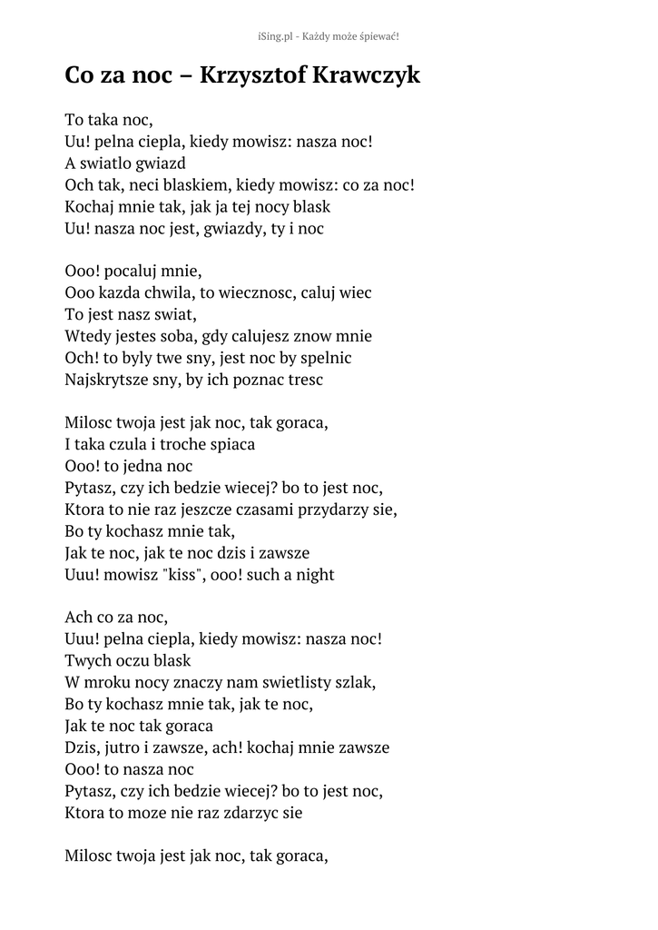 iSing.pl - Każdy może śpiewać! Co za noc – Krzysztof Krawczyk To taka noc, Uu! pelna ciepla, kiedy mowisz: nasza noc! A swiatlo gwiazd Och tak, neci blaskiem, kiedy mowisz: co za noc! Kochaj mnie tak, jak ja tej nocy blask Uu! nasza noc jest, gwiazdy, ty i noc Ooo! pocaluj mnie, Ooo kazda chwila, to wiecznosc, caluj wiec To jest nasz swiat, Wtedy jestes soba, gdy calujesz znow mnie Och! to byly twe sny, jest noc by spelnic Najskrytsze sny, by ich poznac tresc Milosc twoja jest jak noc, tak goraca, I taka czula i troche spiaca Ooo! to jedna noc Pytasz, czy ich bedzie wiecej? bo to jest noc, Ktora to nie raz jeszcze czasami przydarzy sie, Bo ty kochasz mnie tak, Jak te noc, jak te noc dzis i zawsze Uuu! mowisz "kiss", ooo! such a night Ach co za noc, Uuu! pelna ciepla, kiedy mowisz: nasza noc! Twych oczu blask W mroku nocy znaczy nam swietlisty szlak, Bo ty kochasz mnie tak, jak te noc, Jak te noc tak goraca Dzis, jutro i zawsze, ach! kochaj mnie zawsze Ooo! to nasza noc Pytasz, czy ich bedzie wiecej? bo to jest noc, Ktora to moze nie raz zdarzyc sie Milosc twoja jest jak noc, tak goraca, I taka czula i troche spiaca Ooo! pocaluj mnie, Och! ta kazda chwila, to wiecznosc, caluj wiec Kochaj mnie tak, jak tej nocy blask To jest noc, noc, noc, piekna noc, noc, noc Przegnac sen, sen sen, kochac sie po swit Ty i ja i noc jest spelnieniem, gdy Kochasz mnie, jak ja Uuu, aaa, uuu, aaa, uuu, aaa, aaa, aaa, such a night Słowa: brak danych Muzyka: brak danych Rok wydania: brak danych Płyta: brak danych