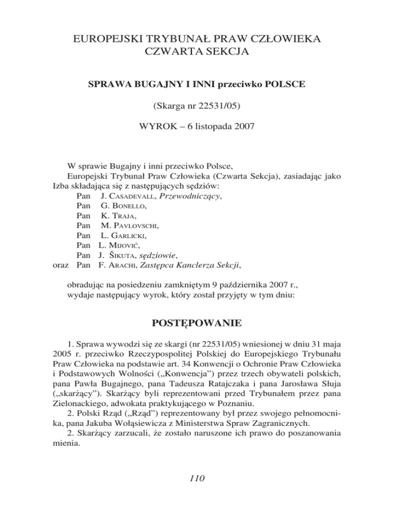 EUROPEJSKI TRYBUNAŁ PRAW CZŁOWIEKA CZWARTA SEKCJA SPRAWA BUGAJNY I INNI przeciwko POLSCE (Skarga nr 22531/05) WYROK – 6 listopada 2007 W sprawie Bugajny i inni przeciwko Polsce, Europejski Trybunał Praw Człowieka (Czwarta Sekcja), zasiadając jako Izba składająca się z następujących sędziów: Pan J. CASADEVALL, Przewodniczący, Pan G. BONELLO, Pan K. TRAJA, Pan M. PAVLOVSCHI, Pan L. GARLICKI, Pan L. MIJOVIĆ, Pan J. ŠIKUTA, sędziowie, oraz Pan F. ARACHI, Zastępca Kanclerza Sekcji, obradując na posiedzeniu zamkniętym 9 października 2007 r., wydaje następujący wyrok, który został przyjęty w tym dniu: POSTĘPOWANIE 1. Sprawa wywodzi się ze skargi (nr 22531/05) wniesionej w dniu 31 maja 2005 r. przeciwko Rzeczypospolitej Polskiej do Europejskiego Trybunału Praw Człowieka na podstawie art. 34 Konwencji o Ochronie Praw Człowieka i Podstawowych Wolności („Konwencja”) przez trzech obywateli polskich, pana Pawła Bugajnego, pana Tadeusza Ratajczaka i pana Jarosława Słuja („skarżący”). Skarżący byli reprezentowani przed Trybunałem przez pana Zielonackiego, adwokata praktykującego w Poznaniu. 2. Polski Rząd („Rząd”) reprezentowany był przez swojego pełnomocnika, pana Jakuba Wołąsiewicza z Ministerstwa Spraw Zagranicznych. 2. Skarżący zarzucali, że zostało naruszone ich prawo do poszanowania mienia. 110 4. W dniu 24 listopada Trybunał zdecydował powiadomić Rząd o wpłynięciu skargi. Zgodnie z postanowieniami art. 29 § 3 Konwencji Trybunał uznał, że sprawa zostanie rozpatrzona w tym samym czasie, zarówno co do meritum, jak i co do dopuszczalności. FAKTY I. OKOLICZNOŚCI SPRAWY 5. Pierwszy skarżący urodził się w 1963 r. Drugi i trzeci urodzili się w 1964 r. Wszyscy trzej mieszkają w Poznaniu. A. Postępowanie przed organami administracyjnymi 6. Spółka „Trust” sp. z o.o., której udziałowcami są wszyscy skarżący, była właścicielem nieruchomości o pow. 6 ha, zlokalizowanej w Poznaniu. W 1995 r. spółka wystąpiła do lokalnych władz administracyjnych o wydanie decyzji w sprawie podziału nieruchomości, która jest niezbędna do prowadzenia prac budowlanych na gruncie. 7. Ostatecznie 15 listopada 1999 r. Urząd Miejski wydał decyzję zezwalającą na podział nieruchomości. Niektóre działki zostały przeznaczone na cele budowlane, a inne na otwartą przestrzeń lub garaże. Kilka działek zostało przeznaczonych pod tzw. drogi wewnętrzne. Decyzja stała się ostateczna 30 listopada 1999 r. 8. Następnie spółka, powołując się na przepisy ustawy z dnia 21 sierpnia 1997 r. o gospodarce nieruchomościami, zażądała od Prezydenta Miasta określenia wysokości odszkodowania za działki zajęte pod drogi. Skarżący argumentowali, że zgodnie z odnośnymi przepisami ustawy działki zajęte pod drogi, na mocy decyzji o podziale nieruchomości, podlegały wywłaszczeniu z mocy prawa w dniu, w którym decyzja o podziale stawała się ostateczna. 9. Decyzją z 15 marca 2000 r. Prezydent Miasta Poznania odmówił przyznania odszkodowania, argumentując, że drogi, które mają powstać na przedmiotowych działkach nie zostały ujęte w miejscowym planie zagospodarowania przestrzennego. Stąd, w decyzji z listopada 1999 r., działki te zostały oznaczone jako tzw. drogi wewnętrzne, mające służyć w przyszłości mieszkańcom osiedla, którego budową miała zająć się spółka skarżących. W związku z faktem, iż przedmiotowe drogi nie zostały uwzględnione w miejscowym planie zagospodarowania przestrzennego, nie należną one do kategorii dróg publicznych. Zgodnie z przepisami ustawy o gospodarce nieruchomościami z 1997 r., po znowelizowaniu w styczniu 2000 r., wywłaszczeniu na mocy prawa podlegają jedynie działki przeznaczone na tzw. drogi publiczne i tylko w odniesieniu do nich może być przyznane odszkodowanie. W sprawie skarżących badane działki były przeznaczone pod drogi 111 wewnętrzne, w związku z powyższym nie podlegały wywłaszczeniu i w konsekwencji nie należało się za nie odszkodowanie. 10. Skarżący odwołali się od decyzji. Podnieśli, że drogi, które mają zostać zbudowane na osiedlu miały, z praktycznego punktu widzenia, spełniać rolę publicznych. Miały służyć wszystkim użytkownikom, w tym również środkom miejskiego i prywatnego transportu. Pojęcie „dróg wewnętrznych” użyte w treści zaskarżonej decyzji nie istniało w ustawie o gospodarce gruntami z 1997 r., w wersji obowiązującej w listopadzie 1999 r. Owa ustawa została znowelizowana po tym, kiedy przedmiotowa decyzja została wydana i dopiero w nowym brzmieniu jasno stwierdzała, iż wypłata odszkodowania należy się za drogi „publiczne” (patrz paragraf 30 i 31 poniżej). 11. Fakt przypisania w decyzji z listopada 1999 r. przedmiotowym drogom charakteru „wewnętrznego” był bezprawną próbą odebrania im statusu dróg publicznych i tym samym wyłączenia ich spod właściwości ustawy ustalającej wywłaszczenie z mocy prawa działek przeznaczonych pod drogi. Co istotniejsze, była to próba uchylenia się od obowiązku wypłat odszkodowania za przedmiotowe działki. 12. Skarżący uzasadniali dalej, że fakt, iż drogi nie zostały ujęte w miejscowym planie zagospodarowania przestrzennego nie jest istotny, zważywszy, że decyzja (podziałowa) z 15 listopada 1999 r. musiała być zgodna z założeniami miejscowego planu zagospodarowania przestrzennego. W odwrotnej sytuacji zgoda na podział nieruchomości nie zostałaby wydana. 13. Skarżący podnieśli na końcu, że zaskarżona decyzja narusza chronione konstytucyjnie gwarancje prawa własności. 14. Dnia 31 maja 2000 r. Wojewoda Wielkopolski podtrzymał decyzję. Wojewoda odniósł się do przepisów art. 98 ustawy z 1997 r. w brzmieniu, w którym miała zastosowanie do decyzji z listopada 1999 r. Ustawa określa, że działki przeznaczone pod drogi na podstawie decyzji podziałowych podlegają wywłaszczeniu ex lege w dacie, 