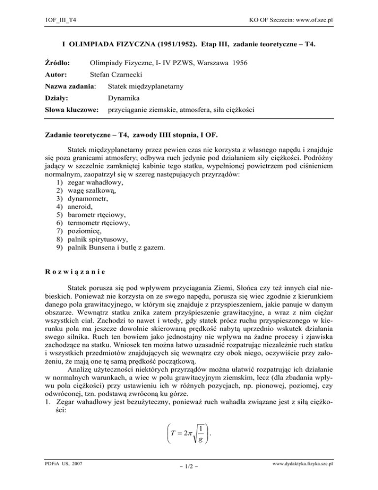 1OF_III_T4 KO OF Szczecin: www.of.szc.pl I OLIMPIADA FIZYCZNA (1951/1952). Etap III, zadanie teoretyczne – T4. Źródło: Olimpiady Fizyczne, I- IV PZWS, Warszawa 1956 Autor: Stefan Czarnecki Nazwa zadania: Statek międzyplanetarny Działy: Dynamika Słowa kluczowe: przyciąganie ziemskie, atmosfera, siła ciężkości Zadanie teoretyczne – T4, zawody IIII stopnia, I OF. Statek międzyplanetarny przez pewien czas nie korzysta z własnego napędu i znajduje się poza granicami atmosfery; odbywa ruch jedynie pod działaniem siły ciężkości. Podróżny jadący w szczelnie zamkniętej kabinie tego statku, wypełnionej powietrzem pod ciśnieniem normalnym, zaopatrzył się w szereg następujących przyrządów: 1) zegar wahadłowy, 2) wagę szalkową, 3) dynamometr, 4) aneroid, 5) barometr rtęciowy, 6) termometr rtęciowy, 7) poziomicę, 8) palnik spirytusowy, 9) palnik Bunsena i butlę z gazem. Rozwiązanie Statek porusza się pod wpływem przyciągania Ziemi, Słońca czy też innych ciał niebieskich. Ponieważ nie korzysta on ze swego napędu, porusza się wiec zgodnie z kierunkiem danego pola grawitacyjnego, w którym się znajduje z przyspieszeniem, jakie panuje w danym obszarze. Wewnątrz statku znika zatem przyśpieszenie grawitacyjne, a wraz z nim ciężar wszystkich ciał. Zachodzi to nawet i wtedy, gdy statek prócz ruchu przyspieszonego w kierunku pola ma jeszcze dowolnie skierowaną prędkość nabytą uprzednio wskutek działania swego silnika. Ruch ten bowiem jako jednostajny nie wpływa na żadne procesy i zjawiska zachodzące na statku. Wniosek ten można łatwo uzasadnić rozpatrując niezależnie ruch statku i wszystkich przedmiotów znajdujących się wewnątrz czy obok niego, oczywiście przy założeniu, że mają one tę samą prędkość początkową. Analizę użyteczności niektórych przyrządów można ułatwić rozpatrując ich działanie w normalnych warunkach, a wiec w polu grawitacyjnym ziemskim, lecz (dla zbadania wpływu pola ciężkości) przy ustawieniu ich w różnych pozycjach, np. pionowej, poziomej, czy odwróconej, tzn. podstawą zwróconą ku górze. 1. Zegar wahadłowy jest bezużyteczny, ponieważ ruch wahadła związane jest z siłą ciężkości: ⎛ 1⎞ ⎜ T = 2π ⎟. ⎜ ⎟ g ⎝ ⎠ PDFiA US, 2007 - 1/2 - www.dydaktyka.fizyka.szc.pl 1OF_III_T4 KO OF Szczecin: www.of.szc.pl 2. Waga szalkowa służy do wyznaczania masy, jest jednak bezużyteczna, ponieważ o równości mas sądzimy na podstawie równości ciężaru. 3. Wobec zaniku ciężaru ciał dynamometr ma ograniczone zastosowanie, może być jedynie użyty do mierzenia sił występujących wewnątrz statku, np. sił sprężystości, siły mięśni itp. 4. Działanie aneroidu nie ulega zakłóceniu, ponieważ opiera się ono na wykorzystaniu sprężystości. 5. Barometr rtęciowy jest bezużyteczny. Rtęć tracąc ciężar nie może równoważyć ciśnienia powietrza. Słupek rtęci zostanie dociśnięty do końca rurki barometrycznej. 6. Wskazania termometru rtęciowego są niezakłócone. Oczywistym tego dowodem jest działanie przyrządu w każdej pozycji. 7. Poziomica, której działanie polega na zjawisku ustawiania się zwierciadła cieczy normalnie do kierunku pola grawitacyjnego, jest tutaj oczywiście bezwartościowa. 8. Palenie się palnika spirytusowego jest uzależnione od prądów konwekcyjnych. Brak grawitacji sprawia, że ogrzany gaz traci swój ciężar na równi z gazem chłodnym, w skutek czego z konwekcją podtrzymująca dopływ powietrza bogatszego w tlen zanika. Ponieważ tlenu na drodze dyfuzji jest zbyt powolny, przeto płomień „zadusi się” własnymi spalinami. 9. W palniku Bunsena powietrze jest ssane przez wypływający gaz, palnik ten zatem nie straci w naszych warunkach swojej użyteczności. Można przekonać się o tym nawet w warunkach normalnych kierując płomień palnika bunsenowskiego np. pionowo w dół. Na pytania zawarte w zadaniu większość uczestników odpowiedziała poprawnie, 59% uzyskało oceny nie mniejsze niż 5 punktów. Wyraźnie złe odpowiedzi dało 23% zawodników. Średnia ocen wyniosła 5,5 punktu. Jeden z uczestników proponuje pomysłowy sposób przywrócenia użyteczności niektórych przyrządów. Polega ono na wprawieniu statku w ruch obrotowy dokoła własnej osi. Istotnie, przy dobranej odpowiednio prędkości kątowej, siła reakcji bezwładnej odśrodkowej zastąpić by mogła w pewnym stopniu siły przyciągania. Wartość siły odśrodkowej jest jednak związana z odległością od osi obrotu. Każda więc część poszczególnych przyrządów byłaby pod działaniem innej siły, wskutek czego o jakichkolwiek pomiarach nie mogłoby być mowy. powolny dopływ Proponowana punktacja Część teoretyczna Wyznaczenie parametru Pomiar zależności Wyznaczenie wartości Poprawny wynik końcowy wraz z analizą błędu pomiarowego PDFiA US, 2007 - 2/2 - do 2pkt. do 4pkt. do 2pkt. do 2pkt. www.dydaktyka.fizyka.szc.pl