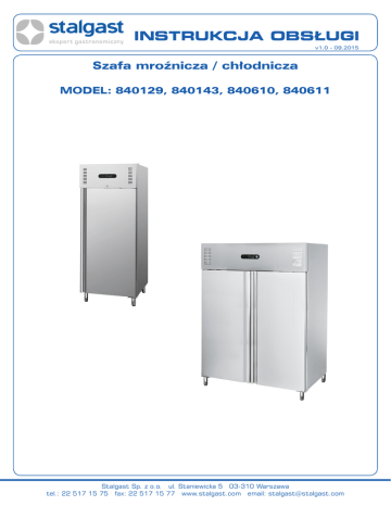 INSTRUKCJA OBSŁUGI v1.0 - 09.2015 Szafa mroźnicza / chłodnicza MODEL: 840129, 840143, 840610, 840611 Stalgast Sp. z o.o. ul. Staniewicka 5 03-310 Warszawa tel.: 22 517 15 75 fax: 22 517 15 77 www.stalgast.com email: [email protected] SPIS TREŚCI 1. INSTRUKCJE BEZPIECZEŃSTWA.............................................................................................................................................3 2. PRZEZNACZENIE URZĄDZENIA.............................................................................................................................................3 3. PANEL STEROWANIA.......................................................................................................................................................................3 3.1. Jak wyświetlić wartość punktu nastawy...................................................................................................................................4 3.2. Jak zmienić punkt nastawy...........................................................................................................................................................4 3.3. Jak uruchomić ręczne odszranianie..........................................................................................................................................5 3.4. Jak zmienić wartość parametru..................................................................................................................................................5 3.5. Blokowanie klawiatury...................................................................................................................................................................5 3.6. Odblokowanie klawiatury.............................................................................................................................................................5 4. SYGNALIZACJA ALARMU.............................................................................................................................................................5 5. DANE TECHNICZNE ........................................................................................................................................................................5 6. MONTAŻ...................................................................................................................................................................................................6 6.1. Transport i magazynowanie.........................................................................................................................................................6 6.2. Podłączenia do źródła zasilania..................................................................................................................................................6 6.3. Uwaga...................................................................................................................................................................................................6 7. DODATKOWE INFORMACJE........................................................................................................................................................6 7.1. Przechowywanie żywności............................................................................................................................................................6 7.2. Hałas i wibracje.................................................................................................................................................................................8 8. CZYSZCZENIE I KONSERWACJA..............................................................................................................................................8 8.1. Czyszczenie.........................................................................................................................................................................................8 8.2. Okresowe czyszczenie komory oraz skraplacza..................................................................................................................8 8.3. Urządzenie w stanie spoczynku.................................................................................................................................................9 9. PROBLEMY, PRZYCZYNY, ROZWIĄZANIA.......................................................................................................................9 10.USUWANIE ZUŻYTYCH URZĄDZEŃ....................................................................................................................................9 11.GWARANCJA..........................................................................................................................................................................................9 -2- Dziękujemy Państwu za zakup naszego produktu. Przed pierwszym użyciem prosimy dokładnie zapoznać się z niniejszą instrukcją obsługi. Kopiowanie niniejszej instrukcji bez zgody producenta jest zabronione. Zdjęcia oraz rysunki mają charakter poglądowy i mogą różnić się od zakupionego urządzenia. UWAGA: Instrukcję należy przechowywać w bezpiecznym oraz dostępnym dla personelu miejscu. Producent zastrzega sobie prawo do zmiany parametrów technicznych urządzeń bez zapowiedzi. 1. INSTRUKCJE BEZPIECZEŃSTWA •• Nieprawidłowa obsługa i niewłaściwe użytkowanie może spowodować poważne uszkodzenie urządzenia lub zranienie osób. •• Urządzenie może być stosowane wyłącznie w celu, do którego zostało zaprojektowane. •• Producent nie ponosi żadnej odpowiedzialności za szkody spowodowane nieprawidłową obsługą i niewłaściwym użytkowaniem urządzenia. •• W czasie użytkowania zabezpiecz urządzenie i wtyczkę kabla zasilającego przed kontaktem z wodą lub innymi płynami. W przypadku, gdyby przez nieuwagę urządzenie wpadło do wody, należy natychmiast wyciągnąć wtycz