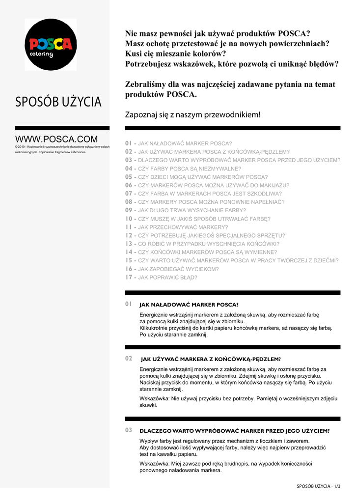 Nie masz pewności jak używać produktów POSCA? Masz ochotę przetestować je na nowych powierzchniach? Kusi cię mieszanie kolorów? Potrzebujesz wskazówek, które pozwolą ci uniknąć błędów? SPOSÓB UŻYCIA www.POSCA.COM © 2010 – Kopiowanie i rozpowszechnianie dozwolone wyłącznie w celach niekomercyjnych. Kopiowanie fragmentów zabronione. Zebraliśmy dla was najczęściej zadawane pytania na temat produktów POSCA. Zapoznaj się z naszym przewodnikiem! 01 - Jak naładować marker POSCA? 02 - Jak używać markera POSCA z końcówką-pędzlem? 03 - Dlaczego warto wypróbować marker POSCA przed jego użyciem? 04 - Czy farby POSCA są niezmywalne? 05 - Czy dzieci mogą używać markerów POSCA? 06 - Czy markerów POSCA można używać do makijażu? 07 - Czy farba w markerach POSCA jest szkodliwa? 08 - Czy markery POSCA można ponownie napełniać? 09 - Jak długo trwa wysychanie farby? 10 - Czy muszę w jakiś sposób utrwalać farbę? 11 - Jak przechowywać markery? 12 - Czy potrzebuję jakiegoś specjalnego sprzętu? 13 - Co robić w przypadku wyschnięcia końcówki? 14 - Czy końcówki markerów POSCA są wymienne? 15 - Czy warto używać markerów POSCA w pracy twórczej z dziećmi? 16 - Jak zapobiegać wyciekom? 17 - Jak poprawić błąd? 01 Jak naładować marker POSCA? Energicznie wstrząśnij markerem z założoną skuwką, aby rozmieszać farbę za pomocą kulki znajdującej się w zbiorniku. Kilkukrotnie przyciśnij do kartki papieru końcówkę markera, aż nasączy się farbą. Po użyciu starannie zamknij. 02 Jak używać markera z końcówką-pędzlem? Energicznie wstrząśnij markerem z założoną skuwką, aby rozmieszać farbę za pomocą kulki znajdującej się w zbiorniku. Zdejmij skuwkę i osłonę przycisku. Naciskaj przycisk do momentu, w którym końcówka nasączy się farbą. Po użyciu starannie zamknij. Wskazówka: Nie używaj przycisku bez potrzeby. Pamiętaj o wcześniejszym zdjęciu skuwki. 03 Dlaczego warto wypróbować marker przed jego użyciem? Wypływ farby jest regulowany przez mechanizm z tłoczkiem i zaworem. Aby dostosować ilość wypływającej farby, należy więc najpierw przeprowadzić test na kawałku papieru. Wskazówka: Miej zawsze pod ręką brudnopis, na wypadek konieczności ponownego naładowania markera. SPOSÓB UŻYCIA - 1/3 04 Czy farby POSCA są niezmywalne? Markery POSCA zawierają farbę na bazie wody i trwałego pigmentu odpowiednią do każdej powierzchni. Na porowatych powierzchniach farba jest niezmywalna. Nie przesiąka przez papier. Z kolei nałożona na szkło jest zmywalna. Wskazówka: Przetestowaliśmy odporność farby POSCA na ponad 50 powierzchniach. Aby dowiedzieć się więcej, przejdź do sekcji „powierzchnie”. SPOSÓB UŻYCIA 05 Czy dzieci mogą używać markerów POSCA? Markery POSCA zawierają bezzapachową i bezpieczną dla najmłodszych farbę na bazie wody, jednak ze względu na specyficzny sposób użytkowania polecamy je dzieciom powyżej 5. roku życia. www.POSCA.COM Wskazówka: W przypadku zgubienia skuwki i wyschnięcia końcówki istnieje możliwość jej wymiany (patrz: „Co robić w przypadku wyschnięcia końcówki?”). Praktyczne rozwiązanie dla małych lekkoduchów! © 2010 – Kopiowanie i rozpowszechnianie dozwolone wyłącznie w celach niekomercyjnych. Kopiowanie fragmentów zabronione. 06 Czy markerów POSCA można używać do makijażu? Farba POSCA bardzo dobrze zmywa się ze skóry i nie jest w żaden sposób niebezpieczna, nie spełnia jednak wymogów stawianych produktom kosmetycznym. Producent nie ponosi więc odpowiedzialności za ewentualne niepożądane reakcje skórne wynikające z użycia farby POSCA. Wskazówka: Farbę można łatwo zmyć ze skóry za pomocą wody z mydłem. 07 Czy farba w markerach POSCA jest szkodliwa? Markery POSCA zawierają bezzapachową i pozbawioną rozpuszczalników farbę na bazie wody. Pszczelarze używają ich do oznaczania królowych w ulach! Do każdego roku przypisany jest inny kolor, co umożliwia określenie wieku owada... 08 Czy markery POSCA można ponownie napełniać? POSCA nie prowadzi sprzedaży farb w opakowaniach uzupełniających. Niektórzy użytkownicy przelewają farby z jednego markera do drugiego, zazwyczaj celem wymieszania kolorów. Warto jednak wiedzieć, że taka możliwość nie została przewidziana przez producenta. Wskazówka: Zapoznaj się również z radą „Jak mieszać kolory?”. 09 Jak długo trwa wysychanie farby? Farba schnie bardzo szybko. Ogólnie rzecz ujmując, wysychanie na powierzchniach porowatych trwa krócej niż na gładkich, ale nie zajmuje to więcej niż kilka minut. 10 Czy muszę w jakiś sposób utrwalać farbę? Na porowatych powierzchniach farba POSCA jest niezmywalna, można ją jednak dodatkowo utrwalić. W zależności od użytej powierzchni istnieją trzy możliwości: pokrycie werniksem (patrz: „magnesy na lodówkę z masy solnej” w warsztacie kreatywnym), wypalanie w piekarniku (w przypadku ceramiki itp.) oraz wyprasowanie (patrz: „ekotorba” w warsztacie kreatywnym). Wskazówka: Wszelkie informacje znajdziesz w sekcji „powierzchnie”. SPOSÓB UŻYCIA - 2/3 11 Jak przechowywać markery? Markery POSCA można przechowywać w dowolnej pozycji. Kulka znajdująca się w pojemniku umożliwia rozmieszanie farby, która jest doskonale zabezpieczona wewnątrz obudowy markera. Markery POSCA z końcówką-pędzlem dobrze jest przechowywać w poziomie. 12 Żadnych pędzli, wody i ściereczek – POSCA umożliwia precyzyjne malowanie bez bałaganu i nie wymaga żadnego sprzętu ani szczególnego zachodu. SPOSÓB UŻYCIA www.POSCA.COM Czy potrzebuję jakiegoś specjalnego sprzętu? 13 Co robić w przypadku wyschnięcia końcówki? Zdarzyło ci się gdzieś zapodziać skuwkę, wskutek czego końcówka wyschła? Spokojnie! Dzięki zastosowaniu pompki i zaworu końcówkę można ponownie nasączyć farbą. © 2010 – Kopiowanie i rozpowszechnianie dozwolone wyłącznie w celach niekome