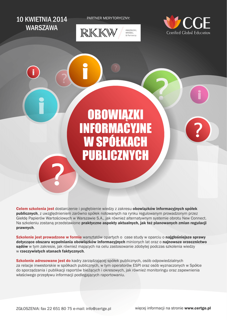 10 KWIETNIA 2014 WARSZAWA i i ? i ? PARTNER MERYTORYCZNY: i ? OBOWIĄZKI INFORMACYJNE W SPÓŁKACH PUBLICZNYCH ? i i ? Celem szkolenia jest dostarczenie i pogłębienie wiedzy z zakresu obowiązków informacyjnych spółek publicznych, z uwzględnieniem zarówno spółek notowanych na rynku regulowanym prowadzonym przez Giełdę Papierów Wartościowych w Warszawie S.A., jak również alternatywnym systemie obrotu New Connect. Na szkoleniu zostaną przedstawione praktyczne aspekty aktualnych, jak też planowanych zmian regulacji prawnych. Szkolenie jest prowadzone w formie warsztatów opartych o case study w oparciu o najgłośniejsze sprawy dotyczące obszaru wypełniania obowiązków informacyjnych minionych lat oraz o najnowsze orzecznictwo sądów w tym zakresie, jak również mających na celu zastosowanie zdobytej podczas szkolenia wiedzy w rzeczywistych stanach faktycznych. Szkolenie adresowane jest do kadry zarządzającej spółek publicznych, osób odpowiedzialnych za relacje inwestorskie w spółkach publicznych, w tym operatorów ESPI oraz osób wyznaczonych w Spółce do sporządzania i publikacji raportów bieżących i okresowych, jak również monitoringu oraz zapewnienia właściwego przepływu informacji podlegających raportowaniu. ZGŁOSZENIA: fax 22 651 80 75 e-mail: [email protected] więcej informacji na stronie www.certge.pl ? ? i i ? i ? OBOWIĄZKI INFORMACYJNE W SPÓŁKACH PUBLICZNYCH i ? i ? PROGRAM SZKOLENIA: 9.00 REJESTRACJA UCZESTNIKÓW 9.30 POSZUKUJĄC ŹRÓDEŁ OBOWIĄZKÓW INFORMACYJNYCH, CZYLI NADZÓR KORPORACYJNY W SPÓŁKACH AKCYJNYCH NA TLE ZASADY RÓWNEGO TRAKTOWANIA AKCJONARIUSZY. NAJGŁOŚNIEJSZE SPRAWY DOTYCZĄCE NARUSZEŃ OBOWIĄZKÓW INFORMACYJNYCH W SPÓŁKACH PUBLICZNYCH MINIONYCH LAT 10.15 00OBOWIĄZKI INFORMACYJNE SPÓŁEK PUBLICZNYCH • rola obowiązków informacyjnych • powstanie i wygaśnięcie obowiązków informacyjnych – case study • operator ESPI – konsekwencje błędów – case study 11.00 Przerwa na kawę i herbatę 11.15 INFORMACJE PRZEKAZYWANE PRZEZ SPÓŁKI PUBLICZNE • informacje poufne – kiedy informacja jest informacją poufną – case study na tle najnowszego orzecznictwa – termin przekazywania informacji poufnych, czyli z czym można poczekać – informacja poufna w grupie kapitałowej – jak zorganizować przepływ informacji pomiędzy spółkami – case study – tworzenie i prowadzenie list dostępu – aspekty praktyczne – ochrona informacji poufnych – komu i w jaki sposób można przekazać informację poufną • informacje bieżące – cechy charakterystyczne i podstawa prawna – numerus clausus informacji bieżących – cel wprowadzenia obowiązku przekazywania informacji bieżących oraz termin ich przekazywania – wybrane problemy dotyczące publikacji informacji bieżących • informacje okresowe – rodzaj raportów okresowych i realizowana funkcja ZGŁOSZENIA: fax 22 651 80 75 e-mail: [email protected] 13.00 i – prawdziwość, rzetelność oraz kompletność informacji okresowych – informacja okresowa a informacja poufna – case study • odpowiedzialność za naruszenie obowiązków informacyjnych KWALIFIKACJA DANEJ INFORMACJI JAKO POUFNEJ I PRAWIDŁOWE OKREŚLENIE MOMENTU JEJ PUBLIKACJI – WARSZTATY 13.30 Przerwa na lunch 14.00 OBOWIĄZKI INFORMACYJNE ZWIĄZANE Z POSIADANIEM STATUSU AKCJONARIUSZA LUB CZŁONKA ORGANU SPÓŁKI PUBLICZNEJ • obowiązki informacyjne związane z ujawnieniem stanu posiadania i sankcje z tytułu ich naruszenia • obowiązki wezwaniowe • okresy zamknięte a wykorzystanie informacji poufnej • pułapka pośredniego nabycia akcji • przypadki szczególne: – acting in concert – niebezpieczne pełnomocnictwa 15.00 Przerwa na kawę i herbatę 15.15 INNE OBOWIĄZKI W ZAKRESIE PRZEJRZYSTOŚCI STOSUNKÓW KORPORACYJNYCH W SPÓŁKACH PUBLICZNYCH • coraz bardziej popularny art. 6 § 4 i 5 KSH, czyli pytanie koncentracyjne • rewident ds. szczególnych – przydatne narzędzie czy instrument szantażu? 16.00 DYSKUSJA NA TEMAT PLANOWANYCH ZMIAN PRZEPISÓW 16.30 – 16.45 SESJA PYTAŃ KONTAKT Anna Milewska Kierownik projektu [email protected] tel: 604 152 181 fax: 22 651 80 75 więcej informacji na stronie www.certge.pl ? ? OBOWIĄZKI INFORMACYJNE W SPÓŁKACH PUBLICZNYCH PARTNER MERYTORYCZNY: i ? i i ? ? i ? PROWADZĄCY: i Kancelaria RKKW specjalizuje się w prawie spółek (korporacyjnym), prawie cywilnym (prawie umów), fuzjach i przejęciach (transakcjach M&A ), prawie pracy i kontraktów menedżerskich, prawie rynku kapitałowego, prawie własności intelektualnej, prawie administracyjnym, prawie nieruchomości, prawie podatkowym, prawach pacjenta oraz prawie procesowym.Współpracujemy z polskimi i międzynarodowymi firmami będącymi liderami w swoich branżach. Nasi Klienci wywodzą się z różnych sektorów gospodarki, w tym m.in. z: farmaceutycznego, transportowego (kolejowego, lądowego oraz morskiego), usług finansowych (w tym bankowego i ubezpieczeniowego), energetycznopaliwowego, górniczego, informatycznego, spożywczego, mediów i reklamy, budownictwa, obrotu nieruchomościami i wielu innych. Wyróżnia nas wyjątkowe doświadczenie zdobyte zarówno poprzez wieloletnie świadczenie pomocy prawnej (także w międzynarodowych kancelariach), jak też i w charakterze członków organów spółek kapitałowych (w szczególności rad nadzorczych), wykładowców na krajowych i międzynarodowych seminariach i konferencjach oraz samodzielnych przedsiębiorców. Dzięki temu znakomicie rozumiemy istotę biznesu i identyfikujemy się z Klientami, co pozwala nam wspólnie rozwiązywać ich problemy. Certified Global Education Sp. z o.o. jest firmą szkoleniową od kilku lat obecną na polskim rynku kładącą nacisk na edukację biznesową popartą certyfikatami. Dąży do tego by być platformą szkoleniową udostępniającą klientom najwyższej jakości certyfikowane szkolenia ze wszystkich dziedzin zarówno w rozumieniu funkcjonalnym biorąc 