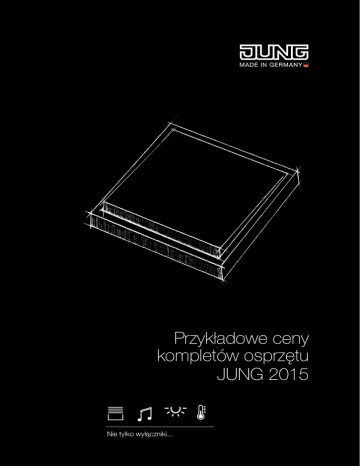 Przykładowe ceny kompletów osprzętu JUNG 2015 Nie tylko wyłączniki... Ceny netto LS Aluminum LS Antracyt ECO Profi AS 500 LS 990 biały, kremowy biały, kremowy biały, kremowy jasnoszary, czarny aluminium, antracyt Włącznik pojedynczy 4,27 € 11,49 € 13,23 € 17,93 € 29,23 € Włącznik podwójny 5,24 € 17,71 € 19,38 € 24,07 € 35,39 € Ściemniacz 22,14 € 58,57 € 59,97 € 64,94 € 85,09 € Gniazdo 3,87 € 10,27 € 11,15 € 17,81 € 29,09 € Nowość ! Zdalny dostęp do domu CD 500 CD Plus Jung Smart Radio biały, kremowy szary, czarny jasnoszary, brązowy platyna, złoto-brązowy biały + ramka złoto Włącznik pojedynczy 13,25 € 17,11 € 17,93 € 25,17 € 28,06 € Włącznik podwójny 19,36 € 24,07 € 24,07 € 31,79 € 34,20 € Ściemniacz 60,17 € 64,94 € 64,94 € 72,56 € 75,07 € Gniazdo 11,20 € 16,06 € 16,06 € 22,86 € 26,19 € JUNG wykorzystuje w produkcji osprzętu elektroinstalacyjnego najlepsze materiały. Zapewnia to odporność na wysoką temperaturę, uszkodzenia mechaniczne, zarysowania oraz neutralność na substancje chemiczne. LS Stal LS Mosiądz LS Mosiądz LS Złoto 24 Karty LS Chrom LS Złoto LS Design stal mosiądz antyczny mosiądz klasyczny aluminium ciemny złoto 24 ct chrom pozłacany biały, kremowy 29,23 € 48,32 € 31,90 € 279,20 € 99,38 € 108,64 € 14,94 € 35,39 € 54,76 € 38,35 € 351,99 € 111,28 € 121,40 € 21,09 € 85,09 € 103,41 € 89,09 € 422,70 € 189,17 € 202,98 € 61,68 € 29,09 € 48,98 € 35,16 € 267,11 € 123,66 € 113,73 € 12,86 € LS Aluminium Ciemny Nowość ! A 500 A Creation biały, czarny aluminium szampański, mokka biały, czarny aluminium szampański, mokka szkło szampański, szkło mokka 14,36 € / 15,04 € 19,95 € 19,95 € 14,36 € / 15,04 € 21,49 € 21,49 € 43,79 € 20,58 € / 21,19 € 26,40 € 26,40 € 20,58 € / 21,19 € 27,94 € 27,94 € 50,24 € 61,44 € / 64,17 € 70,97 € 70,97 € 61,44 € / 64,17 € 72,51 € 72,51 € 94,81 € 13,14 € / 15,53 € 17,21 € 19,96 € 13,14 € / 15,53 € 18,75 € 21,50 € 43,80 € LS Plus Nowość ! Ramki LSP są kompatybilne z serią LS 990. aluminium ciemny jasnoszary, czarny mosiądz antyczny, mosiądz klasyczny aluminium, stal, antracyt stal, aluminium ANT+GLAS, ANT+GLWW, ANT+GLSW, ANT+GCR, AL+GCR 34,31 € 19,81 € 55,20 € 31,39 € 46,58 € 46,58 € 96,73 € 40,76 € 25,95 € 61,64 € 37,55 € 52,74 € 52,74 € 102,89 € 91,50 € 66,82 € 110,29 € 87,25 € 102,44 € 102,44 € 152,59 € 37,57 € 19,69 € 55,86 € 31,25 € 46,44 € 46,44 € 96,59 € A plus SL 500 Nowość ! A Creation Szkło matowy antracyt szkło biały szkło biały szkło aluminium szkło aluminium 13 rodzajów biały, brązowy, czarny 15,51 39,27 € 39,27 € 43,79 € 43,79 € 21,20 € 26,04 € 14,07 45,49 € 45,49 € 50,24 € 50,24 € 27,64 € 34,94 € 19,17 86,35 € 86,35 € 94,81 € 94,81 € 85,83 € 77,39 € 92,79 38,05 € 38,05 € 41,05 € 41,05 € 18,43 € 27,62 € www.jung-poland.pl LS 990 - klasyk dostaje kolorów Le Corbusier jest jednym z największych architektów XX wieku. Jest on znany nie tylko z podejścia do nowoczesnej architektury, ale także z projektowania mebli i bycia kolorystą. Zainspirowany kolorami natury stworzył unikalny system kolorów w oparciu o dwie imponujące „klawiatury” kolorów. Pierwsza paleta kolorów z 43 odcieniami została opublikowana w roku 1931, ponad wszystko wyróżniała się naturalnością barw. Le Corbusier skompletował swój system kolorów w roku 1959 uzupełniając go o 20 nowych odcieni, pełnych dynamiczności i wyrazistości. System kolorów Le Corbusiera posiada unikalną cechę: każda kombinacja kolorów z palety 63 odcieni pasuje do siebie idealnie. Dzięki nieograniczonym możliwościom łączenia 63 barw i ich imponujących głębi system kolorów Le Corbusiera stanowią inspirację dla wielu współczesnych architektów. Fima JUNG zachwycona unikalnością system kolorów Le Corbusiera zaprezentowała klasyczną serię osprzętową w kolorach Les Couleurs® Les Corbusier. 32030 bleu céruléen 31 4320F vert olive vif 32050 vert foncé 32090 rouge vermillon 31 32121 terre sienne brique 32140 ombre naturelle 31 32142 ombre naturelle claire 4320A rouge vermillon 59 4320J terre d‘ombre brûlée 59 4320K bleu outremer 59 4320M le rubis 4320R ombre naturelle 59 4320S orange vif 4320D terre sienne brûlée 59 4320T bleu outremer foncé Aby zapoznać się z ofertą Les Couleurs® Les Corbusier skontaktuj się z naszymi partnerami handlowymi JUNG. Warunki dostawy tych produktów mogą się różnić od standardowego czasu dostawy. ALBRECHT JUNG GMBH & CO. KG www.jung-poland.pl Adresy dystrybutorów: http://kontakty.jung-poland.pl Designed and printed by BP-15-PL JUNG eNet to inteligentny, dwukierunkowy system bezprzewodowego (radiowego) sterowania oświetleniem i żaluzjami. Idealnie sprawdza przy modernizacji i rozbudowie instalacji wzbogacając ją o dodatkowe funkcje. W szczególności umożliwia centralne sterowanie i funkcje sieciowe. System jest szybki w montażu, prosty w obsłudze, łatwy w modyfikacji i otwarty na przyszłą rozbudowę. W systemie eNet wszystkie urządzenia mogą się ze sobą komunikować, co umożliwia wspólne sterowanie oświetleniem i żaluzjami (sceny) w oparciu o różne nadajniki (przyciski, czujki itd.).W przypadku zainstalowania serwera eNet możliwe jest nawet sterowanie oświetleniem i żaluzjami z poziomu komputera, smartphona lub tabletu. www.kopa.eu Systemy radiowe przy modernizacji instalacji