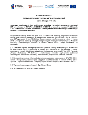 UCHWAŁA NR 4/2017 ZARZĄDU STOWARZYSZENIA METROPOLIA POZNAŃ z dnia 2 lutego 2017 roku w sprawie zatwierdzenia listy rankingowej wniosków i protokołu z oceny strategicznej ZIT w konkursie nr RPWP.04.04.03-IZ-00-30-001/16 w ramach w ramach Poddziałania 4.4.3 Zachowanie, ochrona, promowanie i rozwój dziedzictwa naturalnego i kulturowego w ramach ZIT dla MOF Poznania Na podstawie ustawy z dnia 11 lipca 2014 r. o zasadach realizacji programów w zakresie polityki spójności finansowanych w perspektywie finansowej 2014-2020 (t.j. Dz.U. z 2016 r. poz. 217), paragrafu 34 pkt. 12) Statutu Stowarzyszenia oraz Porozumienia z dnia 16 marca 2015 r. w sprawie realizacji Strategii Zintegrowanych Inwestycji Terytorialnych w Miejskim Obszarze Funkcjonalnym Poznania w ramach WRPO 2014+ Zarząd postanawia, co następuje: § 1. Zatwierdza się listę rankingową wniosków i protokół z oceny strategicznej ZIT w konkursie nr RPWP.04.04.03-IZ-00-30-001/16 w ramach Poddziałania 4.4.3 Zachowanie, ochrona, promowanie i rozwój dziedzictwa naturalnego i kulturowego w ramach ZIT dla MOF Poznania (Projekt strategiczny P9 Ochrona i modernizacja obiektów użyteczności publicznej stanowiących dziedzictwo kulturowe), które stanowią załączniki do niniejszej uchwały. § 2. Lista rankingowa oraz dokumentacja konkursowa zostają przekazane do IZ WRPO 2014+ celem dalszej oceny projektów pod względem kwalifikowalności w ramach WRPO 2014+ zgodnie z kryteriami formalnymi i merytorycznymi zatwierdzonymi przez KM WRPO 2014+. § 3. Wykonanie uchwały powierza się Dyrektorowi Biura. § 4. Uchwała wchodzi w życie z dniem podjęcia. UZASADNIENIE DO UCHWAŁY NR 4/2017 ZARZĄDU STOWARZYSZENIA METROPOLIA POZNAŃ z dnia 2 lutego 2017 roku w sprawie zatwierdzenia listy rankingowej wniosków i protokołu z oceny strategicznej ZIT w konkursie nr RPWP.04.04.03-IZ-00-30-001/16 w ramach w ramach Poddziałania 4.4.3 Zachowanie, ochrona, promowanie i rozwój dziedzictwa naturalnego i kulturowego w ramach ZIT dla MOF Poznania Na podstawie Porozumienia z dnia 16 marca 2015 r. w sprawie realizacji Strategii Zintegrowanych Inwestycji Terytorialnych w Miejskim Obszarze Funkcjonalnym Poznania w ramach Wielkopolskiego Regionalnego Programu Operacyjnego na lata 2014-2020 Stowarzyszenie Metropolia Poznań realizuje zadania w zakresie oceny strategicznej ZIT projektów składanych do dofinansowania ze środków przeznaczonych na realizację Strategii ZIT w Miejskim Obszarze Funkcjonalnym Poznania. Zgodnie z Instrukcją Wykonawczą Instytucji Pośredniczącej dla Zintegrowanych Inwestycji Terytorialnych w Miejskim Obszarze Funkcjonalnym Poznania realizowanych w ramach Wielkopolskiego Regionalnego Programu Operacyjnego na lata 2014-2020 niezwłocznie po zakończeniu oceny strategicznej ZIT projektów złożonych w ramach konkursu, Zarząd Stowarzyszenia Metropolia Poznań dokonuje w formie uchwały zatwierdzenia listy rankingowej wniosków rekomendowanych do dofinansowania oraz protokołu z oceny strategicznej, sporządzonych przez Komisję Oceny Projektów. Komisja Oceny Projektów na swoim posiedzeniu w dniu 20 stycznia 2017 r. dokonała podsumowania oceny strategicznej ZIT projektów złożonych w konkursie nr RPWP.04.04.03IZ-00-30-001/16 w ramach Poddziałania 4.4.3 Zachowanie, ochrona, promowanie i rozwój dziedzictwa naturalnego i kulturowego w ramach ZIT dla MOF Poznania (Projekt P9 Ochrona i modernizacja obiektów użyteczności publicznej stanowiących dziedzictwo kulturowe) oraz przyjęła protokół z oceny strategicznej ZIT. Mając na uwadze powyższe, podjęcie uchwały przez Zarząd Stowarzyszenia w sprawie zatwierdzenia protokołu z oceny strategicznej ZIT i listy rankingowej wniosków złożonych w konkursie nr RPWP.04.04.03-IZ-00-30-001/16 jest w pełni uzasadnione.