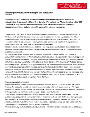 Polscy podchorążowie najlepsi we Włoszech 2015-05-30 Wojskowi studenci z Wyższej Szkoły Oficerskiej we Wrocławiu zwyciężyli w jednych z najtrudniejszych zawodach militarnych w Europie. W rywalizacji we Włoszech wzięło udział 300 zawodników z 20 państw. Na 40-kilometrowej trasie żołnierze musieli m.in. prowadzić rozpoznanie, wykonać zadania saperskie czy udzielić pomocy medycznej. Tegoroczna 29 już edycja Italian Raid Commando Lombardia 2015 odbyła się w Bisuschio. – Podczas tych górskich zawodów rozpoznawczych uczestnicy muszą wykazać się nie tylko sprawnością fizyczną, lecz także praktycznymi umiejętnościami stosowania procedur NATOowskich w różnych dziedzinach – mówi ppłk Andrzej Demkowicz z Zakładu Rozpoznania i Dowodzenia WSOWL, szef Sekcji Szkoleń Wysokogórskich. Na zawodników czekały różnorodne zadania – od rozpoznawczych, strzeleckich i saperskich, przez udzielanie pierwszej pomocy na polu walki, po składanie meldunków czy zatrzymywanie i przeszukiwanie osób. W zmaganiach wzięli udział żołnierze z ponad 20 państw z całego świata. Do Lombardii przyjechali wojskowi m.in. z: Wielkiej Brytanii, Niemiec, USA, Nowej Zelandii, Holandii, Węgier. W sumie do rywalizacji stanęły 62 drużyny reprezentujące wojskowe uczelnie oraz jednostki bojowe. Z Polski na zawody wyjechali podchorążowie z Sekcji Szkoleń Wysokogórskich Wyższej Szkoły Oficerskiej Wojsk Lądowych. – Przygotowywaliśmy się solidnie przez dwa miesiące. Pracowaliśmy nad kondycją, organizowaliśmy marsze, treningi strzeleckie, ćwiczyliśmy także różne sytuacje taktyczne: zasadzki, przeszukania budynków – mówi por. Piotr Stykowski, dowódca plutonu oraz opiekun Sekcji. W skład drużyny, poza por. Stykowskim, wchodzili podchorążowie trzeciego roku o specjalności rozpoznawczej oraz zmechanizowanej: sierż. pchor. Adrian Jaśkowski, st. kpr. pchor. Miłosz Siuta oraz st. kpr. pchor. Kamil Tafelski. Przeprawa przez jezioro i strzelanie Na 40-kilometrowy marsz zawodnicy wyruszyli o północy. Każda z drużyn działała jako patrol bojowy. Na początku zawodnicy musieli zorganizować posterunek obserwacyjny. – W ciągu kolejnych czterech godzin pojawił się przeciwnik, czyli uzbrojony patrol pieszy. Naszym zadaniem było sporządzenie meldunku z obserwacji – dodaje por. Stykowski. Testowi wytrzymałości zawodnicy zostali poddani kilka godzin później. Wszystkich czekała przeprawa przez jezioro z bronią i sprzętem. – Pozornie zadanie nie było trudne, ale w praktyce okazało się dość wymagające. Do przepłynięcia mieliśmy co prawda niewiele, bo około 70 metrów, ale broń musieliśmy nieść nad wodą, plecaki ciągnąć za sobą. Do tego woda nie była zbyt ciepła – opowiada sierż. pchor. Adrian Jaśkowski. Później żołnierzy czekało strzelanie indywidualne. – Mieliśmy okazję strzelać z broni, z której na Autor: Paulina Glińska Strona: 1 co dzień nie korzystamy. Były to strzelba Benneli, pistolet Beretta i karabinek szturmowy ARX 160. Dla podchorążych zadanie było nowością, bo tego typu ćwiczenia polscy żołnierze wykonują zazwyczaj przed wyjazdem na misje – opowiada opiekun drużyny. Żołnierze sprawdzali się też w strzelaniu zespołowym. Sędziowie oceniali także, czy zawodnicy dobrze zorganizowali konwój. – Chodziło o sprawdzenie, jak reagujemy na różne sytuacje powstałe na drodze. Jedną z nich był wybuch ładunku improwizowanego pod pojazdem. Mieliśmy ocenić uszkodzenia, zabezpieczyć teren i na koniec złożyć meldunek dowódcy – opowiada st. kpr. pchor. Kamil Tafelski. Rozpoznanie w jaskini Uczestnicy zawodów musieli również przeprowadzić rozpoznanie i zniszczyć przeciwnika. Wszystko odbyło się w jaskini. – Zjeżdżaliśmy na linie do bunkra wykutego w skale podczas II wojny światowej. Tam, od znajdujących się osób, musieliśmy wydobyć informacje o przeciwniku, a potem przeszukać teren, by znaleźć dokumenty, sprzęt, ukrytą amunicję – mówi st. kpr. pchor. Miłosz Siuta. Potem zawodnicy udzielali pierwszej pomocy na polu walki. W zależności od obrażeń poszkodowanego musieli podjąć decyzję na przykład o natychmiastowym wezwaniu Medevacu. Sukces Polaków Po 18 godzinach ekstremalnego rajdu i wykonaniu zadań żołnierze dotarli do mety. – Nie było łatwo, ale daliśmy z siebie wszystko – mówi por. Stykowski. W klasyfikacji uczelni wojskowych polscy studenci zdobyli pierwsze miejsce oraz szóste w klasyfikacji generalnej. – Bierzemy udział w tym przedsięwzięciu od trzech lat. To, jak dotychczas, nasz najlepszy wynik – mówi ppłk Demkowicz. Żołnierze dodają, że tegoroczna rywalizacja była wyjątkowo wyrównana. – Od zwycięskiej drużyny, która zdobyła 1586 punktów, dzieliło nas zaledwie 40. To naprawdę niewiele. Pięć drużyn w ogóle nie ukończyło rajdu – mówi por. Stykowski. Żołnierze, którzy brali udział w tegorocznej edycji rajdu, to przyszli dowódcy plutonów. – Takie zawody pozwalają im zdobyć doświadczenie oraz są okazją do sprawdzenia umiejętności i samego siebie w warunkach stresu – ocenia porucznik. Sekcja Szkoleń Wysokogórskich działa w Wyższej Szkole Oficerskiej Wojsk Lądowych. Należą do niej podchorążowie i studenci cywilnych uczelni. Sekcja zajmuje się promocją tematyki wysokogórskiej, jest też organizatorem szkoleń, wykładów i treningów kondycyjnych. Autor: Paulina Glińska Strona: 2