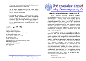 Wincentego Pallottiego a ikoną Maryi jako Gwiazdy nowej ewangelizacji według papieża Franciszka 2. Jak te obrazy pomagają nam odnowić nasze własne powołanie do apostolstwa, w odpowiedzi na wezwanie Kościoła do Nowej Ewangelizacji? 3. Co wspólnego dostrzegamy w Maryi Królowej Apostołów widzianej oczami Wincentego oraz Maryi jako Gwiazdy Nowej Ewangelizacji według papieża Franciszka? Co powinniśmy zrobić, aby ożywić wiarę, rozniecić nową iskrę miłości, wzbudzić nowy impuls prowadzący ludzi do jedności, oraz by Jezus Chrystus był poznany i ukochany przez wszystkich? Modlitwa [por. EG 288] Maryjo, Królowo Apostołów i Gwiazdo Nowej Ewangelizacji, pomóż nam zajaśnieć świadectwem komunii, służby, żarliwej i ofiarnej wiary, sprawiedliwości i miłości do ubogich, aby radość Ewangelii dotarła aż po krańce ziemi, i żadne peryferie nie zostały pozbawione jej światła. Matko żywej Ewangelii, źródło radości dla maluczkich, módl się za nami. Amen. Alleluja! 4 Segretariato Generale, Unione dell’Apostolato Cattolico Piazza San Vincenzo Pallotti 204, Roma, Italia [email protected] Maryja – Gwiazda Nowej Ewangelizacji Papież Franciszek rozpoczyna adhortację apostolską Evangelii Gaudium wezwaniem do dzielenia się radością Ewangelii radością płynącą z poznania osoby Jezusa Chrystusa. Kończąc adhortację Ojciec Święty mówi o Maryi ukazując ją jako Gwiazdę Nowej Ewangelizacji i jako Matkę Kościoła, który ewangelizuje. Papież – podobnie tak jak Wincenty Pallotti – widzi w Maryi pomoc do poznania i zrozumienia czym jest nowa ewangelizacja. Będąc członkami Zjednoczenia Apostolstwa Katolickiego żyjącymi charyzmatem św. Wincentego, rozpoznajemy to samo wezwanie po podjęcia nowej ewangelizacji, wezwanie skierowane do nas przez Boga – Nieskończoną Miłość. Podobnie jak w czasach św. Wincentego Pallottiego tak i dzisiaj stają przed nami te same wyzwania dotyczące życia wiarą. Chociaż wtedy nie było jeszcze mowy o tym, że świat jest globalną wioską, ani tamtego wieku nie nazywało się wiekiem technologii, to faktem stał się powszechny brak wiary zauważalny zarówno wewnątrz Kościoła, jak i w postawach społeczeństwa. Zjawisko to jest zauważalne w tak wielu krajach. Pallotti zmierzał się z brakiem wiary i podobnie trzeba czynić i nam. Natchnienie do założenia Zjednoczenia, którym obdarzył go Bóg, wymagało od niego odpowiedzi na znaki czasu: odkrywał je zarówno w ludziach jak i w sytuacjach, które spotykał. Podobnie jak za czasów Pallottiego tak i dzisiaj świat będący wokół nas woła do nas o świadectwo obecności Jezusa, naszego Pana i Zbawiciela, który nie tylko kroczy pomiędzy nami, ale który idzie z nami przez życie. Zadania jakie są do spełnienia przez nas w 2014 r. niczym nie różnią się od tych, z czasów naszego Założyciela w XIX wieku: - Ożywić wiarę, Rozpalić nową iskrę miłości, - Wzbudzić nowy impuls prowadzący ludzi do jedności w Jezusie Chrystusie. Wincenty jest przekonany, że wszystko stanie się możliwe dzięki obecności Maryi w Kościele będącym Ciałem Chrystusa, a więc w głębi naszych serc – jako członków tego Ciała. Dzięki Tej, która jest Matką Jezusa i która także jest naszą Matką, a my jesteśmy obrazem Jej Syna. To jest ta sama Maryja z Evangelii Gaudium (287), która jest niewiastą wiary, kroczącą w wierze. Ona jest Tą, która razem ze swoim Synem idzie z nami, walczy razem z nami i nieustannie przybliża nam Bożą miłość (por. EG 286). wraz ze wszystkimi stworzeniami w jerozolimskim Wieczerniku, gdzie Apostołowie otrzymali Ducha Świętego; i jak Apostołowie pozostawali tam z Najświętszą Maryją, tak będę też sobie wyobrażał, iż jestem tam z moją nade wszystko najukochańszą Matką Maryją i z nade wszystko najbardziej umiłowanym Oblubieńcem Jezusem, którzy – uważam to za pewne – jako moi najosobliwsi Obrońcy sprawią, że spłynie na mnie i na innych obfitość Ducha Świętego. (OOCC X, s. 86; WP III, s. 46) Prośmy razem: Maryjo, Gwiazdo Nowej Ewangelizacji, prowadź całą naszą Rodzinę Pallotyńską : Przed każdym z nas stoi wyzwanie głoszenia Jezusa światu, i Maryja dla tych, co podejmują to wyzwanie jest przewodnim światłem wskazującym na Ducha Świętego. Taka jest nasza droga wiary prowadząca ku życiu owocującym służbą i płodnością (EG 287). do wypowiadania Bogu TAK w duchu Wieczernika, by głosić Jezusa do trwania w Wieczerniku, aby otrzymać moc Ducha Świętego do zjednoczenia się z Maryją w ukrzyżowaniu jakie dokonuje się w dzisiejszym społeczeństwie, dla zbawienia całego świata. Wincenty wskazuje na to samo światło, które widzimy w ikonie Maryi z Nazaretu. Nazaret był miejscem gdzie Jezus przygotowywał się do swojej misji, miejscem gdzie Maryja i Józef pomagali Jezusowi położyć w życiu trwały fundament i zdobyć prawdziwą wartość rzeczy (por. OOCC VII, s. 112). Wraz z Jezusem z Nazaretu, w tym doświadczeniu Świętej Rodziny, żyjmy w pokorze i posłuszeństwie Ojcu Niebieskiemu – w poddaniu się Dziewiczej Matce Maryi i św. Józefowi, Jego przybranemu Ojcu (OOCC XIII, s. 129). Nawiązujmy więzi z innymi apostołami należącymi do naszej Rodziny Pallotyńskiej – Rodziny podejmującej apostolską misję. Na koniec naszej krótkiej refleksji, jednoczymy się z Ojcem Świętym Franciszkiem i naszym Założycielem, by w głębi serc usłyszeć natchnienie jakie otrzymał Pallotti i podjąć z pomocą Maryi Królowej Apostołów współpracę ze wszystkimi ludźmi dla większej chwały Bożej oraz aby być w każdej pracy ewangeliczną surmą, która wszystkich wzywa, która wszystkich zaprasza, która rozbudza gorliwość i miłość u wszystkich (…)aby wspierali Kościół Jezusa Chrystusa w jego obecnych i przyszłych potrzebach, aby wszyscy mogli współpracować nieustannie i skutecznie, z coraz większą gorliwością (