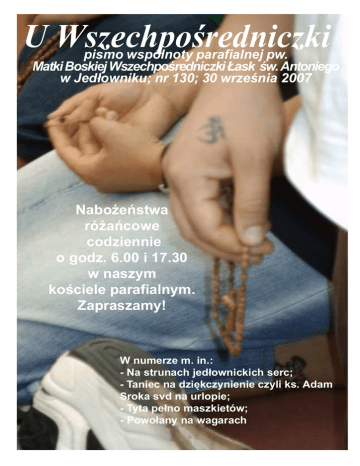 U Wszechpośredniczki pismo wspólnoty parafialnej pw. Matki Boskiej Wszechpośredniczki Łask św. Antoniego w Jedłowniku; nr 130; 30 września 2007 Nabożeństwa różańcowe codziennie o godz. 6.00 i 17.30 w naszym kościele parafialnym. Zapraszamy! W numerze m. in.: - Na strunach jedłownickich serc; - Taniec na dziękczynienie czyli ks. Adam Sroka svd na urlopie; - Tyta pełno maszkietów; - Powołany na wagarach Do Rodziny Dzieci Bożych zostali włączeni: Z życia parafii: Patrycja Aleksandra Skupień Tomasz Jan Minko Ksawier Kamil Polnik Wiktoria Aleksandra Habura Aylin Maria Türkoglu Alicja Danuta Ptak Jakub Mateusz Krupa Daniel Adam Łojko Tomasz Krzysztof Jaskuła Natalia Marta Jeszka Wiktoria Vanessa Grycman Do Domu Ojca odeszli: Świ@tełko - listy do Przyjaciela Mój Przyjacielu, Czas wakacji i odpoczynku ustępuje miejsca nowym obowiązkom i nowym pomysłom. W naszej parafii mamy sporo możliwości pogłębiania naszej wiary i dobywaniamądrości. Jest wiele Wspólnot otwartych na nowe twarze i jest możliwość uczestniczenia w kursach językowych. Dla mnie bardzo ważny był czas chodzenia na tzw. oazę. Cotygodniowe spotkania z ludźmi, którzy tak samo jak ja chcę odkrywać i poznawać Boga umacniały moją wiarę. Comiesięczna Msza młodzieżowa, wspólna modlitwa... Teraz na studiach bardzo mi tego brakuje. Gdybym tylko miała jeszcze możliwość uczestniczenia w tych spotkaniach... Jezus czyni wielkie dzieła w naszym codziennym życiu! Nie dostrzeże tego nikt, kto nie zwraca uwagi na Niego. A kto dostrzega te cuda jest człowiekiem szczęśliwym i chcę się tym szczęściem dzielić. Chodzenie na spo + Maria Tkocz, l. 75 + Gertruda Plewnia, l. 87, + Wiesława Dzierżęga, l. 60, + Władysław Kępka, l. 78, + Emil Profaska, l. 74, + Teodozja Krotki, l. 96, + Maria Tatarczyk, l. 83, + Stanisław Szajor, l. 50, + Marcin Binkowski, l. 25, z tkania oazowe było takim otwieraniem drzwi Jezusowi, aby we mnie działał i mnie przemieniał. A jeśli chodzi o naukę języków to przypomniała mi się pewna historyjka: do bacy przychodzi turysta i pyta o coś po angielsku. Baca rozkłada ręce. Turysta pyta po niemiecku. Baca nic. Na francuskie zdanie też pokręcił głową, że nie rozumie. Zrezygnowany turysta odszedł. Juhas podchodzi i mówi: "Widzicie baco, jakbyście się uczyli języków to byście się dogodali". "Wiysz Juhas, a on się uczył i się nie dogodoł". Możemy przyjąć postawę bacy i zaszyć się w "swoim kącie". A możemy być jak ten turysta - poszukiwać i znajdować. Świat się coraz bardziej "zmniejsza" i równie potrzeba znajomości języków. (To nagłe zmniejszenie dostrzegłam dziś w autobusie, gdy ktoś w pewnym momencie się odezwał: "Cześć, no ja już dojeżdżam, wyjedziesz po mnie?" ) Z jednej strony sama ciekawość świata "zmusza" nas do podróżowania po innych krajach. Poznajemy wtedy kulturę i obyczaje innych ludzi. Z drugiej strony może to być konieczność np. podjęcia pracy za granicą. A co ciekawe, uczenie się dobrze wpływa na nasze szare komórki i poprawia pamięć :-) Kończę już i pozdrawiam Cię serdecznie. światełko --2-- W sakramencie małżeństwa w jedno połączyli się: Fajkis Dominika - Andracki Krzysztof Langer Barbara - Kiermas Krzysztof Sosna Barbara - Ośliźlok Krzysztof Dobisz Barbara - Jęczmionka Michał Węgrzyk Justyna - Orzoł Rafał Wolny Barbara - Wolny Marek Oleksik Edyta - Jezusek Jacek Kawalec Karolina - Wachtarczyk Marcin Łukowska Lucyna - Dubas Rafał Jureczko Beata - Duda Łukasz Smolińska Aleksandra - Miczajka Roman Machnik Agnieszka - Kubica Wojciech Kuś Ewelina - Cecot Tomasz Filipowska Monika - Janda Bartłomiej Zajączkiewicz Agata - Powers Jonathan Kacprzyk Justyna - Duraj Bartłomiej Wierzbicka Agata - Tyc Wojciech Maryja woła! Hej!witamy was po wakacjach. Wprawdzie wakacje skończyły się miesiąc temu, ale sprobujcie sobie przypomnieć jak na nich było. Nasze wakacje były w tym roku wyjątkowo udane. Byłyśmy na rekolekcjach jako animatorki. W poprzednich latach były już opisywane rekolekcje od strony uczestników a tym razem opiszemy je od strony nas - animatorów. Wiec miałyśmy każda swoją grupę. Były to dziewczynki w wieku ok 10 lat. Było dużo pracy, ale nie żałuję ani jednej spędzonej tam chwili. Dzień animatora troszkę różnił się od dnia uczestnika. Rano animatorki wstawały najszybciej, aby obudzić dzieci, chociaż nie raz bywało, że to animatorki były budzone przez dzieci:) Później wszystko jak co dzień...modlitwa... śniadanko... dyżury...eucharystia a później jakaś wycieczka, atrakcja wieczoru, zabawy.Każdy Powołany na wagarach Od kilku tygodni powoli-powoli przyzwyczajamy się do powakacyjnych zmian w naszej parafii. Jedną z nich, ale za to bardzo znaczącą, jest zmiana ks. wikarego: po czteroletniej pracy, zadomowiony w Jedłowniku ks. Arkadiusz odszedł do Bańgowa, za to dekretem Ks. Biskupa do Jedłownika posłany został ks. Dariusz Borowiec. Kim jest? Skąd pochodzi? To tylko niektóre z pytań, na które udzielił mi odpowiedzi. Zapytany o datę urodzenia ks. Dariusz odpowiada: 6 maja 1968 roku, dokładnie o północy. Naprawdę! Urodziłem się w Borzęcinie, bo stamtąd pochodzi moja Mama. Większość dużej rodziny mojego zmarłego taty, mieszka od Rybnika po Pyskowice. Mam jeszcze młodszą siostrę, Joannę. Z komunijnego zdjęcia patrzy na mnie dzień rozpoczynaliśmy i kończyliśmy modlitwą. Bardzo się cieszymy, że mogłyśmy być na tych rekolekcjach:) W trzecią niedziele września odbył się Dzień Wspólnoty Dzieci Maryi, na którym spotkały się wszystkie Dzieci Maryi zwłaszcza te, które były na rekolekcjach, wśród tych grup nie zabrakło naszej wspólnoty:)Był to bardzo udany dzień spędzony na wspólnej modlitwie, zabawie i śpiewie:) Każdemu życzymy tak wspaniałych wakacji. Ale zaczął się rok szkolny, czyli też nowy rok formacji. Zaszły już pewne zmiany, m.in. został