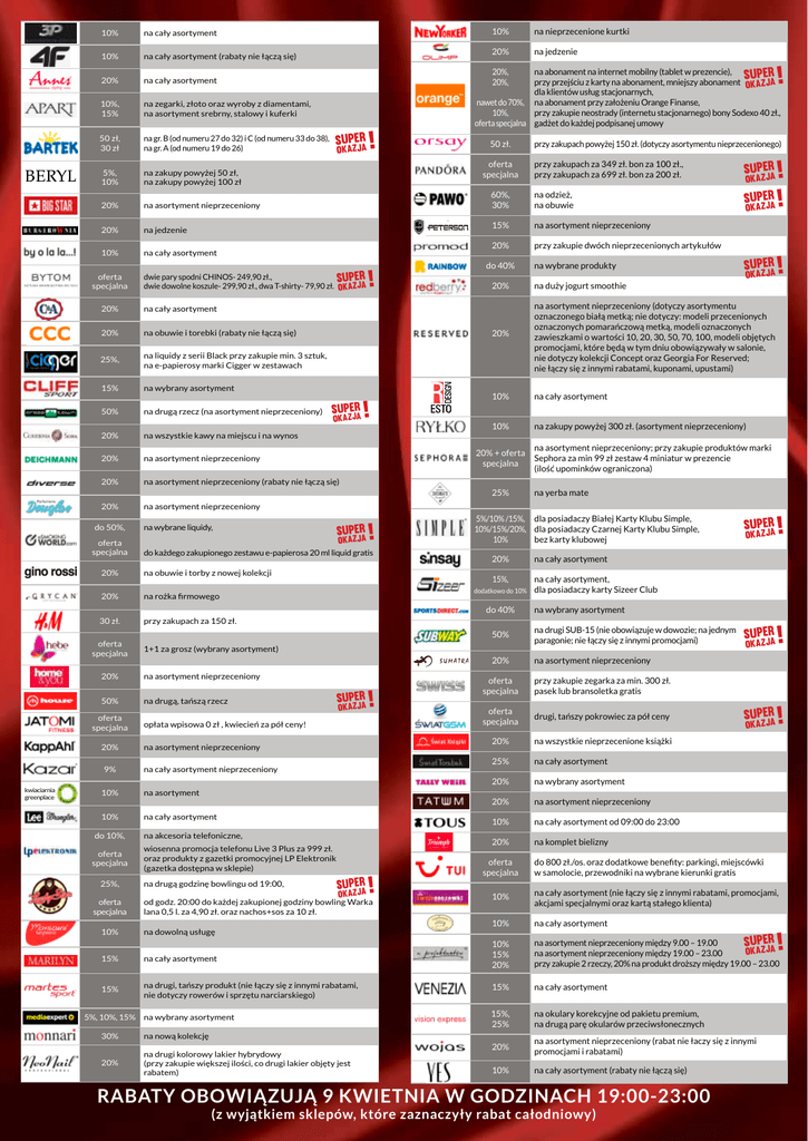 10% na cały asortyment 10% na cały asortyment (rabaty nie łączą się) 20% na cały asortyment 10%, 15% na zegarki, złoto oraz wyroby z diamentami, na asortyment srebrny, stalowy i kuferki 50 zł, 30 zł na gr. B (od numeru 27 do 32) i C (od numeru 33 do 38), na gr. A (od numeru 19 do 26) 5%, 10% na zakupy powyżej 50 zł, na zakupy powyżej 100 zł 20% na asortyment nieprzeceniony 20% na jedzenie 10% oferta specjalna 10% na nieprzecenione kurtki 20% na jedzenie ! SUPER JA OKAZ 50 zł. oferta specjalna na cały asortyment dwie pary spodni CHINOS- 249,90 zł., SUPER dwie dowolne koszule- 299,90 zł., dwa T-shirty- 79,90 zł. OKAZJA 20% na cały asortyment 20% na obuwie i torebki (rabaty nie łączą się) 25%, na liquidy z serii Black przy zakupie min. 3 sztuk, na e-papierosy marki Cigger w zestawach 15% na wybrany asortyment 50% na drugą rzecz (na asortyment nieprzeceniony) 20% na wszystkie kawy na miejscu i na wynos 20% na asortyment nieprzeceniony 20% na asortyment nieprzeceniony (rabaty nie łączą się) 20% na asortyment nieprzeceniony SUPER JA OKAZ ! ! oferta specjalna na wybrane liquidy, OKAZ ! do każdego zakupionego zestawu e-papierosa 20 ml liquid gratis 20% na obuwie i torby z nowej kolekcji 20% na rożka firmowego 30 zł. przy zakupach za 150 zł. 15% na asortyment nieprzeceniony 20% przy zakupie dwóch nieprzecenionych artykułów do 40% na asortyment nieprzeceniony 50% na drugą, tańszą rzecz oferta specjalna 20% 9% kwiaciarnia greenplace na asortyment nieprzeceniony na cały asortyment nieprzeceniony na asortyment 10% na cały asortyment oferta specjalna 25%, oferta specjalna ! opłata wpisowa 0 zł , kwiecień za pół ceny! 10% do 10%, OKAZ na akcesoria telefoniczne, wiosenna promocja telefonu Live 3 Plus za 999 zł. oraz produkty z gazetki promocyjnej LP Elektronik (gazetka dostępna w sklepie) na drugą godzinę bowlingu od 19:00, SUPER JA OKAZ ! od godz. 20:00 do każdej zakupionej godziny bowling Warka lana 0,5 l. za 4,90 zł. oraz nachos+sos za 10 zł. SUPER JA OKAZ 20% na asortyment nieprzeceniony (dotyczy asortymentu oznaczonego białą metką; nie dotyczy: modeli przecenionych oznaczonych pomarańczową metką, modeli oznaczonych zawieszkami o wartości 10, 20, 30, 50, 70, 100, modeli objętych promocjami, które będą w tym dniu obowiązywały w salonie, nie dotyczy kolekcji Concept oraz Georgia For Reserved; nie łączy się z innymi rabatami, kuponami, upustami) 10% na cały asortyment 10% na zakupy powyżej 300 zł. (asortyment nieprzeceniony) na yerba mate 20% na cały asortyment 15%, na cały asortyment, dla posiadaczy karty Sizeer Club SUPER JA OKAZ ! SUPER JA OKAZ ! SUPER JA ! na wybrany asortyment 50% na drugi SUB-15 (nie obowiązuje w dowozie; na jednym paragonie; nie łączy się z innymi promocjami) 20% na asortyment nieprzeceniony oferta specjalna przy zakupie zegarka za min. 300 zł. pasek lub bransoletka gratis oferta specjalna drugi, tańszy pokrowiec za pół ceny 20% na wszystkie nieprzecenione książki 25% na cały asortyment 20% na wybrany asortyment 20% na asortyment nieprzeceniony 10% na cały asortyment od 09:00 do 23:00 20% na komplet bielizny oferta specjalna OKAZ do 800 zł./os. oraz dodatkowe benefity: parkingi, miejscówki w samolocie, przewodniki na wybrane kierunki gratis 10% na cały asortyment (nie łączy się z innymi rabatami, promocjami, akcjami specjalnymi oraz kartą stałego klienta) 10% na cały asortyment 10% 15% 20% na asortyment nieprzeceniony między 9.00 – 19.00 SUPER OKAZJA na asortyment nieprzeceniony między 19.00 – 23.00 przy zakupie 2 rzeczy, 20% na produkt droższy między 19.00 – 23.00 10% na dowolną usługę 15% na cały asortyment 15% na drugi, tańszy produkt (nie łączy się z innymi rabatami, nie dotyczy rowerów i sprzętu narciarskiego) 15% na cały asortyment na wybrany asortyment 15%, 25% na okulary korekcyjne od pakietu premium, na drugą parę okularów przeciwsłonecznych 20% na asortyment nieprzeceniony (rabat nie łaczy się z innymi promocjami i rabatami) 10% na cały asortyment (rabaty nie łączą się) 5%, 10%, 15% 30% na nową kolekcję 20% na drugi kolorowy lakier hybrydowy (przy zakupie większej ilości, co drugi lakier objęty jest rabatem) ! na asortyment nieprzeceniony; przy zakupie produktów marki Sephora za min 99 zł zestaw 4 miniatur w prezencie (ilość upominków ograniczona) 5%/10% /15%, dla posiadaczy Białej Karty Klubu Simple, 10%/15%/20%, dla posiadaczy Czarnej Karty Klubu Simple, 10% bez karty klubowej dodatkowo do 10% SUPER JA OKAZ na duży jogurt smoothie 1+1 za grosz (wybrany asortyment) 20% na wybrane produkty ! SUPER OKAZJA ! SUPER JA 20% do 40% oferta specjalna przy zakupach za 349 zł. bon za 100 zł., przy zakupach za 699 zł. bon za 200 zł. na odzież, na obuwie 20% + oferta specjalna SUPER JA przy zakupach powyżej 150 zł. (dotyczy asortymentu nieprzecenionego) 60%, 30% 25% do 50%, ! na abonament na internet mobilny (tablet w prezencie), SUPER przy przejściu z karty na abonament, mniejszy abonament OKAZJA dla klientów usług stacjonarnych, nawet do 70%, na abonament przy założeniu Orange Finanse, 10%, przy zakupie neostrady (internetu stacjonarnego) bony Sodexo 40 zł., oferta specjalna gadżet do każdej podpisanej umowy 20%, 20%, Rabaty obowiązują 9 kwietnia w godzinach 19:00-23:00 (z wyjątkiem sklepów, które zaznaczyły rabat całodniowy) !
