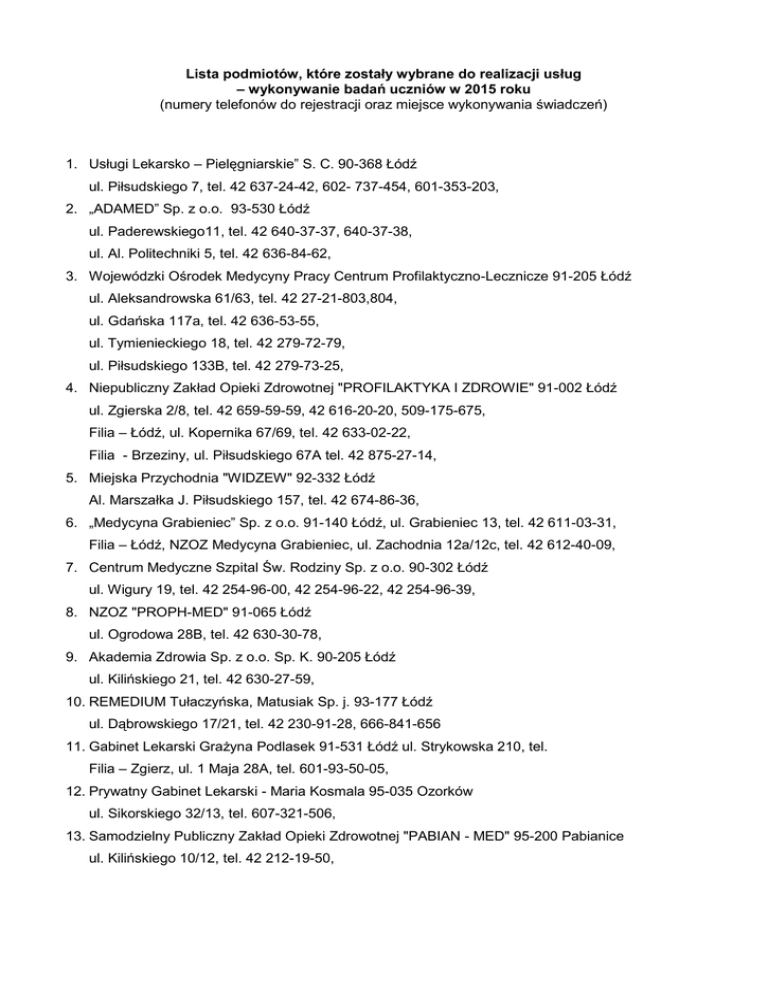 Lista podmiotów, które zostały wybrane do realizacji usług – wykonywanie badań uczniów w 2015 roku (numery telefonów do rejestracji oraz miejsce wykonywania świadczeń) 1. Usługi Lekarsko – Pielęgniarskie” S. C. 90-368 Łódź ul. Piłsudskiego 7, tel. 42 637-24-42, 602- 737-454, 601-353-203, 2. „ADAMED” Sp. z o.o. 93-530 Łódź ul. Paderewskiego11, tel. 42 640-37-37, 640-37-38, ul. Al. Politechniki 5, tel. 42 636-84-62, 3. Wojewódzki Ośrodek Medycyny Pracy Centrum Profilaktyczno-Lecznicze 91-205 Łódź ul. Aleksandrowska 61/63, tel. 42 27-21-803,804, ul. Gdańska 117a, tel. 42 636-53-55, ul. Tymienieckiego 18, tel. 42 279-72-79, ul. Piłsudskiego 133B, tel. 42 279-73-25, 4. Niepubliczny Zakład Opieki Zdrowotnej "PROFILAKTYKA I ZDROWIE" 91-002 Łódź ul. Zgierska 2/8, tel. 42 659-59-59, 42 616-20-20, 509-175-675, Filia – Łódź, ul. Kopernika 67/69, tel. 42 633-02-22, Filia - Brzeziny, ul. Piłsudskiego 67A tel. 42 875-27-14, 5. Miejska Przychodnia "WIDZEW" 92-332 Łódź Al. Marszałka J. Piłsudskiego 157, tel. 42 674-86-36, 6. „Medycyna Grabieniec” Sp. z o.o. 91-140 Łódź, ul. Grabieniec 13, tel. 42 611-03-31, Filia – Łódź, NZOZ Medycyna Grabieniec, ul. Zachodnia 12a/12c, tel. 42 612-40-09, 7. Centrum Medyczne Szpital Św. Rodziny Sp. z o.o. 90-302 Łódź ul. Wigury 19, tel. 42 254-96-00, 42 254-96-22, 42 254-96-39, 8. NZOZ "PROPH-MED" 91-065 Łódź ul. Ogrodowa 28B, tel. 42 630-30-78, 9. Akademia Zdrowia Sp. z o.o. Sp. K. 90-205 Łódź ul. Kilińskiego 21, tel. 42 630-27-59, 10. REMEDIUM Tułaczyńska, Matusiak Sp. j. 93-177 Łódź ul. Dąbrowskiego 17/21, tel. 42 230-91-28, 666-841-656 11. Gabinet Lekarski Grażyna Podlasek 91-531 Łódź ul. Strykowska 210, tel. Filia – Zgierz, ul. 1 Maja 28A, tel. 601-93-50-05, 12. Prywatny Gabinet Lekarski - Maria Kosmala 95-035 Ozorków ul. Sikorskiego 32/13, tel. 607-321-506, 13. Samodzielny Publiczny Zakład Opieki Zdrowotnej "PABIAN - MED" 95-200 Pabianice ul. Kilińskiego 10/12, tel. 42 212-19-50, 14. PL "Centrum Badań Profilaktycznych" - Andrzej Marcinkiewicz 95-200 Pabianice ul. Św. Jana 15, tel. 600-438-080, Gabinet Lekarski (Zespół Szkół Nr 2 im. Prof. J. Groszkowskiego) 95-200 Pabianice ul. Św. Jana 27, tel. 600-43-80-80, 15. Centrum Medyczne ProMED sp. z o.o. 95-200 Pabianice ul. Mariańska 5a, tel. 801-462-988, 887-291-600, 16. Pabianickie Centrum Medyczne Sp. z o.o. 95-200 Pabianice ul. Jana Pawła II 68, tel. 42 22-53-877, 17. Samodzielny Publiczny Zakład Opieki Zdrowotnej 95-050 Konstantynów Łódzki ul. Sadowa 10, tel. 42 211-11-14, 18. Szpital Wojewódzki im. Prymasa Kard. St. Wyszyńskiego 98-200 Sieradz ul. Armii Krajowej 7, tel. 43 827-82-25, 19. "ZDROWIE" Sp z o.o. Zespół Poradni "ZDROWIE" N ZOZ 98-200 Sieradz Al. Pokoju 7, tel. 43 822-19-99, Filia - Zduńska Wola, ul. J. Dąbrowskiego 10, tel. 43 823-67-10, 20. "TRES - MED" Spółka z o. o. 98-200 Sieradz ul. Krakowskie Przemieście 10, tel. 43 827-14-41, 21. Zduńskowolski Szpital Powiatowy Sp. z o. o. 98-220 Zduńska Wola ul. Królewska 29, Zespół Poradni – Poradnia Medycyny Pracy ul. Osmolińska 6, tel. 43 823-43-61, 22. PPHU "TOMKAR" S.C. Halina Styśko, Piotr Styśko PPL Zespół Poradni "ZDROWIE" 99-200 Poddębice ul. Zielona 2 a, tel. 43 678-95-00, ul. Krasickiego 11A, tel. 43 678-88-00, Uniejów, ul. Orzechowa 6, tel. 43 650-50-26, 23. Wojewódzki Szpital Zespolony 96-100 Skierniewice ul. Rybickiego 1, Filia -Skierniewice Poradnia Medycyny Pracy, ul. Wita Stwosza 1, tel. 46 833-33-40, 24. Tomaszowskie Centrum Zdrowia Sp. z o. o. 97-200 Tomaszów Maz. ul. Jana Pawła II 35, Filia - Tomaszów Mazowiecki, ul. Graniczna 63, tel. 44 725-72-19, 25. Szpital Powiatowy w Radomsku 97-500 Radomsko ul. Jagiellońska 36, tel. 44 685-47-68, 26. Przychodnia Lekarska ''MEDYK" A. Ciupińska, J. Drzazga, H. Roczek, J. Zacharewicz Sp. j. 97-500 Radomsko ul. Batorego 3, tel. 44 685-02-70, tel. 44 682-17-70, 44 682-17-71, 27. Niepubliczny Zakład Opieki Zdrowotnej PROMED 97-500 Radomsko ul. Miła 5, tel. 44 682-17-70, 44 682-17-71, 28. Samodzielny Publiczny Zakład Opieki Zdrowotnej PRO Familia 97-500 Radomsko ul. Armii Krajowej 34, tel. 44 683-15-51, Filia - Radomsko, ul. Przedborskiej 39/41, tel. 44 683-15-50, 29. Niepubliczny Zakład Opieki Zdrowotnej VITA -MED s.c. 26-300 Opoczno ul. Partyzantów 1A, tel. 44 755-01-37, 44 754-20-46, 30. Niepubliczny Zakład Opieki Zdrowotnej "VADEMECUM" 98-300 Wieluń Os. Wyszyńskiego 41, tel. 43 843-54-44, 31. Samodzielny Publiczny Zakład Opieki Zdrowotnej 96-200 Rawa Mazowiecka ul. Warszawska 14, Filia - Rawa Mazowiecka, ul. Niepodległości 8, tel. 46 814-20-65, 32. Gabinet Lekarski Ryszard Kądziela 96-200 Rawa Mazowiecka ul. Jana III Sobieskiego 97, tel. 46 815-18-59, 33. "ISOX" Sp. z o.o. 99-300 Kutno ul. Skłodowskiej-Curie 69/28, Filia - Kutno, ul. Oporowska 4, tel. 24 254-83-00, 691-110-502, 34. Prywatny Gabinet Lekarski - Małgorzata Sembrat 99-320 Żychlin Oś. Traugutta 1/1, Filia - Żychlin, ul. Marchlewskiego 1, tel. 24 285-10-90, Filia - Kutno, ul. Zamkowa 6/I, tel. 24 254-39-76, 35. Zespół Opieki Zdrowotnej 99-400 Łowicz ul. Ułańska 28, tel. 46 837-56-11 wew. 266, 36. Samodzielny Publiczny Zakład Opieki Zdrowotnej 97-425 Zelów ul. Żeromskiego 21, tel. 44 634-11 20 37. Zakład Opieki Zdrowotnej 99-100 Łęczyca ul. Zachodnia 6, tel. 24 388-26-01 do 09 wew. 219, 38. Twoja Klinika Sp. z o.o. 95-060 Brzeziny ul. Sienkiewicza 87, tel. 46 874-10-87, 39. Centrum Medyczne "MEDINEA" Anna Włodarczyk Kraszew ul. Rokicińska 3, 95-020 Andrespol, tel. 42 235-23-24.