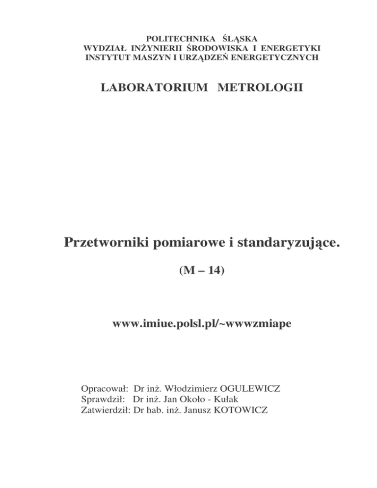 POLITECHNIKA L SKA WYDZIAŁ IN YNIERII RODOWISKA I ENERGETYKI INSTYTUT MASZYN I URZ DZE ENERGETYCZNYCH LABORATORIUM METROLOGII Przetworniki pomiarowe i standaryzuj ce. (M – 14) www.imiue.polsl.pl/~wwwzmiape Opracował: Dr in . Włodzimierz OGULEWICZ Sprawdził: Dr in . Jan Około - Kułak Zatwierdził: Dr hab. in . Janusz KOTOWICZ 1. Cel wiczenia. Celem wiczenia jest poznanie pomiarowych przetworników standaryzuj cych, wyznaczenie funkcji przetwarzania (proste regresji) i niepewno ci współczynników regresji. 2. Wprowadzenie. 2.1. Przetworniki. Okre 1enia i poj cia podstawowe. Przetwornik pomiarowy jest narz dziem słu cym do przetwarzania, (z okre lon dokładno ci i wg okre lonego prawa), sygnału pomiarowego, tj. sygnału zawieraj cego informacj o warto ciach wielko ci fizycznych i zwi zkach mi dzy nimi. Przetwornik pomiarowy mo e by samodzielnym urz dzeniem pomiarowym lub stanowi jego cz . Sygnał przetwarzany (wej ciowy) i sygnał przetworzony (wyj ciowy) przenosz informacj w postaci liczb. W ogólnym modelu przetwornika pomiarowego rozró nia si no niki i tre ci sygnału; no nikami s wielko ci fizyczne (wielko ci no ne), np. napi cie elektryczne, ci nienie, za tre ciami s liczby odpowiadaj ce warto ciom wielko ci no nych, np. okre lona warto napi cia czy ci nienia. Zale nie od postaci sygnałów rozró nia si przetworniki pomiarowe: • analogowe (a/a) — przetwarzaj ce sygnał wej ciowy analogowy na sygnał wyj ciowy równie analogowy (np. przekładnik napi ciowy transformuj cy napi cie wysokie na niskie, przetwornik pomiarowy ci nienia na pr d elektryczny); • analogowo-cyfrowe (a/c) — przetwarzaj ce sygnał wej ciowy analogowy na sygnał wyj ciowy cyfrowy (np. przetwornik pomiarowy pr du elektrycznego na sygnał cyfrowy w kodzie dwójkowym; przetwarzanie analogowo-cyfrowe); • cyfrowo-analogowe (c/a) — przetwornik pomiarowy o działaniu odwrotnym ni przetwornik pomiarowy a/c; • cyfrowo-cyfrowe (c/c) — przetwarzaj ce sygnał wej ciowy cyfrowy na sygnał wyj ciowy te cyfrowy (np. przetwornik pomiarowy sygnału w kodzie dwójkowym na sygnał w kodzie dziesi tnym). W ród przetworników pomiarowych analogowych wa n grup stanowi przetworniki skali wielko ci , które nie zmieniaj natury fizycznej ani kształtu przebiegów czasowych no nika sygnału; dzieli si je na nieelektryczne (z reguły mechaniczne, np. d wignia, przekładnia mechaniczna) i elektryczne (np. przetwornik pomiarowy napi cia na napi cie, pr du na pr d, a tak e napi cia na pr d i pr du na napi cie). Rozró nia si te przetworniki pomiarowe skali wielko ci: pasywne, które cał energi zu ywan w procesie przetwarzania czerpi ze ródła sygnału wej ciowego (np. dzielniki napi cia, przekładniki pr du), i aktywne, które czerpi energi równie spoza ródła sygnału wej ciowego (np. przetworniki pomiarowe ze wzmacniaczami operacyjnymi i sprz eniem zwrotnym). przetworniki Wi kszo przetworników pomiarowych stanowi pomiarowe elektryczne, czyli takie, w których przynajmniej jeden z sygnałów (wej ciowy lub wyj ciowy) jest sygnałem elektrycznym; dziel si one na: przetworniki pomiarowe sygnałów elektrycznych na elektryczne (np. napi cia przemiennego na nat enia pr du stałego) i przetworniki pomiarowe sygnałów nieelektrycznych na elektryczne (np. przetworniki fotoelektryczne, termoelektryczne, rezystancyjne, poło enia itp.). Przetworniki pomiarowe, podobnie jak czujniki, mo na równie podzieli na generacyjne i parametryczne. Pod poj ciem przetwornika (pomiarowego) standaryzuj cego rozumiemy przetwornik posiadaj cy znormalizowany sygnał wyj ciowy. Standardowe sygnały wyj ciowe (tzw. wyj cia analogowe (liniowe) do współpracy z urz dzeniami wtórnymi = wyj cia regulacyjne) mog by : • pr dowe: 0 ÷ 5 [mA], 0 ÷ 10 [mA], 0 ÷ 20 [mA], −5 ÷ 5 [mA], 1 ÷ 5 [mA], 2 ÷ 10 [mA], 4 ÷ 20 [mA], • napi ciowe: 0 ÷ 10 [mV], 0 ÷ 50 [mV], 0 ÷ 100 [mV], 0 ÷ 1 [V], 0 ÷ 5 [V], 0 ÷ 10 [V], −10 ÷ 10 [V], 1 ÷ 5 [V], 2 ÷ 10 [V], 4 ÷ 20 [V]. UWAGA: W aparaturze kontrolno pomiarowej wyst puj ponadto wyj cia transmisyjne: • cz stotliwo ciowe: 0 ÷ 10 [kHz], • impulsowe: 0 − 5V standard TTL, • cyfrowe (interfejs): RS 232C, RS 485, RS 422A (kod ASCII)(9600 bps) wyj cia alarmowe: • stykowe (przeka nikowe): 2A/3A/5A/10A 240V AC wyj cia napi ciowe do SSR (sterowanie blokiem tyrystorowym): • np. 20mA/24V DC, 20mA/32V DC, 15 ± 3V/20mA DC. Do najcz ciej stosowanych standardów sygnałów wyj ciowych przetworników pomiarowych nale : • sygnał pr dowy 0/4 ÷ 20 [mA] (600Ω) i • napi ciowy 0 ÷ 10 [V] (2mA) pr du stałego (DC). 2.2. Przetworniki pomiarowe podlegaj ce badaniu. W wiczeniu badaniu podlegaj : dwa przetworniki sygnałów nieelektrycznych na sygnały elektryczne: • przetwornik pomiarowy poło enia APY – 11, • przetwornik pomiarowy rezystancji APR – 313 oraz trzy przetworniki sygnałów elektrycznych na sygnały elektryczne: • przetwornik pomiarowy napi cia przemiennego typu PU, • przetwornik pomiarowy napi cia znamionowego typu PUN, • przetwornik pomiarowy pr du przemiennego typu PI. 1. Przetwornik pomiarowy poło enia APY – 11 przeznaczony jest do współpracy z potencjometrycznymi nadajnikami poło enia (montowanymi w siłownikach, mechanicznych przyrz dach pomiarowych itp.). Przetwornik APY – 11 przetwarza liniowo poło enie (od 0 do 100%) suwaka nadajnika potencjometrycznego (RMIN = 0 ÷ 100Ω ± 10%, RMAX = 0 ÷ 30kΩ ± 10%) na standardowy sygnał pr du stałego o warto ci 0 ÷ 5 mA. (dokumentacja techniczno-ruchowa do wgl du u prowadz cego zaj cia). 2. Przetwornik pomiarowy APR – 313 przeznaczony jest do współpracy z czujnikami termometrycznymi stosowanymi w układach pomiarowych temperatur (np. Pt 100). Przetwornik APR – 313 przetwarza liniowo zmiany rezystancji od ∆RMIN = 10Ω do ∆RMAX = 300Ω dla rezystancji pocz tkowej (R0 = 0 ÷ 300Ω) na standardowy sygnał pr du stałego o warto ci 4 ÷ 20 mA. Przetwornik APR – 313 jest przetwornikiem dwuprzewodowym
