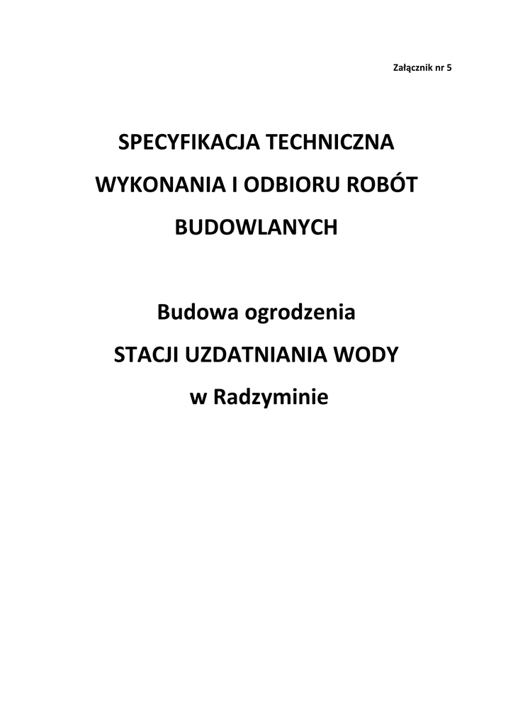 Załącznik nr 5 SPECYFIKACJA TECHNICZNA WYKONANIA I ODBIORU ROBÓT BUDOWLANYCH Budowa ogrodzenia STACJI UZDATNIANIA WODY w Radzyminie SPIS TREŚCI 1. Wstęp 2. Wymagania dotyczące właściwości wyrobów i materiałów 3. Wymagania dotyczące wykonania robót budowlanych 4. Wymagania dotyczące sprzętu i maszyn 5. Wymagania dotyczące środków transportu 6. Wymagania dotyczące montażu elementów ogrodzenia 7. Wymagania dotyczące obmiaru robót 8. Odbiór robót 9. Płatności 10. Dokumenty odniesienia 11. Załącznik nr 1 do STWiORB 1. WSTĘP 1.1 Przedmiot i zakres specyfikacji Niniejsza specyfikacja obejmuje wymagania dotyczące usunięcia pozostałych elementów starego oraz wykonania i odbioru nowego ogrodzenia Stacji Uzdatniania Wody w Radzyminie przy ul. Batalionów Chłopskich 8. 1.2 Zakres robót objętych specyfikacją 1. Przedmiotem zamówienia jest rozbiórka istniejącego i budowa w tym samym miejscu nowego ogrodzenia Stacji Uzdatniania Wody przy ul. Batalionów Chłopskich 8 w Radzyminie. 2. Roboty budowlane obejmują: 1) Rozbiórkę istniejącego ogrodzenia o długości ok. 567 m, w tym brama o szerokości w świetle 4,70 m oraz dwie furtki o szerokości 1,2m. Istniejące ogrodzenie składa się z: - siatki - stalowych słupków posadowionych w betonowych fundamentach pod słupki - dwóch furtek - stalowej bramy przesuwnej 2) Budowę nowego ogrodzenia systemowego o długości ok. 560m po śladzie istniejącego ogrodzenia 3) Wstawienie nowej bramy przesuwnej o szerokości w świetle min. 4,7 m i dwóch furtek o szerokości 1,0 m. Ogrodzenie należy wykonać po śladzie istniejącego ogrodzenia zgodnie z załączoną mapą, nie przekraczając granicy działki. Ogrodzenie wykonać z paneli kratowych przetłaczanych trzykrotnie mocowanych do słupów wykonanych ze stalowych profili prostokątnych. Podmurówka ogrodzenia z prefabrykowanych elementów. Linię ogrodzenia dostosować do częściowo pochyłego ukształtowania terenu poprzez stopniowanie. Przyjęta wysokość stopni powinna być jednakowa. 4) zdjęcie z istniejącego ogrodzenia elektronicznego systemu zabezpieczenia SUW i ponowny jego montaż na nowym ogrodzeniu; 5) wyrównanie terenu wzdłuż istniejącego ogrodzenia na szerokości ok. 1,5m po obu stronach ogrodzenia wraz z obsianiem trawą; 6) wyrównanie terenu poprzez dowiezienie ok. 60 m3 wraz z rozplantowaniem ziemi wraz z obsianiem trawą 7) wykonanie inwentaryzacji nowego ogrodzenia 1.3 Określenia podstawowe „Zamawiający” – oznacza. Przedsiębiorstwo Wodociągów i Kanalizacji Sp. z o.o. w Radzyminie, ul. Komunalna 2, 05-250 Radzymin „Roboty” – oznacza stałe i tymczasowe roboty, które mają zostać wykonane (włączając projekty budowlane i wykonawcze, urządzenia i sprzęt, które mają być dostarczone) w ramach Kontraktów na Roboty zawartych z wykonawcami wyłonionymi w postępowaniu o udzielenie zamówienia publicznego. „Wykonawca” – oznacza osobę fizyczną, osobę prawną albo jednostkę organizacyjną nieposiadającą osobowości prawnej, która ubiega się o udzielenie zamówienia publicznego, złożyła ofertę lub zawarła umowę w sprawie zamówienia publicznego. Określenia podstawowe, użyte w niniejszej specyfikacji, są zgodne z obowiązującymi odpowiednimi normami. 1.4. Klasyfikacja robót wg Wspólnego Słownika Zamówień (CPV). Kod CPV – 45 00 00 00 – 7 Roboty budowlane 2. WYMAGANIA DOTYCZĄCE WŁAŚCIWOŚCI WYROBÓW I MATERIAŁÓW 2.1 Parametry techniczne nowego ogrodzenia Słupki: Słupki profilowane wykonane z kształtowników prostokątnych o wymiarach min. 60x40 mm, zamykanych od góry daszkami z mrozoodpornego tworzywa sztucznego. Słupki ocynkowane i malowane proszkowo w kolorze RAL. Wysokość słupka 2 300 mm. Panele: • panele zgrzewane z pojedynczych drutów poziomych i pionowych, • ocynkowane ogniowo i malowane proszkowo w kolorze zielonym, • wysokość przyjętych paneli kratowych min. 150 cm ±3cm, przy czym nie dopuszcza się zróżnicowania wysokości paneli na długości całego ogrodzenia, • szerokość przyjętych paneli kratowych 250 ±5cm – nie dotyczy przęseł skrajnych, • przekrój drutów paneli kratowych – min. Ø 5 mm, • wymiary oczka paneli kratowych (wysokość x szerokość) nie większe jak 200x50 mm, • każdy panel powinien mieć co najmniej 3 przetłoczenia poziome zapewniające jego sztywność, • panele montować do słupków systemowymi łącznikami, ocynkowanymi i malowanymi proszkowo w kolorze paneli ogrodzenia. Brama: • brama przesuwna o szerokości w świetle min. 4,7 m • kolor bramy taki sam jak paneli ogrodzeniowych Cokół: • cokół ma być wykonany z prefabrykowanych betonowych elementów podmurówki systemowej, • wysokość podmurówki min.25 cm, długość desek betonowych odpowiednio dobrane do systemowego rozstawu słupów • łączniki podmurówki odpowiednie do słupów ogrodzenia. Ogrodzenie nie może posiadać ostro zakończonych krawędzi i elementów wieńczących. Wszystkie montowane ogrodzenia muszą posiadać odpowiednie świadectwa bezpieczeństwa i dopuszczenia do stosowania w obiektach użyteczności publicznej. Wykonawca ponosi odpowiedzialność za spełnienie wymagań ilościowych i jakościowych wyrobów dostarczanych na plac budowy oraz za ich właściwe składowanie i wbudowanie. 3. WYMAGANIA DOTYCZĄCE WYKONANIA ROBÓT BUDOWLANYCH 3.1 Wymagania ogólne Przed przystąpieniem do wykonawstwa należy zabezpieczyć i oznaczyć teren budowy. 3.2 Tyczenie Ogrodzenie będzie przebiegało po śladzie istniejącego ogrodzenia. 3.3 Prace porządkowe Wykonawca odpowiada za sukcesywny wywóz z terenu budowy elementów pozostałych z rozbiórki, usunięcie wszelkich uszkodzeń wynikłych w czasie prowadzenia robót, a nie występujących w momencie przekazania placu budowy oraz za likwidacje wszystkich robót tymczasowych, niezbędnych do realizacji przedmiotu zamówienia. Teren budowy należy uporządkować. 4. WYMAGANIA DOT
