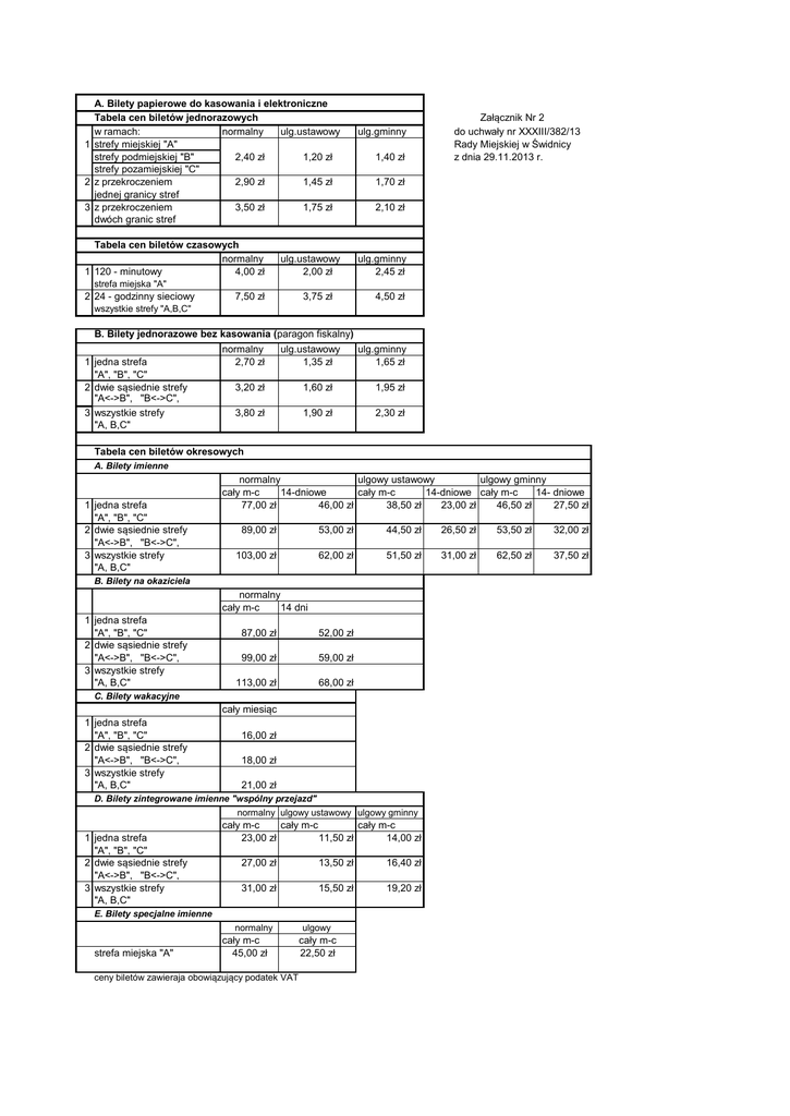 A. Bilety papierowe do kasowania i elektroniczne Tabela cen biletów jednorazowych w ramach: normalny ulg.ustawowy 1 strefy miejskiej "A" strefy podmiejskiej "B" 2,40 zł 1,20 zł strefy pozamiejskiej "C" 2 z przekroczeniem 2,90 zł 1,45 zł jednej granicy stref 3 z przekroczeniem 3,50 zł 1,75 zł dwóch granic stref Tabela cen biletów czasowych normalny 1 120 - minutowy 4,00 zł ulg.ustawowy 2,00 zł ulg.gminny 1,40 zł Załącznik Nr 2 do uchwały nr XXXIII/382/13 Rady Miejskiej w Świdnicy z dnia 29.11.2013 r. 1,70 zł 2,10 zł ulg.gminny 2,45 zł strefa miejska "A" 2 24 - godzinny sieciowy 7,50 zł 3,75 zł 4,50 zł wszystkie strefy "A,B,C" B. Bilety jednorazowe bez kasowania (paragon fiskalny) 1 jedna strefa "A", "B", "C" 2 dwie sąsiednie strefy "A<->B", "B<->C", 3 wszystkie strefy "A, B,C" normalny 2,70 zł ulg.ustawowy 1,35 zł ulg.gminny 1,65 zł 3,20 zł 1,60 zł 1,95 zł 3,80 zł 1,90 zł 2,30 zł Tabela cen biletów okresowych A. Bilety imienne 1 jedna strefa "A", "B", "C" 2 dwie sąsiednie strefy "A<->B", "B<->C", 3 wszystkie strefy "A, B,C" normalny ulgowy ustawowy ulgowy gminny cały m-c 14-dniowe cały m-c 14-dniowe cały m-c 14- dniowe 77,00 zł 46,00 zł 38,50 zł 23,00 zł 46,50 zł 27,50 zł 89,00 zł 53,00 zł 44,50 zł 26,50 zł 53,50 zł 32,00 zł 103,00 zł 62,00 zł 51,50 zł 31,00 zł 62,50 zł 37,50 zł B. Bilety na okaziciela normalny cały m-c 14 dni 1 jedna strefa "A", "B", "C" 2 dwie sąsiednie strefy "A<->B", "B<->C", 3 wszystkie strefy "A, B,C" 87,00 zł 52,00 zł 99,00 zł 59,00 zł 113,00 zł 68,00 zł C. Bilety wakacyjne cały miesiąc 1 jedna strefa "A", "B", "C" 2 dwie sąsiednie strefy "A<->B", "B<->C", 3 wszystkie strefy "A, B,C" 16,00 zł 18,00 zł 21,00 zł D. Bilety zintegrowane imienne "wspólny przejazd" normalny ulgowy ustawowy ulgowy gminny 1 jedna strefa "A", "B", "C" 2 dwie sąsiednie strefy "A<->B", "B<->C", 3 wszystkie strefy "A, B,C" cały m-c cały m-c cały m-c 23,00 zł 11,50 zł 14,00 zł 27,00 zł 13,50 zł 16,40 zł 31,00 zł 15,50 zł 19,20 zł E. Bilety specjalne imienne normalny strefa miejska "A" cały m-c 45,00 zł ceny biletów zawieraja obowiązujący podatek VAT ulgowy cały m-c 22,50 zł