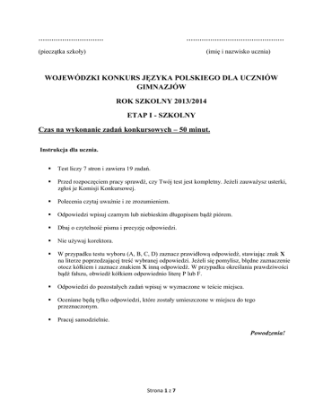 ………………………… ……………………………………… (pieczątka szkoły) (imię i nazwisko ucznia) WOJEWÓDZKI KONKURS JĘZYKA POLSKIEGO DLA UCZNIÓW GIMNAZJÓW ROK SZKOLNY 2013/2014 ETAP I - SZKOLNY Czas na wykonanie zadań konkursowych – 50 minut. Instrukcja dla ucznia. Test liczy 7 stron i zawiera 19 zadań. Przed rozpoczęciem pracy sprawdź, czy Twój test jest kompletny. Jeżeli zauważysz usterki, zgłoś je Komisji Konkursowej. Polecenia czytaj uważnie i ze zrozumieniem. Odpowiedzi wpisuj czarnym lub niebieskim długopisem bądź piórem. Dbaj o czytelność pisma i precyzję odpowiedzi. Nie używaj korektora. W przypadku testu wyboru (A, B, C, D) zaznacz prawidłową odpowiedź, stawiając znak X na literze poprzedzającej treść wybranej odpowiedzi. Jeżeli się pomylisz, błędne zaznaczenie otocz kółkiem i zaznacz znakiem X inną odpowiedź. W przypadku określania prawdziwości bądź fałszu, obwiedź kółkiem odpowiednio literę P lub F. Odpowiedzi do pozostałych zadań wpisuj w wyznaczone w teście miejsca. Oceniane będą tylko odpowiedzi, które zostały umieszczone w miejscu do tego przeznaczonym. Pracuj samodzielnie. Powodzenia! Strona 1 z 7 TEKST I Kontaminacja, czyli krzyżowanie dwóch konstrukcji, to jedno z najbardziej żywotnych zjawisk językowych. Ze skrzyżowań powstają nowe wyrazy, np. bajoro – to skutek połączenia bagna i jeziora, chwytać – dawniejszych chwatać i chytać [….]; współczesny i dość dziwaczny spodnium powstał z kolei ze skrzyżowania spodni z kostiumem. Lubią tego typu zabawy słowotwórcze autorzy utworów dla dzieci. I tak np. w Krześlakach z rozwianą grzywą Joanny Kulmowej […] mamy […] windora (winda i indor), lampuchę ( lampa i mucha), stołunia (stół i słoń), odchmurzacze (odkurzacz i chmura) itp. Przykłady można mnożyć. Kontaminacja jest także współcześnie źródłem konstrukcji uchodzących za błędne. Błędne na wskutek – to typowe skrzyżowanie równorzędnych wyrażeń na skutek i wskutek, popularne w każdym bądź razie powstało z „krzyżówki” w każdym razie i bądź co bądź, błędny zwrot do jednych z najwybitniejszych należy stanowi kontaminację poprawnych konstrukcji jednym z najwybitniejszych i do najwybitniejszych należy. A co z imiesłowami od czasowników przekonywać, dokonywać? Czego się to nie słyszy: przekonywujący, przekonujący, przekonywający, dokonujący, dokonywujący, dokonywający! Czy wszystkie te formy są poprawne? – pytają często Czytelnicy […]. Zacząć trzeba od stwierdzenia, że czasowniki typu przekonywać, dokonywać […] odmieniały się kiedyś tylko w następujący sposób: przekonywam, przekonywasz, przekonywa, przekonywamy, przekonywacie, przekonywają. Pod wpływem liczniejszej grupy czasowników typu – uję, - ujesz ( maluję – malujesz, kupuję – kupujesz) wytworzył się nowy typ odmiany, dziś już prawie wyłączny, a mianowicie: przekonuję, przekonujesz, przekonuje, przekonujemy, przekonujecie, przekonują. Stary model konstrukcyjny tkwi jednak jeszcze w świadomości językowej Polaków. […] Myślę, że po tym wyjaśnieniu nietrudno zbudować poprawne imiesłowy. Jeśli je wywiedziemy od starszego typu dokonywa, dokonywasz, [przekonywa, przekonywasz] itd., to powstaną poprawne formy dokonywający, […] przekonywający. Ponieważ ewolucja interesującej nas odmiany zmierza do wyłącznego funkcjonowania postaci dokonuję, dokonujesz, [ przekonuję, przekonujesz], warto szczególnie polecić poprawne i krótsze konstrukcje: dokonujący, […] przekonujący. Błędną „krzyżówką” są natomiast popularne postacie dokonywujący, przekonywujący itp. […] Ciekawe, jak potoczą się losy rywalizacji omówionych typów odmiany. […] Jan Miodek, Rzecz o języku. Szkice o współczesnej polszczyźnie, Wrocław, Ossolineum,1983. Przekonujący – przekonywający, s.123-125. 1.Na podstawie analizy przykładów kontaminacji z akapitu I napisz, jaka część mowy jest często wykorzystywana w procesie kontaminacji. …………………………………………………………………………………………………… 2. Odwołując się do treści akapitu I i II, zaznacz prawidłową odpowiedź. A. Kontaminacje są wyłącznie skutkiem zabawy z językiem, B. Kontaminacje są wyłącznie skutkiem kłopotów z językiem, C. Kontaminacje są skutkiem i zabawy z językiem, i kłopotów z językiem, D. Kontaminacje powstają w celach prowokowania innych użytkowników języka. Strona 2 z 7 3. Jaki typ imiesłowu stanowi zarówno forma przekonujący, jak i przekonywający? Podaj pełną nazwę tego typu imiesłowu. …………………………………………………………………………………………………… 4. W trzecim akapicie napisano: „Czego się to nie słyszy: przekonywujący, przekonujący, przekonywający, dokonujący, dokonywujący, dokonywający! Czy wszystkie te formy są poprawne? – pytają często Czytelnicy.” W odpowiedzi na zamieszczone w tym fragmencie pytanie przyporządkuj wyliczone formy wyrazowe - przekonywujący, przekonujący, przekonywający, dokonujący, dokonywujący, dokonywający - do odpowiednich rubryk poniższej tabeli. formy poprawne wywodzące się od starszego typu wywodzące się od odmiany czasownika: nowszego typu odmiany czasownika: formy niepoprawne: 5. Którą formę spośród obu poprawnych Jan Miodek wskazuje jako wartą polecenia: tę wywodzoną od starszego typu odmiany czasownika czy tę, którą tworzy się od nowego typu odmiany czasownika? Swoją odpowiedź zapisz, stosując zdanie pojedyncze rozwinięte. ……………………………………………………………………………………………………... …………………………………………………………………………………………………….. 6. Oceń prawdziwość poniższego zdania, wybierając P, jeśli informacja 