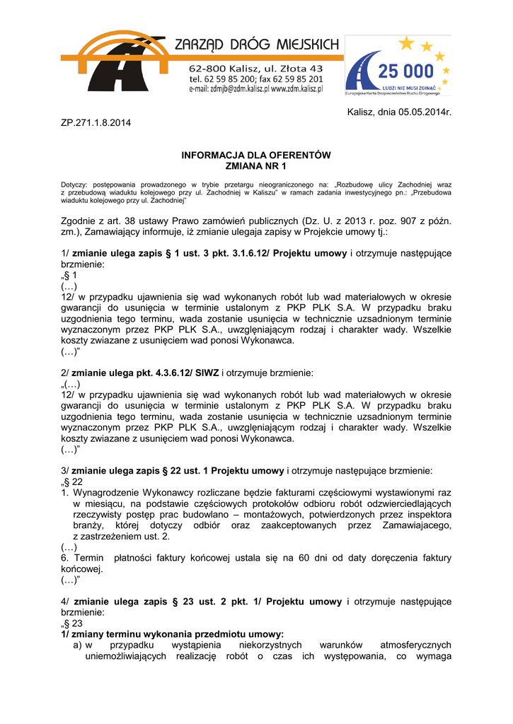 Kalisz, dnia 05.05.2014r. ZP.271.1.8.2014 INFORMACJA DLA OFERENTÓW ZMIANA NR 1 Dotyczy: postępowania prowadzonego w trybie przetargu nieograniczonego na: „Rozbudowę ulicy Zachodniej wraz z przebudową wiaduktu kolejowego przy ul. Zachodniej w Kaliszu” w ramach zadania inwestycyjnego pn.: „Przebudowa wiaduktu kolejowego przy ul. Zachodniej” Zgodnie z art. 38 ustawy Prawo zamówień publicznych (Dz. U. z 2013 r. poz. 907 z późn. zm.), Zamawiający informuje, iż zmianie ulegaja zapisy w Projekcie umowy tj.: 1/ zmianie ulega zapis § 1 ust. 3 pkt. 3.1.6.12/ Projektu umowy i otrzymuje następujące brzmienie: „§ 1 (…) 12/ w przypadku ujawnienia się wad wykonanych robót lub wad materiałowych w okresie gwarancji do usunięcia w terminie ustalonym z PKP PLK S.A. W przypadku braku uzgodnienia tego terminu, wada zostanie usunięcia w technicznie uzsadnionym terminie wyznaczonym przez PKP PLK S.A., uwzglęniającym rodzaj i charakter wady. Wszelkie koszty zwiazane z usunięciem wad ponosi Wykonawca. (…)” 2/ zmianie ulega pkt. 4.3.6.12/ SIWZ i otrzymuje brzmienie: „(…) 12/ w przypadku ujawnienia się wad wykonanych robót lub wad materiałowych w okresie gwarancji do usunięcia w terminie ustalonym z PKP PLK S.A. W przypadku braku uzgodnienia tego terminu, wada zostanie usunięcia w technicznie uzsadnionym terminie wyznaczonym przez PKP PLK S.A., uwzglęniającym rodzaj i charakter wady. Wszelkie koszty zwiazane z usunięciem wad ponosi Wykonawca. (…)” 3/ zmianie ulega zapis § 22 ust. 1 Projektu umowy i otrzymuje następujące brzmienie: „§ 22 1. Wynagrodzenie Wykonawcy rozliczane będzie fakturami częściowymi wystawionymi raz w miesiącu, na podstawie częściowych protokołów odbioru robót odzwierciedlających rzeczywisty postęp prac budowlano – montażowych, potwierdzonych przez inspektora branży, której dotyczy odbiór oraz zaakceptowanych przez Zamawiajacego, z zastrzeżeniem ust. 2. (…) 6. Termin płatności faktury końcowej ustala się na 60 dni od daty doręczenia faktury końcowej. (…)” 4/ zmianie ulega zapis § 23 ust. 2 pkt. 1/ Projektu umowy i otrzymuje następujące brzmienie: „§ 23 1/ zmiany terminu wykonania przedmiotu umowy: a) w przypadku wystąpienia niekorzystnych warunków atmosferycznych uniemożliwiających realizację robót o czas ich występowania, co wymaga potwierdzenia przez właściwego branżowego inspektora nadzoru inwestorskiego, wpisem do dziennika budowy; b) w przypadku wystąpienia konieczności wykonania robót dodatkowych, zamiennych a także zamówień dodatkowych, o których mowa w § 16 projektu umowy, określonych aneksem bądź odrębną umową, warunkujących prawidłowe wykonanie przedmiotu zamówienia, o czas niezbędny do wykonania robót, o których mowa wyżej, co wymaga potwierdzenia przez właściwego branżowego inspektora nadzoru inwestorskiego, wpisem do dziennika budowy c) ze względu na przedłużające się terminy uzgodnień, wydawania zgód, wydawania decyzji administracyjnych itd., na które Wykonawca nie miał wpływu a dołożył wszelkiej staranności w celu ich uzyskania o czas niezbędny do ich uzyskania , d) w przypadku wystąpienia kolizji niemożliwych do przewidzenia na etapie projektowania, a uniemożliwiających realizację robót objętych przedmiotem umowy, o czas niezbędny do ich usunięcia, co wymaga potwierdzenia przez inspektora nadzoru inwestorskiego, wpisem do dziennika budowy. (…)” 5/ zmianie ulega zapis § 23 ust. 2 pkt. 2/ Projektu umowy i otrzymuje następujące brzmienie: „§ 23 (…) 2/ Zmiany osobowe: Zamawiający dopuszcza możliwość zmiany kierownika budowy lub kierowników robót po uprzedniej pisemnej zgodzie Zamawiającego w wypadkach: a/ śmierci, choroby lub wypadku kierownika budowy lub kierowników robót b/ nie wywiązywania się kierownika budowy lub kierowników robót z obowiązków wynikających z umowy c/ jeżeli wymiana kierownika budowy lub kierowników robót stanie się konieczna z jakichkolwiek innych przyczyn niezależnych od Wykonawcy. Zmiana którejkolwiek z osób wskazanych wyżej w trakcie realizacji przedmiotu umowy, musi być uzasadniona przez Wykonawcę na piśmie wraz z kserokopią uprawnień (należy podać przyczyny) i wymaga pisemnego zaakceptowania przez Zamawiającego. Wykonawca musi przedłożyć Zamawiającemu propozycję zmiany, nie później niż na 10 dni przed planowanym skierowaniem do kierowania budową/robotami którejkolwiek z osób. Zamawiający zaakceptuje taką zmianę w terminie 10 dni roboczych od daty przedłożenia propozycji i wyłącznie wtedy, gdy kwalifikacje i doświadczenie wskazanych osób będą takie same lub wyższe od kwalifikacji i doświadczenia osób wymaganego postanowieniami Siwz. Wykonawca musi przedłożyć Zamawiającemu propozycję zmiany, w terminie 3 dni od momentu powzięcia wiadomości o konieczności dokonania zmiany. Zaakceptowana przez Zamawiającego zmiana którejkolwiek z osób, o których mowa wyżej winna być dokonana wpisem do dziennika budowy i nie wymaga zawarcia aneksu do niniejszej umowy. Skierowanie bez akceptacji Zamawiającego, do kierowania robotami innych osób niż wskazane w ofercie Wykonawcy stanowi podstawę odstąpienia od umowy przez Zamawiającego z przyczyn, za które odpowiedzialność ponosi Wykonawca. (…)” 6/ zmianie ulega zapis pkt. 21 ppkt. 2/ SIWZ i otrzymuje brzmienie: „(…) 2/ Zmiany osobowe: Zamawiający dopuszcza możliwość zmiany kierownika budowy lub kierowników robót po uprzedniej pisemnej zgodzie Zamawiającego w wypadkach: a/ śmierci, choroby lub wypadku kierownika budowy lub kierowników robót b/ nie wywiązywania się kierownika budowy lub kierowników robót z obowiązków wynikających z umowy c/ jeżeli wymiana kierownika budowy lub kierowników robót stanie się konieczna z jakichkolwiek innych przyczyn niezależnych od Wykonawcy. Zmiana którejkolwiek z osób wskazanych wyżej w trakcie realizacji przedmiotu umowy, m