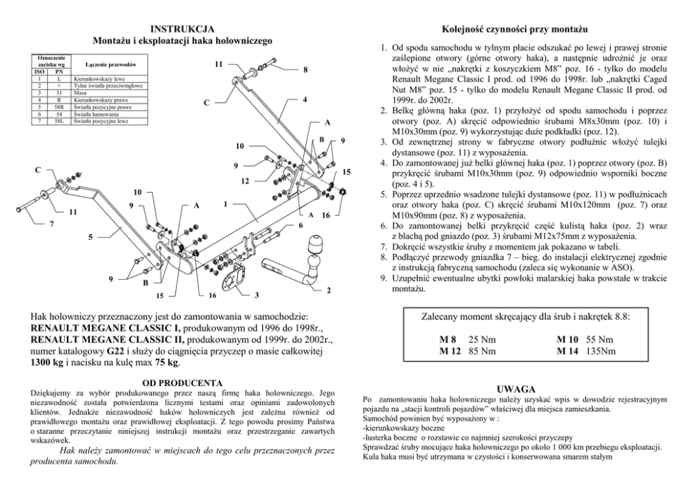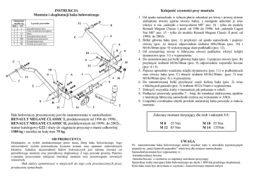INSTRUKCJA MontaŜu i eksploatacji haka holowniczego Oznaczenie zacisku wg ISO PN 1 L 2 + 3 31 4 R 5 58R 6 54 7 58L Kolejność czynności przy montaŜu 11 Łączenie przewodów Kierunkowskazy lewe Tylne światła przeciwmgłowe Masa Kierunkowskazy prawe Światła pozycyjne prawe Światła hamowania Światła pozycyjne lewe 8 4 C A B 10 9 9 C 15 12 10 1 A 9 11 A 7 16 6 5 9 B 15 16 3 2 Hak holowniczy przeznaczony jest do zamontowania w samochodzie: RENAULT MEGANE CLASSIC I, produkowanym od 1996 do 1998r., RENAULT MEGANE CLASSIC II, produkowanym od 1999r. do 2002r., numer katalogowy G22 i słuŜy do ciągnięcia przyczep o masie całkowitej 1300 kg i nacisku na kulę max 75 kg. OD PRODUCENTA Dziękujemy za wybór produkowanego przez naszą firmę haka holowniczego. Jego niezawodność została potwierdzona licznymi testami oraz opiniami zadowolonych klientów. JednakŜe niezawodność haków holowniczych jest zaleŜna równieŜ od prawidłowego montaŜu oraz prawidłowej eksploatacji. Z tego powodu prosimy Państwa o staranne przeczytanie niniejszej instrukcji montaŜu oraz przestrzeganie zawartych wskazówek. Hak naleŜy zamontować w miejscach do tego celu przeznaczonych przez producenta samochodu. 1. Od spodu samochodu w tylnym płacie odszukać po lewej i prawej stronie zaślepione otwory (górne otwory haka), a następnie udroŜnić je oraz włoŜyć w nie „nakrętki z koszyczkiem M8” poz. 16 - tylko do modelu Renault Megane Classic I prod. od 1996 do 1998r. lub „nakrętki Caged Nut M8” poz. 15 - tylko do modelu Renault Megane Classic II prod. od 1999r. do 2002r. 2. Belkę główną haka (poz. 1) przyłoŜyć od spodu samochodu i poprzez otwory (poz. A) skręcić odpowiednio śrubami M8x30mm (poz. 10) i M10x30mm (poz. 9) wykorzystując duŜe podkładki (poz. 12). 3. Od zewnętrznej strony w fabryczne otwory podłuŜnic włoŜyć tulejki dystansowe (poz. 11) z wyposaŜenia. 4. Do zamontowanej juŜ belki głównej haka (poz. 1) poprzez otwory (poz. B) przykręcić śrubami M10x30mm (poz. 9) odpowiednio wsporniki boczne (poz. 4 i 5). 5. Poprzez uprzednio wsadzone tulejki dystansowe (poz. 11) w podłuŜnicach oraz otwory haka (poz. C) skręcić śrubami M10x120mm (poz. 7) oraz M10x90mm (poz. 8) z wyposaŜenia. 6. Do zamontowanej belki przykręcić część kulistą haka (poz. 2) wraz z blachą pod gniazdo (poz. 3) śrubami M12x75mm z wyposaŜenia. 7. Dokręcić wszystkie śruby z momentem jak pokazano w tabeli. 8. Podłączyć przewody gniazdka 7 – bieg. do instalacji elektrycznej zgodnie z instrukcją fabryczną samochodu (zaleca się wykonanie w ASO). 9. Uzupełnić ewentualne ubytki powłoki malarskiej haka powstałe w trakcie montaŜu. Zalecany moment skręcający dla śrub i nakrętek 8.8: M 8 25 Nm M 12 85 Nm M 10 55 Nm M 14 135Nm UWAGA Po zamontowaniu haka holowniczego naleŜy uzyskać wpis w dowodzie rejestracyjnym pojazdu na „stacji kontroli pojazdów” właściwej dla miejsca zamieszkania. Samochód powinien być wyposaŜony w : -kierunkowskazy boczne -lusterka boczne o rozstawie co najmniej szerokości przyczepy Sprawdzać śruby mocujące haka holowniczego po około 1 000 km przebiegu eksploatacji. Kula haka musi być utrzymana w czystości i konserwowana smarem stałym PPUH AUTO-HAK S.J. WyposaŜenie haka: Produkcja Haków Holowniczych Henryk & Zbigniew Nejman 76-200 SŁUPSK ul. Słoneczna 16K tel/fax (059) 8-414-414; 8-414-413 E-mail: [email protected] www. autohak.com.pl Hak holowniczy bez wyposaŜenia elektrycznego Klasa: A50-X Nr kat. G22 Przeznaczony do zamontowania w samochodzie: Producent: RENAULT Model: MEGANE CLASSIC I produkowanym od 1996r. do 1998r. oraz Dane techniczne: Wartość siły D : 7,3 kN maksymalna masa przyczepy: 1300 kg maksymalny nacisk na kulę: 75 kg Model: MEGANE CLASSIC II produkowanym od 1999r. do 2002r. KARTA GWARANCYJNA Numer homologacji zgodnie z wytycznymi regulaminu EKG/ONZ 55.01: E20-55R-01 1133 Producent udziela gwarancji niniejszą kartą gwarancyjną na okres 24 miesięcy licząc od dnia zakupu haka holowniczego do samochodu: RENAULT MEGANE CLASSIC I produkowanego od 1996r. do 1998r. RENAULT MEGANE CLASSIC II produkowanego od 1999r. do 2002r. Data produkcji .............................. Data zakupu...................................... Zakres gwarancji obejmuje wyłącznie wady jakościowe wynikające z winy producenta. Gwarancja nie obejmuje natomiast uszkodzeń zawinionych przez nabywcę, wynikających z niewłaściwego montaŜu, uŜytkowania lub konserwacji, uszkodzeń mechanicznych, normalnego zuŜycia podczas eksploatacji itp. Gwarancja udzielona na zakupiony towar nie wyłącza, nie ogranicza ani nie zawiesza uprawnień kupującego wynikających z niezgodności towaru z umową. Reklamacje naleŜy zgłaszać w punkcie sprzedaŜy, składając jednocześnie kartę gwarancyjną. Usunięcie "wady" następuje po stwierdzeniu przez punkt sprzedaŜy wspólnie z producentem słuszności złoŜonej reklamacji. Reklamacja powinna być załatwiona w ciągu 14 dni od dnia uznania reklamacji. Karta gwarancyjna jest niewaŜna jeŜeli nie jest wypełniona i podpisana. Data zgłoszenia reklamacji: ................................................................... INFORMACJA WSTĘPNA Hak holowniczy jest skonstruowany zgodnie z zasadami bezpieczeństwa ruchu drogowego. Hak holowniczy jest elementem wpływającym na bezpieczeństwo jazdy i moŜe zostać zainstalowany wyłącznie przez personel wyspecjalizowany. Niedopuszczalne jest dokonywanie jakichkolwiek zmian w konstrukcji haka. Powoduje to wygaśniecie dopuszczenia do stosowania. W przypadku obecności masy izolacyjnej lub osłony podwozia w miejscu przylegania haka, naleŜy ją usunąć. Nieosłonięte miejsca karoserii oraz wywiercone otwory naleŜy pomalować farbą antykorozyjną. Informacjami wiąŜącymi odnośnie wartości obciąŜeń są dane podawane przez producenta samochodu, względnie wartości maksymalnej masy przyczepy oraz maksymalnego nacisku na kulę, przy czym war