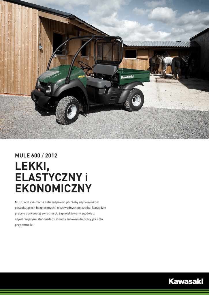 MULE 600 / 2012 LEKKI, ELASTYCZNY i EKONOMICZNY MULE 600 2x4 ma na celu zaspokoić potrzeby użytkowników poszukujących bezpiecznych i niezawodnych pojazdów. Narzędzie pracy o doskonałej zwrotności. Zaprojektowany zgodnie z najostrzejszymi standardami idealny zarówno do pracy jak i dla przyjemności. 31 800 PLN Opis MULE 600 / 2012 SILNIK CHŁODZONY POWIETRZEM DESKA ROZDZIELCZA Schowek boczny ZAWIESZENIE Schowek więcej informacji na: www.kawasaki.pl/MULE600 © 2012 Kawasaki Motors Europe N.V. Akcesoria Podstawowy zestaw kabiny MULE 600 / 2012 Zestaw miękkich drzwi Wykładzina skrzynki ładunkowej Więcej akcesoriów Główka haka holowniczego Wyciągarka (Warn 2500Lb/1134kg) Wyciągarka (ATV 2300Lb/1043kg) już od Rolki prowadzące więcej informacji na: www.kawasaki.pl/MULE600 © 2012 Kawasaki Motors Europe N.V. Specyfikacja MULE 600 / 2012 Silnik Typ silnika Chłodzony powietrzem, OHV, 4-suwowy, 1-cylindrowy Pojemność silnika 401 cm3 Przeniesienie napędu Układ przeniesienia napędu 1-biegowy automat plus bieg wsteczny Przełożenie napędu Dyferencjał o dwóch trybach pracy Rama Skok przedniego zawieszenia 78mm Skok tylnego zawieszenia 78.7mm Opony, przód 22 x 9-10 (bezdętkowe) Opony, tył 22 x 11-10 (bezdętkowe) Zawieszenie Przednie zawieszenie Niezależna kolumna MacPhersona Tylne zawieszenie Wahacz Hamulce Hamulce przednie Podwójne bębny hydrauliczne Hamulce tylne Podwójne bębny hydraulczne Wymiary Wymiary (D x S x W) 2,720 x 1,335 x 1,781mm Rozstaw osi 1,779mm Prześwit 155mm Pojemność zbiornika paliwa 15,5 l Masa pojazdu gotowego do użytku 429 kg Osiągi Moc maksymalna 9.2 kW (12.5 KM)/3,800 rpm Maksymalny moment obrotowy 27.9N·m (2.8kgf·m)/2,200rpm więcej informacji na: www.kawasaki.pl/MULE600 © 2012 Kawasaki Motors Europe N.V.