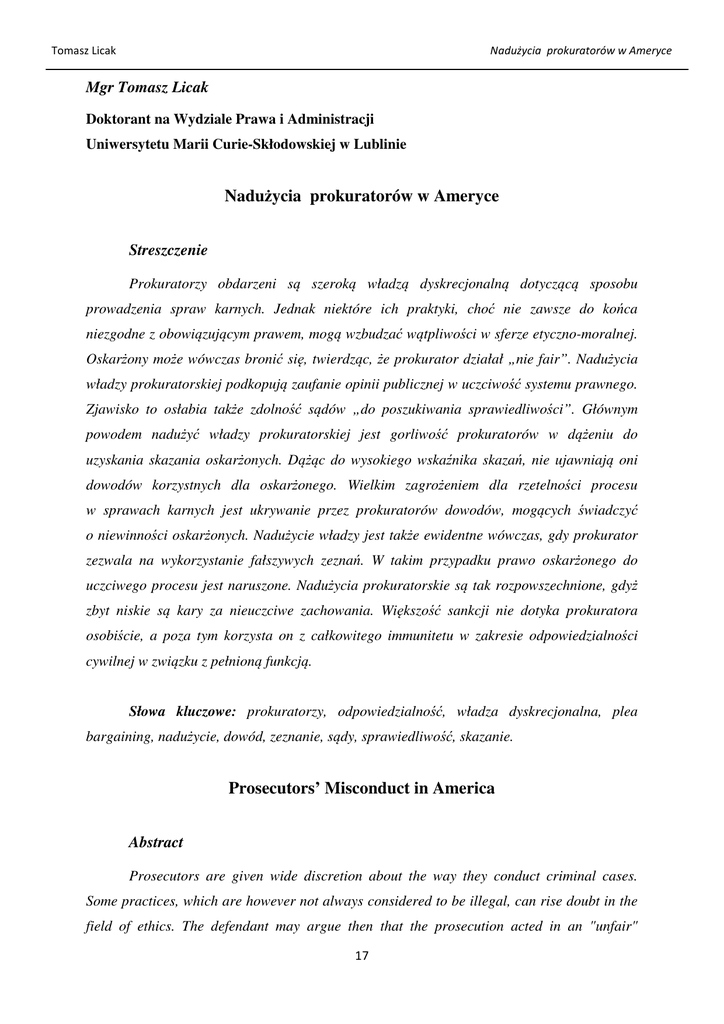 Tomasz Licak Nadużycia prokuratorów w Ameryce Mgr Tomasz Licak Doktorant na Wydziale Prawa i Administracji Uniwersytetu Marii Curie-Skłodowskiej w Lublinie Nadużycia prokuratorów w Ameryce Streszczenie Prokuratorzy obdarzeni są szeroką władzą dyskrecjonalną dotyczącą sposobu prowadzenia spraw karnych. Jednak niektóre ich praktyki, choć nie zawsze do końca niezgodne z obowiązującym prawem, mogą wzbudzać wątpliwości w sferze etyczno-moralnej. Oskarżony może wówczas bronić się, twierdząc, że prokurator działał „nie fair”. Nadużycia władzy prokuratorskiej podkopują zaufanie opinii publicznej w uczciwość systemu prawnego. Zjawisko to osłabia także zdolność sądów „do poszukiwania sprawiedliwości”. Głównym powodem nadużyć władzy prokuratorskiej jest gorliwość prokuratorów w dążeniu do uzyskania skazania oskarżonych. Dążąc do wysokiego wskaźnika skazań, nie ujawniają oni dowodów korzystnych dla oskarżonego. Wielkim zagrożeniem dla rzetelności procesu w sprawach karnych jest ukrywanie przez prokuratorów dowodów, mogących świadczyć o niewinności oskarżonych. Nadużycie władzy jest także ewidentne wówczas, gdy prokurator zezwala na wykorzystanie fałszywych zeznań. W takim przypadku prawo oskarżonego do uczciwego procesu jest naruszone. Nadużycia prokuratorskie są tak rozpowszechnione, gdyż zbyt niskie są kary za nieuczciwe zachowania. Większość sankcji nie dotyka prokuratora osobiście, a poza tym korzysta on z całkowitego immunitetu w zakresie odpowiedzialności cywilnej w związku z pełnioną funkcją. Słowa kluczowe: prokuratorzy, odpowiedzialność, władza dyskrecjonalna, plea bargaining, nadużycie, dowód, zeznanie, sądy, sprawiedliwość, skazanie. Prosecutors’ Misconduct in America Abstract Prosecutors are given wide discretion about the way they conduct criminal cases. Some practices, which are however not always considered to be illegal, can rise doubt in the field of ethics. The defendant may argue then that the prosecution acted in an "unfair" 17 Ius et Administratio 4/2014 Wydział Prawa i Administracji Uniwersytetu Rzeszowskiego manner. Prosecutorial misconduct weakens public trust and compromises the integrity of the legal system. It also undermines the ability of the courts “to seek justice”. The main reason of the misconduct is focus on conviction. In the pursuit of high conviction rate they fail to turn over factual evidence that is favorable to the defendant. The great threat to fair process in criminal cases comes from prosecutor hiding evidence, which can indicate innocence of the defendant. Misconduct is also evident, when prosecutors allow the use of perjured testimony. In such a case defendant's right to a fair trial is violated. Prosecutorial misconduct is so widespread because of the inadequacy of penalties applied in the event of unethical behavior. Most of the sanctions do not hold prosecutors personally accountable and their immunity protects them from any civil liability that might arise due to their work. Key words: prosecutors, liability, discretion, plea bargaining, misconduct, evidence, testimony, courts, justice, conviction. 1. Bezprawie prokuratorskie Stereotypowy obraz wymiaru sprawiedliwości Stanów Zjednoczonych Ameryki to sala sądowa z sędzią ubranym w czarną togę, adwokatem, oskarżonym oraz bierną raczej ławą przysięgłych. W rzeczywistości jednak większość wyroków skazujących osiągana jest drogą negocjacji (plea bargain – 90%). W sprawie Brady v. Maryland Sąd Najwyższy Stanów Zjednoczonych Ameryki stwierdził iż: „Społeczeństwo wygrywa wtedy, gdy winny zostaje skazany, ale pod warunkiem, że proces został przeprowadzony rzetelnie. Wymiar sprawiedliwości ponosi natomiast porażkę, jeśli oskarżony jest traktowany nie fair”1. Badania wykazały, iż większość prawników decydujących się zostać prokuratorami w Ameryce, to ludzie kierujący się zasadami etyki. Jednak istnieją liczne pokusy, takie jak na przykład ambicje polityczne, presja medialna i kultura prokuratorskiej nieomylności, które sprawiają, iż prokuratorzy postępują nieetycznie. Bardzo znamienne są w tym kontekście słowa jednego z byłych Prokuratorów Generalnych Stanów Zjednoczonych Ameryki Roberta Jacksona: „Prokurator ma większą kontrolę nad życiem, wolnością i reputacją innych ludzi niż jakakolwiek inna osoba w Ameryce. Jego władza uznaniowa jest ogromna (…) Jeśli działa on w dobrej wierze – jest jedną z najważniejszych instytucji w państwie. Kiedy jednak 1 Brady v. Maryland 373 U.S. 83, 87 (1963), An Epidemic of Prosecutor Misconduct, Center for Prosecutor Integrity 2013, s. 1. 18 Tomasz Licak Nadużycia prokuratorów w Ameryce działa w złej wierze lub z innych niskich pobudek, wówczas jest jednym z największych zagrożeń społecznych”2. Szacunki dotyczące błędów sądowych różnią się między sobą. Przeprowadzona w 2007 roku analiza osób skazanych na karę śmierci od 1973 do 2004 wykazała 2,3 % odsetek uniewinnień. Ostatnio przeprowadzone analizy dotyczące więźniów w stanie Virginia dowiodły, iż 15 % skazanych za przestępstwo zgwałcenia zostało później uniewinnionych ze względu na niezgodność próbek DNA. Całymi latami społeczeństwo amerykańskie było przekonane, iż prokuratorzy działają w sposób uczciwy i kierują się w swojej pracy jasnymi zasadami etycznymi. Dopiero w latach 90 ubiegłego stulecia prasa ujawniła przypadki nadużyć władzy przez prokuratorów3. Na szczególną uwagę w kontekście mściwości prokuratorskiej zasługuje książka Angeli J. Davis pod tytułem Arbitralna sprawiedliwość: Władza amerykańskich prokuratorów (Arbitrary Justice: The Power of the American Prosecutor). Autorka stawia w niej hipotezę, iż to właśnie Sąd Najwyższy Stanów Zjednoczonych Ameryki ponosi główną odpowiedzialność za wspieranie kultury, w której prokuratorzy maj