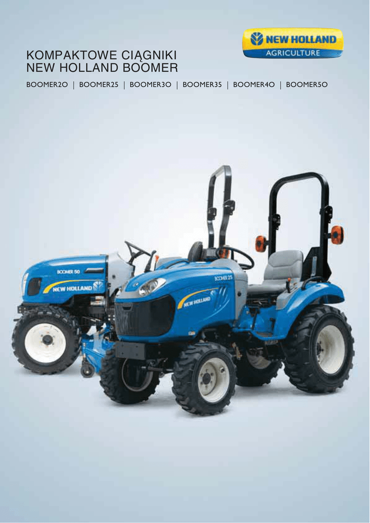 KOMPAKTOWE CIÑGNIKI NEW HOLLAND BOOMER BOOMER2O I BOOMER25 I BOOMER3O I BOOMER35 I BOOMER4O I BOOMER5O OD TERAZ TWOJA PRACA TO CZYSTA PRZYJEMNOÂå Nowe ciàgniki kompaktowe Boomer™ to niewielkie maszyny o wielkiej mocy, które sprawdzà si´ idealnie podczas prac ogrodowych, na roli, polach golfowych i na terenach zielonych w miastach. Znajdà równie˝ zastosowanie wÊród w∏aÊcicieli domów, mi∏oÊników ˝ycia na wsi, architektów krajobrazu i dzia∏kowców. Odznaczajà si´ one szybkà reakcjà na polecenia operatora, wydajnoÊcià, wygodà i konstrukcjà u∏atwiajàcà wykonywanie ka˝dej pracy. Dost´pnych jest szeÊç modeli o mocy wyjÊciowej od 23 do 47 KM. Ponadto ciàgniki Boomer oferujà niezawodnoÊç charakterystycznà dla du˝ych ciàgników, a tak˝e zwrotnoÊç i kompaktowe wymiary. Posiadajà one szereg funkcji, które zapewniajà komfort operatora, a jednoczeÊnie pozwalajà zaoszcz´dziç czas i pieniàdze. Na ka˝dym kroku mo˝na przekonaç si´, ˝e ciàgniki Boomer to kwintesencja jakoÊci. MOC, KTÓREJ POTRZEBUJESZ ¸ATWY SERWIS Ciche, oszcz´dne trzy- lub czterocylindrowe silniki zapewniajà odpowiednià moc potrzebnà do koszenia, kopania, odÊnie˝ania, uprawy i wielu innych zastosowaƒ. Wysokowydajny, dwupompowy uk∏ad hydrauliczny zapewnia szybkà reakcj´ narz´dzia na polecenia operatora i sterowanie. Ciàgniki Boomer sà ∏atwe w konserwacji, a dotarcie do punktów kontrolnych jest bezproblemowe. Podnoszona wysoko pokrywa zapewnia nieograniczony dost´p do silnika, akumulatora, ch∏odnicy oraz filtrów powietrza. PROSTA OBS¸UGA „Prostota” to s∏owo najlepiej okreÊlajàce ciàgniki Boomer. Elementy sterujàce sà na wyciàgni´cie r´ki, fotel i kierownic´ mo˝na wyregulowaç w zale˝noÊci od potrzeb operatora, a obszerna platforma robocza zapewnia wiele wolnej przestrzeni na nogi. Elementy sterujàce sà wyró˝nione kolorami i jasno oznakowane, co gwarantuje pewnoÊç przy wykonywaniu ka˝dej czynnoÊci. ˚ADNA PRACA NIE STANOWI PROBLEMU KOMFORT DZI¢KI SYNCHRONIZACJI Modele Boomer 30 i 35 wyposa˝one sà w przek∏adni´ 12x12 Synchro Shuttle™ w standardzie, natomiast modele Boomer 40 i 50 posiadajà przek∏adni´ 16x16 Synchro Shuttle™ w standardzie. Obie przek∏adnie zapewniajà p∏ynnà zmian´ biegów. Z racji tego, ˝e przek∏adnie sà zsynchronizowane, nie ma potrzeby ca∏kowitego zatrzymania ciàgnika w celu zmiany biegu jazdy do przodu na wsteczny, a wygodnie umiejscowiona dêwignia nawrotna po lewej stronie kierownicy sprawia, ˝e czynnoÊç ta jest wyjàtkowo prosta. Bez wzgl´du na to, czy nale˝y skosiç trawnik, przygotowaç nawierzchni´ padoku, wykopaç rów odwadniajàcy, uporzàdkowaç ogród, odÊnie˝yç, wyczyÊciç podwórze stajenne lub zamontowaç ogrodzenie, ciàgniki Boomer pomogà wykonaç ka˝dà z tych prac. Stworzono je z myÊlà o szybkiej wymianie narz´dzi celem b∏yskawicznego przystàpienia do wykonywania kolejnej czynnoÊci: • trzypunktowy uk∏ad zawieszenia kategorii I; • jeden tylny, zdalnie sterowany rozdzielacz hydrauliczny w standardzie dla modeli 20, 25, 30 i 35; • dwa tylne, zdalnie sterowane rozdzielacze hydrauliczne w standardzie dla modeli 40 i 50; • niezale˝ny, tylny WOM elektrohydrauliczny o pr´dkoÊci 540 obr./min w standardzie dla modeli 20, 25, 30 i 35; • niezale˝ny, tylny WOM elektrohydrauliczny o trzech pr´dkoÊciach (540/750/1000 obr./min) w standardzie dla modeli 40 i 50; • niezale˝ny, elektrohydrauliczny WOM mi´dzyosiowy, nap´dzajàcy narz´dzia montowane na Êrodku i z przodu w standardzie we wszystkich modelach hydrostatycznych. WYGODA DZI¢KI HYDROSTATYCE Modele Boomer 20 i 25 wyposa˝one sà w dwustopniowà przek∏adni´ hydrostatycznà z pojedynczym peda∏em jazdy natomiast modele Boomer od 30 do 50 posiadajà trzystopniowà przek∏adni´ hydrostatycznà. Cztery najwi´ksze modele z serii Boomer wyposa˝one sà w dwa peda∏y jazdy. We wszystkich ciàgnikach Boomer z przek∏adnià hydrostatycznà zmiana biegu i wybór odpowiedniej pr´dkoÊci sà bardzo proste. Ponadto przek∏adnie hydrostatyczne dzia∏ajà niezwykle g∏adko i cicho. GWARANCJA ZWROTNOÂCI I PRZYCZEPNOÂCI Ciàgnik Boomer zosta∏ skonstruowany tak, aby móg∏ poruszaç si´ w ograniczonych przestrzeniach. Z ∏atwoÊcià manewruje si´ nim i pokonuje przeszkody dzi´ki du˝emu przeÊwitowi nad gruntem. Nap´d na cztery ko∏a zapewnia wyjàtkowà przyczepnoÊç potrzebnà przy jeêdzie po trudnej nawierzchni. Gdy jazda staje si´ naprawd´ trudna, wystarczy wcisnàç peda∏ blokady mechanizmu ró˝nicowego, uruchamiajàc obie blokady tylnego mechanizmu ró˝nicowego naraz w celu uzyskania dodatkowej przyczepnoÊci, aby przejechaç przez zaspy, b∏oto i grzàskà, Êliskà nawierzchni´. NAJLEPSZA WIDOCZNOÂå Op∏ywowa pokrywa silnika nie tylko wspaniale wyglàda, ale tak˝e u∏atwia wykonywanie pracy dzi´ki wyjàtkowej widocznoÊci do przodu. Najlepszy pakiet oÊwietlenia na rynku zwi´ksza widocznoÊç i zapewnia bezpieczeƒstwo pracy wczesnym rankiem oraz wieczorem, oÊwietlajàc obszar roboczy zarówno z przodu, jak i po bokach. DANE TECHNICZNE MODELE BOOMER2O BOOMER25 BOOMER3O BOOMER35 BOOMER4O BOOMER5O Silnik Moc ca∏kowita (kW/KM) 17 / 23 20 / 27 21 / 28 28 / 38 30,6 / 41 35 / 47 Znamionowa pr´dkoÊç obrotowa (obr./min) 2700 2700 2600 2700 2600 2600 Typ 3-cylindrowy, wysokopr´˝ny (cm3) 1100 PojemnoÊç 4-cylindrowy, wysokopr´˝ny 1300 1500 (l) 25 25 33 33 36 36 (A) 50 50 50 50 50 50 Filtr powietrza 1800 2500 2500 Wymienny, suchy element Zbiornik paliwa Alternator Przek∏adnia Typ, mechaniczna/hydrostatyczna Maksymalna pr´dkoÊç jazdy do przodu: Seria HST+2 Seria 12x12/HST+3 Seria 16x16/HST+3 Bieg – (km/h), R4 – – 22,9 23,8 24,4 24,4 HST – (km/h), R4 15,2 15,2 23,8 24,8 22,7 22,7 Tempomat przy przek∏adni hydrostatycznej ● ● ● ● ● ● Rodzaj biegu/prze∏o˝enia – – Synchro Synchro Synchro Synchro W∏àczanie blokady mechaniz