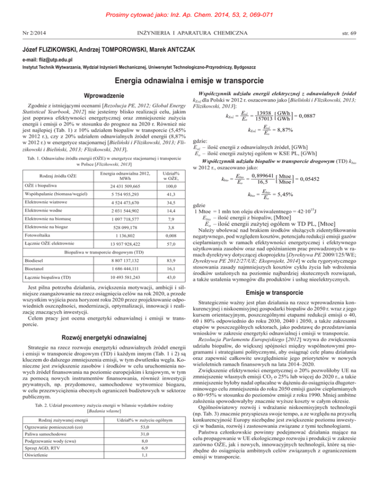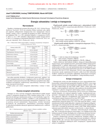 Prosimy cytować jako: Inż. Ap. Chem. 2014, 53, 2, 069-071 INŻYNIERIA I APARATURA CHEMICZNA Nr 2/2014 str. 69 Józef FLIZIKOWSKI, Andrzej TOMPOROWSKI, Marek ANTCZAK e-mail: [email protected] Instytut Technik Wytwarzania, Wydział Inżynierii Mechanicznej, Uniwersytet Technologiczno-Przyrodniczy, Bydgoszcz Energia odnawialna i emisje w transporcie Wprowadzenie Zgodnie z istniejącymi ocenami [Rezolucja PE, 2012; Global Energy Statistical Yearbook, 2012] nie jesteśmy blisko realizacji celu, jakim jest poprawa efektywności energetycznej oraz zmniejszenie zużycia energii i emisji o 20% w stosunku do prognoz na 2020 r. Również nie jest najlepiej (Tab. 1) z 10% udziałem biopaliw w transporcie (5,45% w 2012 r.), czy z 20% udziałem odnawialnych źródeł energii (8,87% w 2012 r.) w energetyce stacjonarnej [Bieliński i Flizikowski, 2013; Flizikowski i Bieliński, 2013; Flizikowski, 2013]. Tab. 1. Odnawialne źródła energii (OŹE) w energetyce stacjonarnej i transporcie w Polsce [Flizikowski, 2013] Rodzaj źródła OŹE Energia odnawialna 2012, MWh Udział% w OŹE, Współczynnik udziału energii elektrycznej z odnawialnych źródeł kEoź dla Polski w 2012 r. oszacowano jako [Bieliński i Flizikowski, 2013; Flizikowski, 2013]: El 13938 GWh = B 0, 0887 8 kEozl = oz = Eo 157013 GWh kEozl = Eozl = 8, 87% Eo gdzie: Eoź – ilość energii z odnawialnych źródeł, [GWh] Eo – ilość energii zużytej ogółem w KSE PL, [GWh] Współczynnik udziału biopaliw w transporcie drogowym (TD) kbio w 2012 r., oszacowano jako: kbio = Ebio 0, 899641 Mtoe = 8 Mtoe B = 0, 05452 Eo 16, 5 OŹE i biopaliwa 24 431 509,665 100,0 Współspalanie (biomasa/węgiel) 5 754 955,293 41,3 kbio = Elektrownie wiatrowe 4 524 473,670 34,5 Elektrownie wodne 2 031 544,902 14,4 Elektrownie na biomasę 1 097 718,577 7,9 gdzie 1 Mtoe = 1 mln ton oleju ekwiwalentnego = 42·1015J Ebio – ilość energii z biopaliw, [Mtoe] 528 099,178 3,8 1 136,802 0,008 13 937 928,422 57,0 Elektrownie na biogaz Fotowoltaika Łącznie OŹE elektrownie Biopaliwa w transporcie drogowym (TD) Biodiesel 8 807 137,132 83,9 Bioetanol 1 686 444,111 16,1 Łącznie biopaliwa (TD) 10 493 581,243 43,0 Jest pilna potrzeba działania, zwiększenia motywacji, ambicji i silniejsze zaangażowanie na rzecz osiągnięcia celów na rok 2020, a przede wszystkim wyjścia poza horyzont roku 2020 przez projektowanie odpowiednich oszczędności, modernizacji, optymalizacji, innowacji i realizację znaczących inwestycji. Celem pracy jest ocena energetyki odnawialnej i emisji w transporcie. Rozwój energetyki odnawialnej Strategie na rzecz rozwoju energetyki odnawialnych źródeł energii i emisji w transporcie drogowym (TD) i każdym innym (Tab. 1 i 2) są kluczem do dalszego zmniejszenia emisji, w tym dwutlenku węgla. Konieczne jest zwiększenie zasobów i środków w celu uruchomienia nowych źródeł finansowania na poziomie europejskim i krajowym, w tym za pomocą nowych instrumentów finansowania, również inwestycji prywatnych, np. przydomowe, samochodowe wytwornice biogazu, w celu przezwyciężenia obecnych ograniczeń budżetowych w sektorze publicznym. Tab. 2. Udział procentowy zużycia energii w bilansie wydatków rodziny [Badania własne] Rodzaj zużywanej energii Udział% w zużyciu ogólnym Ogrzewanie pomieszczeń (co) 53,0 Paliwa samochodowe 31,0 Podgrzewanie wody (cwu) 8,0 Sprzęt AGD, RTV 6,9 Oświetlenie 1,1 Ebio = 5, 45% Eo Eo – ilość energii zużytej ogółem w TD PL, [Mtoe] Należy ubolewać nad brakiem środków służących zidentyfikowaniu negatywnego, pod względem kosztów, potencjału redukcji emisji gazów cieplarnianych w ramach efektywności energetycznej i efektywnego użytkowania zasobów oraz nad opóźnianiem prac prowadzonych w ramach dyrektywy dotyczącej ekoprojektu [Dyrektywa PE 2009/125/WE; Dyrektywa PE 2012/27/UE; Ekoprojekt, 2014] w celu rygorystycznego stosowania zasady najmniejszych kosztów cyklu życia lub wdrożenia środków ustalonych na poziomie najbardziej skutecznych rozwiązań, a także ustalenia wymogów dla produktów i usług nieelektrycznych. Emisje w transporcie Strategicznie ważny jest plan działania na rzecz wprowadzenia konkurencyjnej i niskoemisyjnej gospodarki biopaliw do 2050 r. wraz z jego kursem orientacyjnym, poszczególnymi etapami redukcji emisji o 40, 60 i 80% odpowiednio do roku 2030, 2040 i 2050, a także zakresami etapów w poszczególnych sektorach, jako podstawę do przedstawiania wniosków w zakresie energetyki odnawialnej i emisji w transporcie. Rezolucja Parlamentu Europejskiego [2012] wzywa do zwiększenia udziału biopaliw, do większej spójności między wspólnotowymi programami i strategiami politycznymi, aby osiągnąć cele planu działania oraz zapewnić całkowite uwzględnienie jego priorytetów w nowych wieloletnich ramach finansowych na lata 2014–2020. Zwiększenie efektywności energetycznej o 20% pozwoliłoby UE na zmniejszenie własnych emisji CO2 o 25% lub więcej do 2020 r., a takie zmniejszenie byłoby nadal opłacalne w dążeniu do osiągnięcia długoterminowego celu zmniejszenia do roku 2050 emisji gazów cieplarnianych o 80÷95% w stosunku do poziomów emisji z roku 1990. Mniej ambitne założenia spowodowałyby znacznie wyższe koszty w całym okresie. Ogólnoświatowy rozwój i wdrażanie niskoemisyjnych technologii (np. Tab. 3) znacznie przyspiesza swoje tempo, a ze względu na przyszłą konkurencyjność Europy niezbędne jest zwiększenie poziomu inwestycji w badania, rozwój i zastosowania związane z tymi technologiami. Państwa członkowskie powinny podejmować działania mające na celu propagowanie w UE ekologicznego rozwoju i produkcji w zakresie zarówno OŹE, jak i nowych, innowacyjnych technologii, które są niezbędne do osiągnięcia ambitnych celów związanych z ograniczeniem emisji w transporcie. Prosimy cytować jako: Inż. Ap. Chem. 2014, 53, 2, 069-071 INŻYNIERIA I APARATURA CHEMICZNA str. 70 Nr 2/2014 Tab. 3. Ogólna emisja gaz