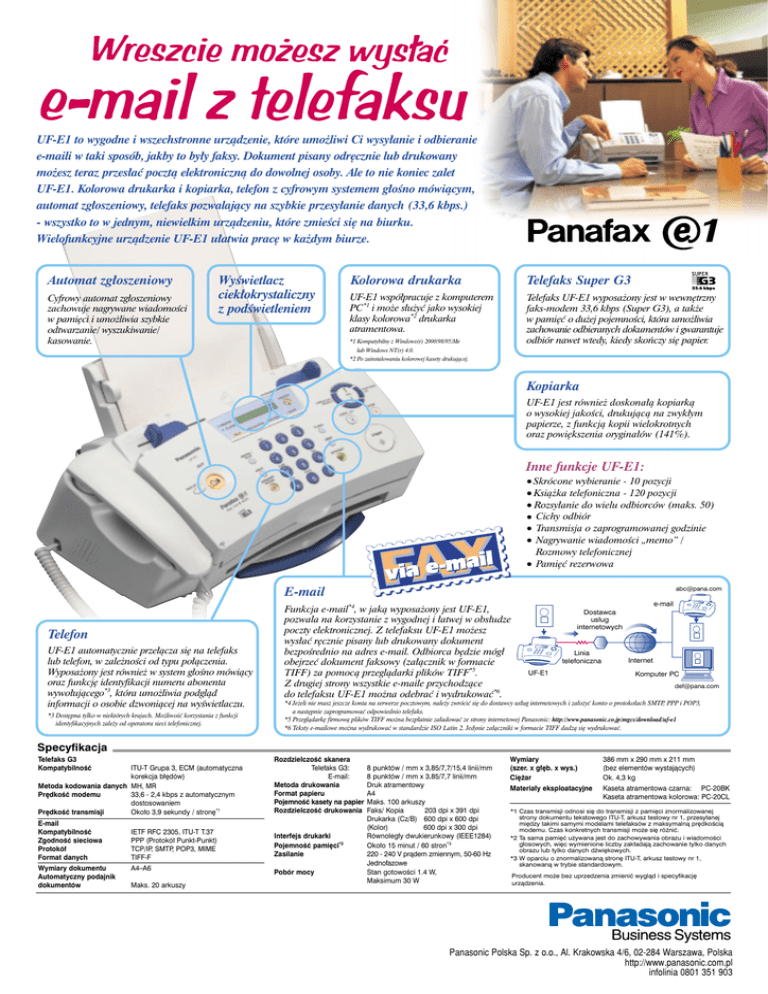 UF-E1 to wygodne i wszechstronne urzàdzenie, które umo˝liwi Ci wysy∏anie i odbieranie e-maili w taki sposób, jakby to by∏y faksy. Dokument pisany odr´cznie lub drukowany mo˝esz teraz przes∏aç pocztà elektronicznà do dowolnej osoby. Ale to nie koniec zalet UF-E1. Kolorowa drukarka i kopiarka, telefon z cyfrowym systemem g∏oÊno mówiàcym, automat zg∏oszeniowy, telefaks pozwalajàcy na szybkie przesy∏anie danych (33,6 kbps.) - wszystko to w jednym, niewielkim urzàdzeniu, które zmieÊci si´ na biurku. Wielofunkcyjne urzàdzenie UF-E1 u∏atwia prac´ w ka˝dym biurze. Automat zg∏oszeniowy Cyfrowy automat zg∏oszeniowy zachowuje nagrywane wiadomoÊci w pami´ci i umo˝liwia szybkie odtwarzanie/ wyszukiwanie/ kasowanie. WyÊwietlacz ciek∏okrystaliczny z podÊwietleniem Kolorowa drukarka Telefaks Super G3 UF-E1 wspó∏pracuje z komputerem PC*1 i mo˝e s∏u˝yç jako wysokiej klasy kolorowa*2 drukarka atramentowa. Telefaks UF-E1 wyposa˝ony jest w wewn´trzny faks-modem 33,6 kbps (Super G3), a tak˝e w pami´ç o du˝ej pojemnoÊci, która umo˝liwia zachowanie odbieranych dokumentów i gwarantuje odbiór nawet wtedy, kiedy skoƒczy si´ papier. *1 Kompatybilny z Windows(r) 2000/98/95/Me lub Windows NT(r) 4.0. *2 Po zainstalowaniu kolorowej kasety drukujàcej. Kopiarka UF-E1 jest równie˝ doskona∏à kopiarkà o wysokiej jakoÊci, drukujàcà na zwyk∏ym papierze, z funkcjà kopii wielokrotnych oraz powi´kszenia orygina∏ów (141%). Inne funkcje UF-E1: • Skrócone wybieranie - 10 pozycji • Ksià˝ka telefoniczna - 120 pozycji • Rozsy∏anie do wielu odbiorców (maks. 50) • Cichy odbiór • Transmisja o zaprogramowanej godzinie • Nagrywanie wiadomoÊci „memo” / • Rozmowy telefonicznej Pami´ç rezerwowa [email protected] E-mail e-mail *4 Telefon UF-E1 automatycznie prze∏àcza si´ na telefaks lub telefon, w zale˝noÊci od typu po∏àczenia. Wyposa˝ony jest równie˝ w system g∏oÊno mówiàcy oraz funkcj´ identyfikacji numeru abonenta wywo∏ujàcego*3, która umo˝liwia podglàd informacji o osobie dzwoniàcej na wyÊwietlaczu. *3 Dost´pna tylko w niektórych krajach. Mo˝liwoÊç korzystania z funkcji identyfikacyjnych zale˝y od operatora sieci telefonicznej. Funkcja e-mail , w jakà wyposa˝ony jest UF-E1, pozwala na korzystanie z wygodnej i ∏atwej w obs∏udze poczty elektronicznej. Z telefaksu UF-E1 mo˝esz wys∏aç r´cznie pisany lub drukowany dokument bezpoÊrednio na adres e-mail. Odbiorca b´dzie móg∏ obejrzeç dokument faksowy (za∏àcznik w formacie TIFF) za pomocà przeglàdarki plików TIFF*5. Z drugiej strony wszystkie e-maile przychodzàce do telefaksu UF-E1 mo˝na odebraç i wydrukowaç*6. Dostawca us∏ug internetowych Linia telefoniczna UF-E1 Internet Komputer PC [email protected] *4 Je˝eli nie masz jeszcze konta na serwerze pocztowym, nale˝y zwróciç si´ do dostawcy us∏ug internetowych i za∏o˝yç konto o protoko∏ach SMTP, PPP i POP3, a nast´pnie zaprogramowaç odpowiednio telefaks. *5 Przeglàdark´ firmowà plików TIFF mo˝na bezp∏atnie za∏adowaç ze strony internetowej Panasonic: http://www.panasonic.co.jp/mgcs/download/uf-e1 *6 Teksty e-mailowe mo˝na wydrukowaç w standardzie ISO Latin 2. Jedynie za∏àczniki w formacie TIFF dadzà si´ wydrukowaç. Specyfikacja ITU-T Grupa 3, ECM (automatyczna korekcja b∏´dów) Metoda kodowania danych MH, MR Pr´dkoÊç modemu 33,6 - 2,4 kbps z automatycznym dostosowaniem Pr´dkoÊç transmisji Oko∏o 3,9 sekundy / stron´*1 RozdzielczoÊç skanera Telefaks G3: E-mail: Metoda drukowania Format papieru PojemnoÊç kasety na papier RozdzielczoÊç drukowania E-mail KompatybilnoÊç ZgodnoÊç sieciowa Protokó∏ Format danych Interfejs drukarki PojemnoÊç pami´ci*2 Zasilanie Telefaks G3 KompatybilnoÊç Wymiary dokumentu Automatyczny podajnik dokumentów IETF RFC 2305, ITU-T T.37 PPP (Protokó∏ Punkt-Punkt) TCP/IP, SMTP, POP3, MIME TIFF-F A4_A6 Maks. 20 arkuszy Pobór mocy 8 punktów / mm x 3,85/7,7/15,4 linii/mm 8 punktów / mm x 3,85/7,7 linii/mm Druk atramentowy A4 Maks. 100 arkuszy Faks/ Kopia 203 dpi x 391 dpi Drukarka (Cz/B) 600 dpi x 600 dpi (Kolor) 600 dpi x 300 dpi Równoleg∏y dwukierunkowy (IEEE1284) Oko∏o 15 minut / 60 stron*3 220 - 240 V pràdem zmiennym, 50-60 Hz Jednofazowe Stan gotowoÊci 1.4 W, Maksimum 30 W Wymiary (szer. x g∏´b. x wys.) Ci´˝ar 386 mm x 290 mm x 211 mm (bez elementów wystajàcych) Ok. 4,3 kg Materia∏y eksploatacyjne Kaseta atramentowa czarna: PC-20BK Kaseta atramentowa kolorowa: PC-20CL *1 Czas transmisji odnosi si´ do transmisji z pami´ci znormalizowanej strony dokumentu tekstowego ITU-T, arkusz testowy nr 1, przesy∏anej mi´dzy takimi samymi modelami telefaksów z maksymalnà pr´dkoÊcià modemu. Czas konkretnych transmisji mo˝e si´ ró˝niç. *2 Ta sama pami´ç u˝ywana jest do zachowywania obrazu i wiadomoÊci g∏osowych, wi´c wymienione liczby zak∏adajà zachowanie tylko danych obrazu lub tylko danych dêwi´kowych. *3 W oparciu o znormalizowanà stron´ ITU-T, arkusz testowy nr 1, skanowanà w trybie standardowym. Producent mo˝e bez uprzedzenia zmieniç wyglàd i specyfikacj´ urzàdzenia. Panasonic Polska Sp. z o.o., Al. Krakowska 4/6, 02-284 Warszawa, Polska http://www.panasonic.com.pl infolinia 0801 351 903 Wielofunkcyjne urzàdzenie biurowe UF-E1 Druk atramentowy na zwyk∏ym papierze Telefaks wysy∏ajàcy e-maile Telefaks Super G3 Kolorowa drukarka atramentowa Kopiowanie na zwyk∏ym papierze Automat zg∏oszeniowy Cyfrowy system g∏oÊno mówiàcy