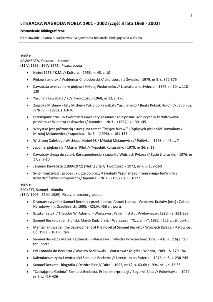 LITERACKA NAGRODA NOBLA 1901 - 2002 (część 3 lata 1968 - 2002)
