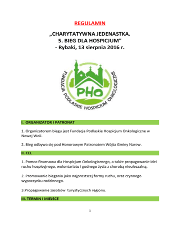 REGULAMIN „CHARYTATYWNA JEDENASTKA. 5. BIEG DLA HOSPICJUM” - Rybaki, 13 sierpnia 2016 r. I. ORGANIZATOR I PATRONAT 1. Organizatorem biegu jest Fundacja Podlaskie Hospicjum Onkologiczne w Nowej Woli. 2. Bieg odbywa się pod Honorowym Patronatem Wójta Gminy Narew. II. CEL 1. Pomoc finansowa dla Hospicjum Onkologicznego, a także propagowanie idei ruchu hospicyjnego, wolontariatu i godnego życia z chorobą nieuleczalną. 2. Promowanie biegania jako najprostszej formy ruchu, oraz czynnego wypoczynku rodzinnego. 3.Propagowanie zasobów turystycznych regionu. III. TERMIN I MIEJSCE 1 1. Bieg odbędzie się w sobotę 13 sierpnia 2016 r. we wsi Rybaki, na terenie gminy Narew. 2. Start nastąpi o godz. 10:00 sprzed budynku domu wypoczynkowego "Leśne Zacisze", Rybaki 1. 3. Długość trasy wynosi: 11 km. 4. Trasa biegu będzie prowadzić przez malownicze ścieżki leśne Puszczy Białowieskiej. IV. LIMIT CZASU 1. Zawodników obowiązuje limit czasu wynoszący 90 minut od momentu wystrzału startera. V. UCZESTNICTWO 1. Prawo startu mają wyłącznie te osoby, które urodziły się w roku 2001 lub wcześniej. 2. Warunkiem uczestnictwa jest prawidłowe wypełnienie formularza rejestracyjnego oraz wniesienia opłaty startowej. 3. Wypełnienie formularza rejestracyjnego i dokonanie opłaty rejestracyjnej jest jednoznaczne z akceptacją niniejszego regulaminu. 4. Ustalony przez Organizatora limit uczestników wynosi : 200 osób. VI. ZGŁOSZENIA 1. Zgłoszenia do biegu można dokonać do dnia 11 sierpnia 2016 r.: • Internetowo poprzez system rejestracji dostępny na stronie: www.elektronicznezapisy.pl • Osobiście w sklepie: Pędziwiatr - Podlaskie Centrum Biegowe, Białystok, ul. Białówny 4/12 2. Organizator zastrzega sobie prawo do wcześniejszego zamknięcia listy startowej, w momencie gdy odnotuje łączną ilość wpłat, równą ustalonemu limitowi uczestników. 2 3. W dniu zawodów zgłoszenie do biegu będzie możliwe pod warunkiem wcześniejszego nie wyczerpania limitu miejsc w regularnym terminie, w Biurze Zawodów w godz. 8:00 - 9:30. VII. OPŁATY 1. Szacowany koszt udziału uczestnika w biegu, który ponosi Organizator wynosi: 30,00 zł. Ze względu jednak na charytatywny wymiar biegu sugerujemy wniesienie darowizny nie mniejszej niż wspomniana kwota. 2. Opłatę należy wnosić na konto Fundacji z dopiskiem: „darowizna - bieg charytatywny” oraz z podanym imieniem i nazwiskiem uczestnika. Nr konta: 52 8060 0004 0551 0139 2000 0010 3. W dniu biegu będzie istniała możliwość wniesienia dobrowolnej darowizny do specjalnie przygotowanych skarbon kwestarskich. 4. Zebrane środki w całości zostaną przeznaczone na sfinansowanie opieki nad chorymi u kresu życia. 5. Za każdą sumę wniesioną powyżej kosztu udziału, podopieczni Podlaskiego Hospicjum Onkologicznego z serca pragną podziękować. VIII. KLASYFIKACJE 1. Każdy uczestnik kończący bieg będzie klasyfikowany na mecie wg zajętego miejsca i każdemu będzie mierzony czas z dokładnością do 1 sekundy stoperem elektronicznym. 2. Wyniki zostaną przedstawione w komunikacie końcowym i zamieszczone na stronie internetowej Fundacji. 3. Podczas biegu prowadzona będzie klasyfikacja generalna kobiet i mężczyzn. IX. POSTANOWIENIA KOŃCOWE 1. Podczas biegu wszyscy zawodnicy muszą mieć numery startowe przymocowane do przedniej części koszulek startowych. Zasłanianie numeru startowego w części lub w całości bądź jego modyfikacja jest zabroniona pod karą dyskwalifikacji. 3 2. Przebywanie na trasie biegu bez ważnego numeru startowego jest niedozwolone. Osoby bez ważnego numeru startowego będą usuwane z trasy przez obsługę trasy. 3. Organizator jest ubezpieczony od odpowiedzialności cywilnej wobec Uczestników Biegu. Jednocześnie informuje, iż nie zapewnia jakiegokolwiek ubezpieczenia na życie, zdrowotnego lub od odpowiedzialności cywilnej z tytułu choroby, wypadku, odniesienia obrażeń, poniesienia śmierci lub poniesienia jakichkolwiek strat bądź szkód, jakie mogą wystąpić w związku z obecnością i/lub uczestnictwem w Biegu. 4. Uczestnik posiada aktualne badania lekarskie dopuszczające do startu w Biegu lub podpisze własnoręcznie oświadczenie o braku przeciwwskazań do udziału w Biegu. 5. Organizator zastrzega sobie prawo do wprowadzenia zmian w regulaminie. Wiążąca i ostateczna interpretacja regulaminu należy do Organizatora. 6. W sprawach nieujętych Regulaminem rozstrzyga Organizator. INFORMACJE DODATKOWE „Charytatywnej Jedenastce” towarzyszyć będą jednocześnie: „Bieg Rodzinny i Integracyjny”na dystansie: 1,5 km, oraz „Przyjazna Charytatywna Piątka” na dystansie: 5 km. Równolegle w okolicach mety odbywać się będzie festyn połączony z imprezą integracyjną wszystkich uczestników. DANE KONTAKTOWE Telefon: 511 878 881 e-mail: [email protected] Fundacja Podlaskie Hospicjum Onkologiczne Nowa Wola 89, 16-050 Michałowo KRS: 0000328837 4 REGON: 141854632 NIP: 7010189793 5