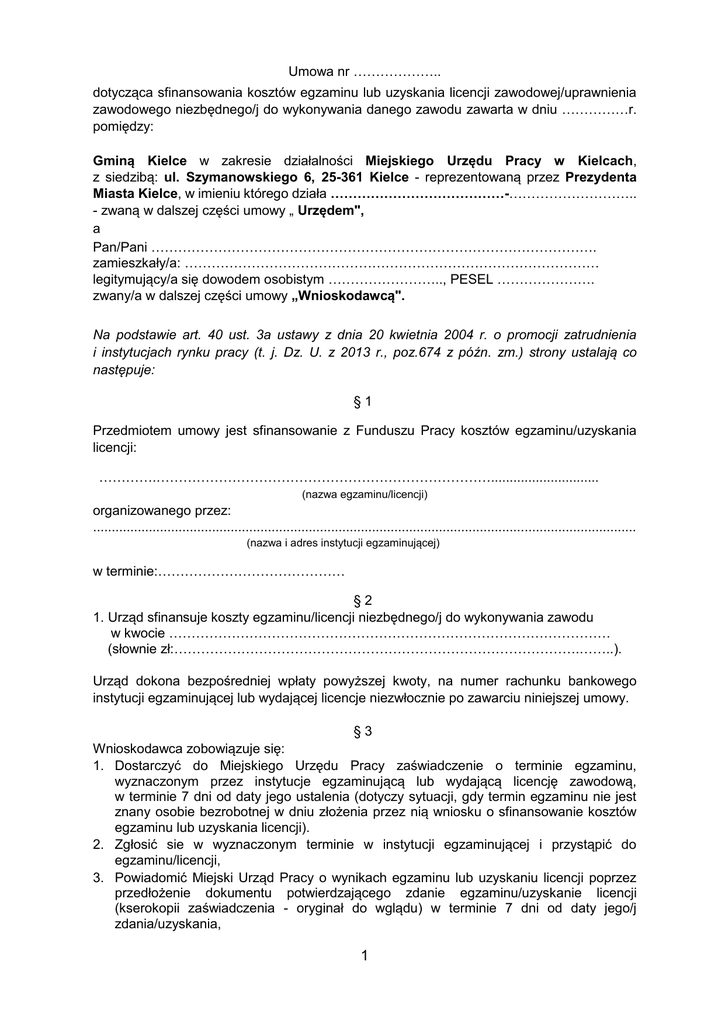 Umowa nr ……………….. dotycząca sfinansowania kosztów egzaminu lub uzyskania licencji zawodowej/uprawnienia zawodowego niezbędnego/j do wykonywania danego zawodu zawarta w dniu ……………r. pomiędzy: Gminą Kielce w zakresie działalności Miejskiego Urzędu Pracy w Kielcach, z siedzibą: ul. Szymanowskiego 6, 25-361 Kielce - reprezentowaną przez Prezydenta Miasta Kielce, w imieniu którego działa …………………………………-……………………….. - zwaną w dalszej części umowy „ Urzędem", a Pan/Pani ………………………………………………………………………………………. zamieszkały/a: ………………………………………………………………………………… legitymujący/a się dowodem osobistym …………………….., PESEL …………………. zwany/a w dalszej części umowy „Wnioskodawcą". Na podstawie art. 40 ust. 3a ustawy z dnia 20 kwietnia 2004 r. o promocji zatrudnienia i instytucjach rynku pracy (t. j. Dz. U. z 2013 r., poz.674 z późn. zm.) strony ustalają co następuje: §1 Przedmiotem umowy jest sfinansowanie z Funduszu Pracy kosztów egzaminu/uzyskania licencji: ………….…………………………………………………………………............................. (nazwa egzaminu/licencji) organizowanego przez: .................................................................................................................................................. (nazwa i adres instytucji egzaminującej) w terminie:…………………………………… §2 1. Urząd sfinansuje koszty egzaminu/licencji niezbędnego/j do wykonywania zawodu w kwocie ……………………………………………………………………………………… (słownie zł:……………………………………………………………………………….……..). Urząd dokona bezpośredniej wpłaty powyższej kwoty, na numer rachunku bankowego instytucji egzaminującej lub wydającej licencje niezwłocznie po zawarciu niniejszej umowy. §3 Wnioskodawca zobowiązuje się: 1. Dostarczyć do Miejskiego Urzędu Pracy zaświadczenie o terminie egzaminu, wyznaczonym przez instytucje egzaminującą lub wydającą licencję zawodową, w terminie 7 dni od daty jego ustalenia (dotyczy sytuacji, gdy termin egzaminu nie jest znany osobie bezrobotnej w dniu złożenia przez nią wniosku o sfinansowanie kosztów egzaminu lub uzyskania licencji). 2. Zgłosić sie w wyznaczonym terminie w instytucji egzaminującej i przystąpić do egzaminu/licencji, 3. Powiadomić Miejski Urząd Pracy o wynikach egzaminu lub uzyskaniu licencji poprzez przedłożenie dokumentu potwierdzającego zdanie egzaminu/uzyskanie licencji (kserokopii zaświadczenia - oryginał do wglądu) w terminie 7 dni od daty jego/j zdania/uzyskania, 1 4. Informować Miejski Urząd Pracy w Kielcach o wszelkich okolicznościach mogących mieć wpływ na wykonanie zobowiązań wynikających z niniejszej umowy np. zmiana w terminach przeprowadzenia egzaminu lub uzyskania licencji zawodowej, rezygnacja z przystąpienia do egzaminu lub ubiegania się o uzyskanie licencji. 5. Zwrotu całości uzyskanej kwoty dofinansowania w przypadku rezygnacji z przystąpienia do egzaminu lub ubiegania sie o uzyskanie licencji lub nieprzystąpienie do egzaminu w wyznaczonym terminie. §4 Urząd może natychmiast rozwiązać umowę w przypadku niedotrzymania przez Wnioskodawcę warunków umowy. §5 W przypadku natychmiastowego rozwiązania umowy, poniesione przez Urząd koszty, o których mowa w § 2 podlegają zwrotowi. §6 Wnioskodawca zobowiązuje się do dokonania zwrotu kosztów egzaminu/licencji w ciągu 14 dni od dnia otrzymania wezwania, na konto Miejskiego Urzędu Pracy w Kielcach. §7 Wezwanie do żądania zwrotu poniesionych kosztów jest równoznaczne z wypowiedzeniem umowy. §8 W sprawach nie objętych umową mają zastosowanie przepisy: 1) ustawy z dnia 23.04.1964 r. Kodeks Cywilny (t. j. Dz. U. z 2014 r., poz. 121), 2) ustawy z dnia 20 kwietnia 2004 r. o promocji zatrudnienia i instytucjach rynku pracy (t. j. Dz. U. z 2013 r., poz.674 z późn. zm.), 3) rozporządzenia Ministra Pracy i Polityki Społecznej z dnia z dnia 14 maja 2014r. w sprawie szczegółowych warunków realizacji oraz trybu i sposobów prowadzenia usług rynku pracy (Dz. U. z 2014 r., poz. 667). §9 Wszelkie spory mogące wyniknąć na tle stosowania umowy rozstrzygać będzie Sąd właściwy miejscowo dla siedziby Urzędu. § 10 Wszelkie zmiany umowy wymagają formy pisemnego aneksu pod rygorem nieważności. § 11 Umowę sporządzono w 3 jednobrzmiących egzemplarzach, z którego 2 egzemplarze otrzymuje Urząd, 1 egzemplarz Wnioskodawca. URZĄD: WNIOSKODAWCA: ……………………… ……………………………....................... 2