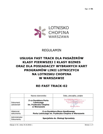 Egz. nr 01 REGULAMIN USŁUGA FAST TRACK DLA PASAŻERÓW KLASY PIERWSZEJ I KLASY BIZNES ORAZ DLA POSIADACZY WYBRANYCH KART PROGRAMÓW LINII LOTNICZYCH NA LOTNISKU CHOPINA W WARSZAWIE RE-FAST TRACK-02 Nazwa stanowiska Dokument zatwierdził Data, pieczątka, podpis Z-ca Dyrektora Portu Lotniczego im. Fryderyka Chopina w Warszawie Właściciel dokumentu Administrator Dokumentu Edycja nr 01 z dnia 19.10.2016 r. Z-ca Dyrektora Biura Handlowego Portu Lotniczego im. Fryderyka Chopina w Warszawie Specjalista ds. Obsługi Sprzedaży Strona 1 z 4 USŁUGA FAST TRACK DLA PASAŻERÓW KLASY PIERWSZEJ I KLASY BIZNES ORAZ DLA POSIADACZY WYBRANYCH KART PROGRAMÓW LINII LOTNICZYCH NA LOTNISKU CHOPINA W WARSZAWIE RE-FAST TRACK-02 1. CZĘŚĆ OGÓLNA 1.1. Cel i zakres stosowania dokumentu 1. Celem niniejszego Regulaminu jest opisanie zasad korzystania z usługi FAST TRACK uprawniającej do skorzystania z oznaczonych stanowisk Kontroli Bezpieczeństwa przez pasażerów odlatujących z Lotniska Chopina w Warszawie. 1.2. Postanowienia ogólne 1. Niniejszy Regulamin obowiązuje od dnia 19 października 2016 roku. 2. Kolejne edycje z wprowadzanymi zmianami Regulaminu zamieszczane będą na stronie Lotniska Chopina w zakładce FAST TRACK. 3. Dostawcą usługi jest Przedsiębiorstwo Państwowe „Porty Lotnicze” (PPL). 4. Biuro Handlowe (OH) jako właściciel usługi FAST TRACK odpowiada za tworzenie Polityki FAST TRACK w porozumieniu z liniami lotniczymi oraz za udzielanie odpowiedzi na zgłaszane skargi pasażerów. 5. Służba Zarządzania Ochroną (SZ) odpowiedzialna jest za poinformowanie podmiotu dokonującego kontroli dostępu i kontroli bezpieczeństwa o postanowieniach oraz zmianach do Regulaminu wraz z wykazem kart, po wcześniejszym powiadomieniu przez Biuro Handlowe. 2. CZEŚĆ SZCZEGÓŁOWA 2.1. Osoby uprawnione do korzystania z usługi FAST TRACK 1. Do korzystania z usługi FAST TRACK uprawnieni są pasażerowie odlatujący z Lotniska Chopina w Warszawie pod warunkiem posiadania karty z „Wykazu kart” (Z01-RE-FAST TRACK-02) lub mający wydrukowany na kartach pokładowych status karty lojalnościowej (GOLD lub wyższy) a także pasażerowie posiadający ważny bilet klasy pierwszej lub klasy Biznes określonej linii lotniczej. 2. W przypadku zmiany zakresu dokumentów uprawniających do korzystania z usługi FAST TRACK linia lotnicza zobowiązana jest do poinformowania PPL o zakresie zmian drogą e-mailową na adres: [email protected] ze wskazaniem nowego trybu przyznawania uprawnień, jednak w zakresie niewykraczającym poza opisany w niniejszym Regulaminie. Zmiana „Wykazu kart” (Z01-RE-FAST TRACK-02) nastąpi nie wcześniej niż w ostatnim dniu miesiąca następującym po miesiącu otrzymania nowego zakresu dokumentów uprawniających do skorzystania z usługi FAST TRACK. Edycja nr 01 z dnia 19.10.2016 r. Strona 2 z 4 USŁUGA FAST TRACK DLA PASAŻERÓW KLASY PIERWSZEJ I KLASY BIZNES ORAZ DLA POSIADACZY WYBRANYCH KART PROGRAMÓW LINII LOTNICZYCH NA LOTNISKU CHOPINA W WARSZAWIE RE-FAST TRACK-02 3. Dzieci do lat 13 będące towarzyszem podróży pasażera uprawnionego do korzystania z usługi FAST TRACK mają prawo do skorzystania z usługi FAST TRACK bez dodatkowych opłat w ramach uprawnień przyznanych pasażerowi. 2.2. Zasady korzystania z usługi FAST TRACK 1. Dokument uprawniający do skorzystania z usługi FAST TRACK należy okazać w trakcie kontroli przy stanowisku FAST TRACK w celu weryfikacji zakresu uprawnień pasażera. 2. Warunkiem dostępu do bramek Kontroli Bezpieczeństwa dedykowanych usłudze FAST TRACK jest jednoczesne posiadanie ważnej karty pokładowej, której poprawność jest weryfikowana przez automatyczne bramki kontroli dostępu. 3. Dane kontaktowe: Biuro Handlowe Lotniska Chopina w Warszawie: tel. +48 22 650 38 08, email: [email protected]. 2.3. Lokalizacja stanowisk dedykowanych usłudze FAST TRACK 1. Rozmieszenie stanowisk dedykowanych usłudze FAST TRACK zostało przedstawione w załączniku „Lokalizacja stanowisk dedykowanych usłudze FAST TRACK” (Z02-FAST TRACK-02). 2. Stanowiska dedykowane usłudze Fast Track zlokalizowane są na poziomie odlotów w strefie AB i w strefie CDE Terminala A Lotniska Chopina w Warszawie. 3. DEFINICJE 3.1. Definicje Regulamin Dokument określający przepisy i wymagania regulujące postępowanie dotyczące świadczenia usługi FAST TRACK. Definicja własna - HSP FAST TRACK Szybka ścieżka przejścia kontroli dostępu. Definicja własna - SZ Karta pokładowa Karta wręczana podczas odprawy lub też w formie elektronicznej, wydrukowana ze strony www., na podstawie której pasażer wpuszczany jest na pokład samolotu. Karta zawiera dane personalne, numer lotu, sektor i numer miejsca oraz godzinę i numer wejścia prowadzącego na pokład. Definicja własna – OLT Dostawca usługi Edycja nr 01 z dnia 19.10.2016 r. Jednostka/firma świadcząca usługę FAST TRACK. Definicja własna – HSP Strona 3 z 4 USŁUGA FAST TRACK DLA PASAŻERÓW KLASY PIERWSZEJ I KLASY BIZNES ORAZ DLA POSIADACZY WYBRANYCH KART PROGRAMÓW LINII LOTNICZYCH NA LOTNISKU CHOPINA W WARSZAWIE RE-FAST TRACK-02 3.2. Skróty HSP Dział Sprzedaży Usług Pozalotniczych NS Biuro Ochrony OH Biuro Handlowe Portu Lotniczego im. Fryderyka Chopina w Warszawie PPL Przedsiębiorstwo Państwowe „Porty Lotnicze” SZ 4. Służba Zarządzania Ochroną WYKAZ UŻYTKOWNIKÓW DOKUMENTU 1. Komórki organ. PPL NS, SZ, OH, HSP 2. Podmioty zewnętrzne ACS Sp. z.o.o., Linie Lotnicze oraz pasażerowie linii lotniczych 5. WYKAZ ZAŁĄCZNIKÓW Zał. nr 1 - Z01-RE-FAST TRACK-02 Wykaz kart Zał. nr 2 - Z02-RE-FAST TRACK-02 Lokalizacja stanowisk dedykowanych usłudze FAST TRACK Edycja nr 01 z dnia 19.10.2016 r. Strona 4 z 4