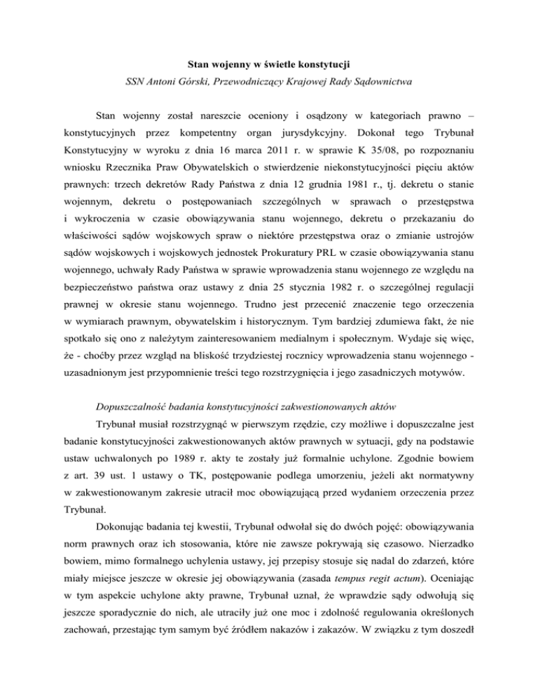 Stan wojenny w świetle konstytucji SSN Antoni Górski, Przewodniczący Krajowej Rady Sądownictwa Stan wojenny został nareszcie oceniony i osądzony w kategoriach prawno – konstytucyjnych przez kompetentny organ jurysdykcyjny. Dokonał tego Trybunał Konstytucyjny w wyroku z dnia 16 marca 2011 r. w sprawie K 35/08, po rozpoznaniu wniosku Rzecznika Praw Obywatelskich o stwierdzenie niekonstytucyjności pięciu aktów prawnych: trzech dekretów Rady Państwa z dnia 12 grudnia 1981 r., tj. dekretu o stanie wojennym, dekretu o postępowaniach szczególnych w sprawach o przestępstwa i wykroczenia w czasie obowiązywania stanu wojennego, dekretu o przekazaniu do właściwości sądów wojskowych spraw o niektóre przestępstwa oraz o zmianie ustrojów sądów wojskowych i wojskowych jednostek Prokuratury PRL w czasie obowiązywania stanu wojennego, uchwały Rady Państwa w sprawie wprowadzenia stanu wojennego ze względu na bezpieczeństwo państwa oraz ustawy z dnia 25 stycznia 1982 r. o szczególnej regulacji prawnej w okresie stanu wojennego. Trudno jest przecenić znaczenie tego orzeczenia w wymiarach prawnym, obywatelskim i historycznym. Tym bardziej zdumiewa fakt, że nie spotkało się ono z należytym zainteresowaniem medialnym i społecznym. Wydaje się więc, że - choćby przez wzgląd na bliskość trzydziestej rocznicy wprowadzenia stanu wojennego uzasadnionym jest przypomnienie treści tego rozstrzygnięcia i jego zasadniczych motywów. Dopuszczalność badania konstytucyjności zakwestionowanych aktów Trybunał musiał rozstrzygnąć w pierwszym rzędzie, czy możliwe i dopuszczalne jest badanie konstytucyjności zakwestionowanych aktów prawnych w sytuacji, gdy na podstawie ustaw uchwalonych po 1989 r. akty te zostały już formalnie uchylone. Zgodnie bowiem z art. 39 ust. 1 ustawy o TK, postępowanie podlega umorzeniu, jeżeli akt normatywny w zakwestionowanym zakresie utracił moc obowiązującą przed wydaniem orzeczenia przez Trybunał. Dokonując badania tej kwestii, Trybunał odwołał się do dwóch pojęć: obowiązywania norm prawnych oraz ich stosowania, które nie zawsze pokrywają się czasowo. Nierzadko bowiem, mimo formalnego uchylenia ustawy, jej przepisy stosuje się nadal do zdarzeń, które miały miejsce jeszcze w okresie jej obowiązywania (zasada tempus regit actum). Oceniając w tym aspekcie uchylone akty prawne, Trybunał uznał, że wprawdzie sądy odwołują się jeszcze sporadycznie do nich, ale utraciły już one moc i zdolność regulowania określonych zachowań, przestając tym samym być źródłem nakazów i zakazów. W związku z tym doszedł do wniosku, że wszystkie zakwestionowane akty utraciły moc obowiązującą w rozumieniu art. 39 ust. 1 ustawy o TK. W tym stanie rzeczy stwierdził, że jedyną podstawą umożliwiającą badanie ich konstytucyjności może być ewentualnie wyjątkowa norma art. 39 ust. 3 ustawy o TK. Zgodnie z tym przepisem, art. 39 ust 1 ustawy o TK o umorzeniu postępowania nie stosuje się, jeżeli wydanie orzeczenia o akcie normatywnym, który utracił moc obowiązującą przed wydaniem orzeczenia, jest konieczne dla ochrony konstytucyjnych wolności i praw. Trybunał uznał, że możliwe jest przyjęcie tej podstawy prawnej do merytorycznego orzekania w stosunku do dwóch z zakwestionowanych aktów, tj. dekretu o stanie wojennym (Dz. U. Nr 29, poz. 154) oraz dekretu o postępowaniach szczególnych w sprawach o przestępstwa i wykroczenia w czasie obowiązywania stanu wojennego (Dz. U. Nr 29, poz. 156). Naruszały one bowiem w sposób oczywisty zasady praw i wolności obywatelskich, a skutków tych naruszeń nie da się naprawić w całości na podstawie obowiązujących przepisów prawa. Treść wyroku Trybunału i jego zasadnicze motyw Uznając dopuszczalność badania konstytucyjności tych dwóch dekretów, Trybunał orzekł, że są one niezgodne z art. 7 Konstytucji w zw. z art. 31 ust 1 Konstytucji PRL oraz art. 15 ust. 1 Międzynarodowego Paktu Praw Obywatelskich i Politycznych, otwartego w Nowym Jorku 19 grudnia 1966 r., a w pozostałym zakresie umorzył postępowanie. Punktem wyjścia dla tej oceny była wyrażona w art. 30 Konstytucji zasada bezwzględnego prymatu godności człowieka. Trybunał przypomniał swoje wcześniejsze stanowisko, że przepis ten statuuje przedpaństwowy i ponadkonstytucyjny charakter podstawowych praw człowieka. Nie pochodzą one bowiem z nadania prawodawcy, lecz ich źródłem jest przyrodzona godność osoby ludzkiej. Z tej perspektywy nie ma istotnego znaczenia, czy do naruszenia tych praw doszło pod rządem obecnej, czy poprzedniej Konstytucji. Przepis art. 31 ust. 3 Konstytucji, ustanawiający dla ustawodawcy granice ingerencji w dziedzinę praw i wolności obywateli, należy rozumieć w ten sposób, że taka ingerencja dopuszczalna jest tylko na podstawie dwóch ściśle określonych i jednakowo ważnych kryteriów: materialnych i formalnych. Zasadniczym kryterium materialnym jest, aby ewentualne ograniczenia nie naruszały istoty tych praw i wolności. Głównym kryterium formalnym jest wymóg, aby taka ingerencja miała umocowanie w ustawie wydanej przez kompetentny organ, przy zachowaniu konstytucyjnej procedury stanowienia prawa. Oba dekrety Rady Państwa naruszały te elementarne zasady i kryteria. Dekret o stanie wojennym znosił lub ograniczał podstawowe prawa i wolności, takie jak nietykalność osobista, nienaruszalność miru domowego i tajemnicy korespondencji, wolność słowa, zgromadzeń, wieców i pochodów. Jednocześnie penalizował czyny, które nie były karalne przed 13 grudnia 1981 r. oraz zaostrzał odpowiedzialność karną za czyny zabronione na gruncie obowiązującego prawa. Z kolei dekret o postępowaniach szczególnych wprowadzał zaostrzenie sankcji karnych w stosunku do około 150 przestępstw. Oba dekrety wydano przy tym z pogwałceniem zasady legalizmu. Zgodnie bowiem z art. 31 ust. 1 ówczesnej Konstytucji, Rada Państwa mogła wyd