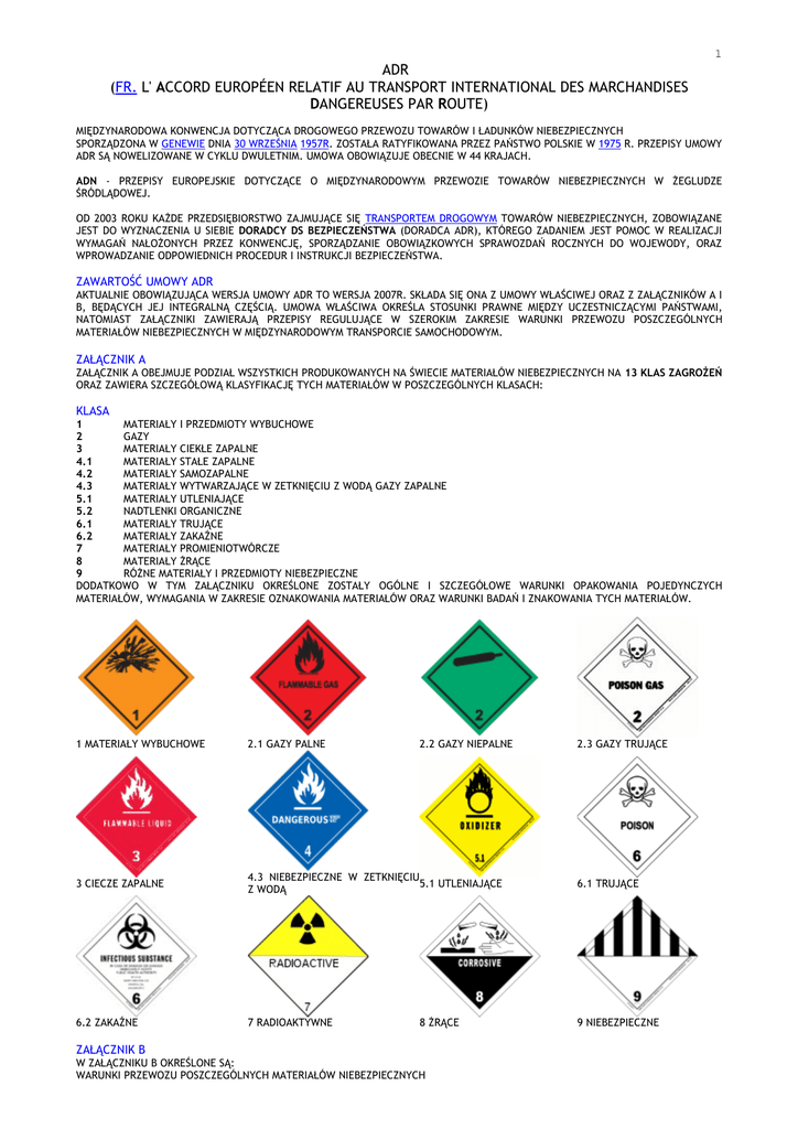 ADR (FR. L' ACCORD EUROPÉEN RELATIF AU TRANSPORT INTERNATIONAL DES MARCHANDISES DANGEREUSES PAR ROUTE) 1 MIĘDZYNARODOWA KONWENCJA DOTYCZĄCA DROGOWEGO PRZEWOZU TOWARÓW I ŁADUNKÓW NIEBEZPIECZNYCH SPORZĄDZONA W GENEWIE DNIA 30 WRZEŚNIA 1957R. ZOSTAŁA RATYFIKOWANA PRZEZ PAŃSTWO POLSKIE W 1975 R. PRZEPISY UMOWY ADR SĄ NOWELIZOWANE W CYKLU DWULETNIM. UMOWA OBOWIĄZUJE OBECNIE W 44 KRAJACH. ADN - PRZEPISY EUROPEJSKIE DOTYCZĄCE O MIĘDZYNARODOWYM PRZEWOZIE TOWARÓW NIEBEZPIECZNYCH W ŻEGLUDZE ŚRÓDLĄDOWEJ. OD 2003 ROKU KAŻDE PRZEDSIĘBIORSTWO ZAJMUJĄCE SIĘ TRANSPORTEM DROGOWYM TOWARÓW NIEBEZPIECZNYCH, ZOBOWIĄZANE JEST DO WYZNACZENIA U SIEBIE DORADCY DS BEZPIECZEŃSTWA (DORADCA ADR), KTÓREGO ZADANIEM JEST POMOC W REALIZACJI WYMAGAŃ NAŁOŻONYCH PRZEZ KONWENCJĘ, SPORZĄDZANIE OBOWIĄZKOWYCH SPRAWOZDAŃ ROCZNYCH DO WOJEWODY, ORAZ WPROWADZANIE ODPOWIEDNICH PROCEDUR I INSTRUKCJI BEZPIECZEŃSTWA. ZAWARTOŚĆ UMOWY ADR AKTUALNIE OBOWIĄZUJĄCA WERSJA UMOWY ADR TO WERSJA 2007R. SKŁADA SIĘ ONA Z UMOWY WŁAŚCIWEJ ORAZ Z ZAŁĄCZNIKÓW A I B, BĘDĄCYCH JEJ INTEGRALNĄ CZĘŚCIĄ. UMOWA WŁAŚCIWA OKREŚLA STOSUNKI PRAWNE MIĘDZY UCZESTNICZĄCYMI PAŃSTWAMI, NATOMIAST ZAŁĄCZNIKI ZAWIERAJĄ PRZEPISY REGULUJĄCE W SZEROKIM ZAKRESIE WARUNKI PRZEWOZU POSZCZEGÓLNYCH MATERIAŁÓW NIEBEZPIECZNYCH W MIĘDZYNARODOWYM TRANSPORCIE SAMOCHODOWYM. ZAŁĄCZNIK A ZAŁĄCZNIK A OBEJMUJE PODZIAŁ WSZYSTKICH PRODUKOWANYCH NA ŚWIECIE MATERIAŁÓW NIEBEZPIECZNYCH NA 13 KLAS ZAGROŻEŃ ORAZ ZAWIERA SZCZEGÓŁOWĄ KLASYFIKACJĘ TYCH MATERIAŁÓW W POSZCZEGÓLNYCH KLASACH: KLASA 1 MATERIAŁY I PRZEDMIOTY WYBUCHOWE 2 GAZY 3 MATERIAŁY CIEKŁE ZAPALNE 4.1 MATERIAŁY STAŁE ZAPALNE 4.2 MATERIAŁY SAMOZAPALNE 4.3 MATERIAŁY WYTWARZAJĄCE W ZETKNIĘCIU Z WODĄ GAZY ZAPALNE 5.1 MATERIAŁY UTLENIAJĄCE 5.2 NADTLENKI ORGANICZNE 6.1 MATERIAŁY TRUJĄCE 6.2 MATERIAŁY ZAKAŹNE 7 MATERIAŁY PROMIENIOTWÓRCZE 8 MATERIAŁY ŻRĄCE 9 RÓŻNE MATERIAŁY I PRZEDMIOTY NIEBEZPIECZNE DODATKOWO W TYM ZAŁĄCZNIKU OKREŚLONE ZOSTAŁY OGÓLNE I SZCZEGÓŁOWE WARUNKI OPAKOWANIA POJEDYNCZYCH MATERIAŁÓW, WYMAGANIA W ZAKRESIE OZNAKOWANIA MATERIAŁÓW ORAZ WARUNKI BADAŃ I ZNAKOWANIA TYCH MATERIAŁÓW. 1 MATERIAŁY WYBUCHOWE 2.1 GAZY PALNE 3 CIECZE ZAPALNE 4.3 NIEBEZPIECZNE W ZETKNIĘCIU 5.1 UTLENIAJĄCE Z WODĄ 6.1 TRUJĄCE 6.2 ZAKAŹNE 7 RADIOAKTYWNE 9 NIEBEZPIECZNE ZAŁĄCZNIK B 2.2 GAZY NIEPALNE 8 ŻRĄCE W ZAŁĄCZNIKU B OKREŚLONE SĄ: WARUNKI PRZEWOZU POSZCZEGÓLNYCH MATERIAŁÓW NIEBEZPIECZNYCH 2.3 GAZY TRUJĄCE WARUNKI TECHNICZNE POJAZDÓW SAMOCHODOWYCH WARUNKI TECHNICZNE PRZYCZEP (NACZEP), CYSTERN I KONTENERÓW - CYSTERN WARUNKI OZNAKOWANIA POJAZDÓW I DODATKOWEGO ICH WYPOSAŻENIA WARUNKI ZAŁADUNKU I WYŁADUNKU POSZCZEGÓLNYCH MATERIAŁÓW ZAKAZY ŁADOWANIA ŁADUNKU RAZEM W JEDNYM POJEŹDZIE WYMAGANIA DOTYCZĄCE OSÓB UCZESTNICZĄCYCH W PRZEWOZIE NIEZBĘDNA DOKUMENTACJA PRZY TYCH PRZEWOZACH PAŃSTWA, KTÓRE RATYFIKOWAŁY UMOWĘ ADR 2 OBECNIE DO UMOWY ADR (W KOLEJNOŚCI ALFABETYCZNEJ) NALEŻĄ PAŃSTWA: - ALBANIA, AUSTRIA, AZERBEJDŻAN, BELGIA, BIAŁORUŚ, BOŚNIA I HERCEGOWINA, BUŁGARIA, CHORWACJA, CYPR, CZARNOGÓRA, DANIA, ESTONIA, FEDERACJA ROSYJSKA, FINLANDIA, FRANCJA, GRECJA, HISZPANIA, HOLANDIA, IRLANDIA, KAZACHSTAN, LIECHTENSTEIN, LITWA, LUKSEMBURG, ŁOTWA, MACEDONIA, MALTA, MAROKO, MOŁDAWIA, NIEMCY, NORWEGIA, POLSKA, PORTUGALIA, REPUBLIKA CZESKA, RUMUNIA, SERBIA, SŁOWACJA, SŁOWENIA, SZWAJCARIA, SZWECJA, TUNEZJA, UKRAINA, WĘGRY, WIELKA BRYTANIA, WŁOCHY[1] UMOWA ADR MA WSPÓLNE ŹRÓDŁA Z UMOWAMI DOTYCZĄCYMI MIĘDZYNARODOWEGO TRANSPORTU: DROGĄ MORSKĄ (IMDG), KOLEJOWĄ (RID) I LOTNICZĄ (ICAO).