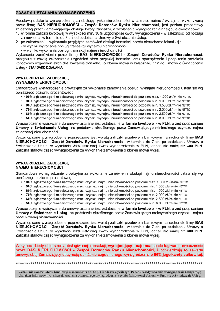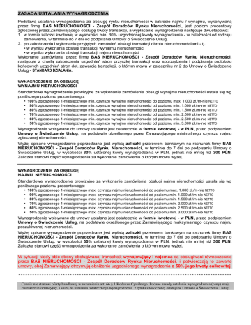 ZASADA USTALANIA WYNAGRODZENIA Podstawą ustalania wynagrodzenia za obsługę rynku nieruchomości w zakresie najmu / wynajmu, wykonywaną przez firmę BAS NIERUCHOMOŚCI - Zespół Doradców Rynku Nieruchomości, jest poziom procentowy zgłoszonej przez Zamawiającego obsługę kwoty transakcji, a wypłacanie wynagrodzenia następuje dwuetapowo: 1. w formie zaliczki kwotowej w wysokości min. 30% uzgodnionej kwoty wynagrodzenia - w zależności od rodzaju zamówienia, w terminie do 7 dni od podpisania Umowy o Świadczenie Usług. 2. po zakończeniu i wykonaniu przyjętych zamówień obsługi transakcji obrotu nieruchomościami - tj.: ▪ w wyniku wykonania obsługi transakcji wynajmu nieruchomości ▪ w wyniku wykonania obsługi transakcji najmu nieruchomości Wykonanie zamówienia przez firmę BAS NIERUCHOMOŚCI - Zespół Doradców Rynku Nieruchomości, następuje z chwilą zakończenia uzgodnień stron przyszłej transakcji oraz sporządzenia i podpisania protokołu końcowych uzgodnień stron dot. zawarcia transakcji, o którym mowa w załączniku nr 2 do Umowy o Świadczenie Usług - STANDARD DZIAŁANIA. WYNAGRODZENIE ZA OBSŁUGĘ WYNAJMU NIERUCHOMOŚCI Standardowe wynagrodzenie prowizyjne za wykonanie zamówienia obsługi wynajmu nieruchomości ustala się wg poniższego poziomu procentowego: ▪ 100% zgłoszonego 1-miesięcznego min. czynszu wynajmu nieruchomości do poziomu max. 1.000 zł./m-nie NETTO ▪ 90% zgłoszonego 1-miesięcznego min. czynszu wynajmu nieruchomości od poziomu min. 1.000 zł./m-nie NETTO ▪ 80% zgłoszonego 1-miesięcznego min. czynszu wynajmu nieruchomości od poziomu min. 1.500 zł./m-nie NETTO ▪ 70% zgłoszonego 1-miesięcznego min. czynszu wynajmu nieruchomości od poziomu min. 2.000 zł./m-nie NETTO ▪ 60% zgłoszonego 1-miesięcznego min. czynszu wynajmu nieruchomości od poziomu min. 2.500 zł./m-nie NETTO ▪ 50% zgłoszonego 1-miesięcznego min. czynszu wynajmu nieruchomości od poziomu min. 3.000 zł./m-nie NETTO Wynagrodzenie wpisywane do umowy ustalane jest ostatecznie w formie kwotowej - w PLN, przed podpisaniem Umowy o Świadczenie Usług, na podstawie określonego przez Zamawiającego minimalnego czynszu najmu zgłaszanej nieruchomości. Wyżej opisane wynagrodzenie poprzedzane jest wpłatą zaliczki przelewem bankowym na rachunek firmy BAS NIERUCHOMOŚCI - Zespół Doradców Rynku Nieruchomości, w terminie do 7 dni po podpisaniu Umowy o Świadczenie Usług, w wysokości 30% ustalonej kwoty wynagrodzenia w PLN, jednak nie mniej niż 300 PLN. Zaliczka stanowi część wynagrodzenia za wykonanie zamówienia o którym mowa wyżej. WYNAGRODZENIE ZA OBSŁUGĘ NAJMU NIERUCHOMOŚCI Standardowe wynagrodzenie prowizyjne za wykonanie zamówienia obsługi najmu nieruchomości ustala się wg poniższego poziomu procentowego: ▪ 100% zgłoszonego 1-miesięcznego max. czynszu najmu nieruchomości do poziomu max. 1.000 zł./m-nie NETTO ▪ 90% zgłoszonego 1-miesięcznego max. czynszu najmu nieruchomości od poziomu min. 1.000 zł./m-nie NETTO ▪ 80% zgłoszonego 1-miesięcznego max. czynszu najmu nieruchomości od poziomu min. 1.500 zł./m-nie NETTO ▪ 70% zgłoszonego 1-miesięcznego max. czynszu najmu nieruchomości od poziomu min. 2.000 zł./m-nie NETTO ▪ 60% zgłoszonego 1-miesięcznego max. czynszu najmu nieruchomości od poziomu min. 2.500 zł./m-nie NETTO ▪ 50% zgłoszonego 1-miesięcznego max. czynszu najmu nieruchomości od poziomu min. 3.000 zł./m-nie NETTO Wynagrodzenie wpisywane do umowy ustalane jest ostatecznie w formie kwotowej - w PLN, przed podpisaniem Umowy o Świadczenie Usług, na podstawie określonego przez Zamawiającego maksymalnego czynszu najmu poszukiwanej nieruchomości. Wyżej opisane wynagrodzenie poprzedzane jest wpłatą zaliczki przelewem bankowym na rachunek firmy BAS NIERUCHOMOŚCI - Zespół Doradców Rynku Nieruchomości, w terminie do 7 dni po podpisaniu Umowy o Świadczenie Usług, w wysokości 30% ustalonej kwoty wynagrodzenia w PLN, jednak nie mniej niż 300 PLN. Zaliczka stanowi część wynagrodzenia za wykonanie zamówienia o którym mowa wyżej. W sytuacji kiedy obie strony obsługiwanej transakcji; wynajmujący i najemca są obsługiwani równocześnie przez BAS NIERUCHOMOŚCI - Zespół Doradców Rynku Nieruchomości, i potwierdzają to zawarte umowy, obaj Zamawiający otrzymują obniżenie uzgodnionego wynagrodzenia o 50% jego kwoty całkowitej. ******************************************************************************************* Cennik nie stanowi oferty handlowej w rozumieniu art. 66 § 1 Kodeksu Cywilnego. Podane zasady ustalania wynagrodzenia (ceny) mają charakter informacyjny, i służą do ustalania ostatecznego wynagrodzenia z tytułu świadczonej obsługi w Umowie o Świadczenie Usług.