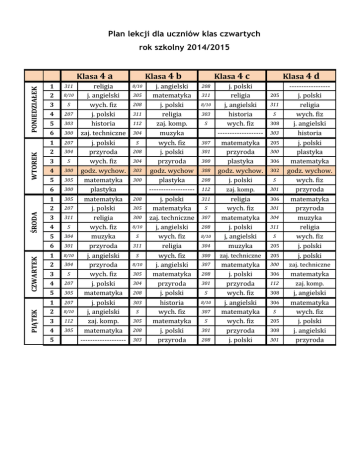 Plan lekcji dla uczniów klas czwartych rok szkolny 2014/2015 PIĄTEK CZWARTEK ŚRODA WTOREK PONIEDZIAŁEK Klasa 4 a 1 2 8/10 3 S 4 207 5 303 6 300 1 2 207 3 S 4 300 5 305 6 300 1 2 305 3 311 4 S 5 304 6 301 1 2 8/10 3 S 4 207 5 305 1 2 207 8/10 3 112 4 305 5 311 304 207 304 religia j. angielski wych. fiz j. polski historia zaj. techniczne j. polski przyroda wych. fiz godz. wychow. matematyka plastyka matematyka j. polski religia wych. fiz muzyka przyroda j. angielski przyroda wych. fiz j. polski matematyka j. polski j, angielski zaj. komp. matematyka ------------------- Klasa 4 b 8/10 305 208 311 112 304 S 208 304 303 300 208 305 300 8/10 S 311 S 8/10 305 304 208 303 S 305 208 303 j. angielski matematyka j. polski religia zaj. komp. muzyka wych. fiz j. polski przyroda godz. wychow plastyka ------------------j. polski matematyka zaj. techniczne j, angielski wych. fiz religia wych. fiz j. angielski matematyka przyroda j. polski historia wych. fiz matematyka j. polski przyroda Klasa 4 c Klasa 4 d 208 j. polski religia j, angielski historia wych. fiz ------------------matematyka przyroda plastyka godz. wychow. j. polski 112 zaj. komp. 301 311 306 304 religia wych. fiz matematyka j. polski j, angielski muzyka 300 zaj. techniczne 205 ----------------j. polski religia wych. fiz j. angielski historia j. polski plastyka matematyka godz. wychow. wych. fiz przyroda matematyka przyroda muzyka religia wych. fiz j. polski j. polski 307 matematyka j. polski przyroda wych. fiz j. angielski matematyka wych. fiz przyroda j. polski 300 zaj. techniczne 306 matematyka 112 zaj. komp. 308 j, angielski matematyka wych. fiz j. polski j. angielski przyroda 208 311 8/10 303 S 307 301 300 308 S 307 208 8/10 208 301 S 8/10 307 S 301 208 205 311 S 308 303 205 300 306 302 S 301 304 311 S 205 306 S 205 308 301