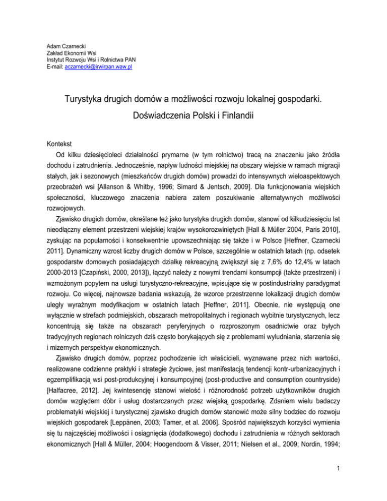 Adam Czarnecki Zakład Ekonomii Wsi Instytut Rozwoju Wsi i Rolnictwa PAN E-mail: [email protected] Turystyka drugich domów a możliwości rozwoju lokalnej gospodarki. Doświadczenia Polski i Finlandii Kontekst Od kilku dziesięcioleci działalności prymarne (w tym rolnictwo) tracą na znaczeniu jako źródła dochodu i zatrudnienia. Jednocześnie, napływ ludności miejskiej na obszary wiejskie w ramach migracji stałych, jak i sezonowych (mieszkańców drugich domów) prowadzi do intensywnych wieloaspektowych przeobrażeń wsi [Allanson & Whitby, 1996; Simard & Jentsch, 2009]. Dla funkcjonowania wiejskich społeczności, kluczowego znaczenia nabiera zatem poszukiwanie alternatywnych możliwości rozwojowych. Zjawisko drugich domów, określane też jako turystyka drugich domów, stanowi od kilkudziesięciu lat nieodłączny element przestrzeni wiejskiej krajów wysokorozwiniętych [Hall & Müller 2004, Paris 2010], zyskując na popularności i konsekwentnie upowszechniając się także i w Polsce [Heffner, Czarnecki 2011]. Dynamiczny wzrost liczby drugich domów w Polsce, szczególnie w ostatnich latach (np. odsetek gospodarstw domowych posiadających działkę rekreacyjną zwiększył się z 7,6% do 12,4% w latach 2000-2013 [Czapiński, 2000, 2013]), łączyć należy z nowymi trendami konsumpcji (także przestrzeni) i wzmożonym popytem na usługi turystyczno-rekreacyjne, wpisujące się w postindustrialny paradygmat rozwoju. Co więcej, najnowsze badania wskazują, że wzorce przestrzenne lokalizacji drugich domów uległy wyraźnym modyfikacjom w ostatnich latach [Heffner, 2011]. Obecnie, nie występują one wyłącznie w strefach podmiejskich, obszarach metropolitalnych i regionach wybitnie turystycznych, lecz koncentrują się także na obszarach peryferyjnych o rozproszonym osadnictwie oraz byłych tradycyjnych regionach rolniczych dziś często borykających się z problemami wyludniania, starzenia się i mizernych perspektyw ekonomicznych. Zjawisko drugich domów, poprzez pochodzenie ich właścicieli, wyznawane przez nich wartości, realizowane codzienne praktyki i strategie życiowe, jest manifestacją tendencji kontr-urbanizacyjnych i egzemplifikacją wsi post-produkcyjnej i konsumpcyjnej (post-productive and consumption countryside) [Halfacree, 2012]. Jej kwintesencję stanowi wielość i różnorodność potrzeb użytkowników drugich domów względem dóbr i usług dostarczanych przez wiejską gospodarkę. Zdaniem wielu badaczy problematyki wiejskiej i turystycznej zjawisko drugich domów stanowić może silny bodziec do rozwoju wiejskich gospodarek [Leppänen, 2003; Tamer, et al. 2006]. Spośród największych korzyści wymienia się tu najczęściej możliwości i osiągnięcia (dodatkowego) dochodu i zatrudnienia w różnych sektorach ekonomicznych [Hall & Müller, 2004; Hoogendoorn & Visser, 2011; Nielsen et al., 2009; Nordin, 1994; 1 Sikorska-Wolak, 2007] zwracając uwagę na fakt, iż drugie domy kreują potencjał rozwojowy nieograniczony jedynie do sektora turystycznego, lecz w znacznie szerszym ujęciu dla budownictwa (uwzględniając projektowanie domu i ogrodu), handlu materiałami budowlanymi, akcesoriami wyposażenia domu, usług instalacyjnych, sprzątających, ochroniarskich itp. Jednak, pogląd o pozytywnym wpływie płynącym z turystyki drugich domów na wzrost liczby miejsc pracy w sektorze budowlanym i usługach jest równie często, za swą jednostronność, krytykowany. Jak twierdzą niektórzy, drugie domy indukują jedynie nieznaczny wzrost zatrudnienia w miejscu ich lokalizacji, który na domiar złego charakteryzuje sezonowość, tymczasowość, niepewność i niskie dochody w stosunku do miejsc pracy tworzonych przez inne działalności [Marcouiller, 1997; Wallace et al., 2005]. Badania przeprowadzone w Szwecji i Niemczech wymieniają przedsiębiorstwa sektora meblarskiego, wyposażenia wnętrz, handlu artykułami budowlanymi, produktami żywnościowymi i innymi dobrami użytku codziennego jako największych beneficjentów zjawiska drugich domów [Müller, 2002]. Pomimo tego, że mieszkańcy drugich domów przeznaczają znacznie mniej na remonty i modernizacje niż stali mieszkańcy [Wallace et al., 2005], to w Szwecji i Niemczech wydają na codzienne zakupy tyle samo co lokalna ludność mając wpływ w ten sposób nie tyle na tworzenie nowych miejsc pracy, ale utrzymanie aktualnego poziomu zatrudnienia [Müller, 2002]. Założenia badawcze W świetle zarysowanych wyżej rozważań, głównym celem badania była identyfikacja i eksploracja powiązań ekonomicznych pomiędzy właścicielami i użytkownikami drugich domów a lokalną ludnością w Polsce i Finlandii. Umożliwiły one, na kolejnym etapie, dokonanie oceny wpływu zjawiska drugich domów na wielkość i strukturę dochodów wiejskich gospodarstw domowych i budżetów gminnych, a szerzej jego znaczenia dla lokalnej gospodarki. Ocenę relacji ekonomicznych przeprowadzono z punktu widzenia skali zjawiska (liczby graczy), wartości ekonomicznej (monetarnej) i obiektu transakcji (płodów rolnych, produktów żywnościowych, dóbr trwałych i usług). Równie istotne było rozpoznanie następujących kwestii: jaka jest skala zjawiska (wg liczby drugich domów, właścicieli/użytkowników); jak zróżnicowane jest zjawisko w przestrzeni wiejskiej obu krajów (jakie są czynniki lokalizacyjne, wzorce przestrzenne i strefy koncentracji zjawiska drugich domów); w jakim stopniu właściciele/użytkownicy drugich domów są zintegrowani z lokalną gospodarką (na podstawie przestrzennych wzorców wydatków, tj. odsetka zakupów dóbr i usług dokonywanych w miejscowości/gminie, w której zlokalizowany jest drugi dom); jakie jest znaczenie zjawiska drugich domów w kształtowaniu budżetów wiejskich gospodarstw domowych i budżetów gminnych w wymiarze monetarnym (wg wielkości dochodu i odsetka całkowitych dochodów gospodarstwa domowego i gminy); jakie działalności/działy lokalnej g
