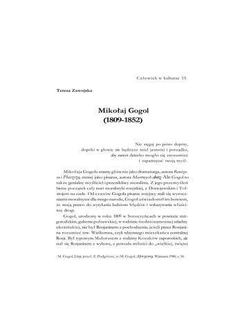 Człowiek w kulturze 15 Teresa Zawojska Mikołaj Gogol (1809-1852) Nie sięgaj po pióro dopóty, dopóki w głowie nie będziesz miał jasności i porządku, aby nawet dziecko mogło cię zrozumieć i zapamiętać twoją myśl . 1 Mikołaja Gogola znamy głównie jako dramaturga, autora Rewizo ra i Płaszczą, rnniej jako pisarza, autora Martwych dusz. Ale Gogol to także genialny myśliciel i przenikliwy moralista. Z jego przemyśleń bierze początek cały nurt moralistyki rosyjskiej, z Dostojewskim i Toł stojem na czele. Od czasów Gogola pisarze rosyjscy stali się wyrocz niami moralnymi dla swego narodu, Gogol uświadomił im bowiem, że mają prawo do wytykania ludziom błędów i wskazywania właści wej drogi. Gogol, urodzony w roku 1809 w Soroczyńcach w powiecie mirgorodzkim, guberni połtawskiej, w rodzinie średniozamożnej szlachty ukraińskiej, nie był Rosjaninem z pochodzenia, jeżeli przez Rosjani na rozumieć tzw. Wielkorusa, czyli rdzennego mieszkańca centralnej Rosji. Był typowym Małorusem z rodziny Kozaków zaporoskich, ale stał się Rosjaninem z wyboru, z powodu miłości do „wielkiej, świętej 1 M. Gogol, Lisy, przeł. Z. Podgórzec, w: M. Gogol, Aforyzmy, Warszawa 1980, s. 54. 242 Sylwetki słynnych myślicieli Rusi". Dziś powiedzielibyśmy o Gogolu — Ukrainiec, wówczas jed nak Ukraina była pojęciem raczej geograficznym i etnograficznym niż narodowo-politycznym. „Język duszy" Gogola to język ukraiński, bohaterowie wczesnych utworów Gogola mówią o Wielkorusie „kacap", a o Malorusie — „chochoł". Rodzina Gogola, jak wiele rodzin na dawnych Dzikich Polach, miała u swych korzeni związek z pol skością: ojciec przyszłego pisarza, Wasyl, ożeniony był z Kosiarowską, jego przodek - Ostap, pułkownik mohylowski, został w 1676 r. na sej mie koronacyjnym w Warszawie nobilitowany (zmieniał jednak opcje polityczne, walcząc raz po stronie Rzeczypospolitej, raz pod komendą rosyjską); pradziad Mikołaja miał na imię Jan i do nazwiska rodowego Gogol (lub Hohol) przybrał przydomek „Janowski". Nazwisko „Gogol-Janowski" nosił pisarz przez długi czas: tak był zapisany w szkole 1 w liceum, pod tym nazwiskiem wykładał na uniwersytecie, dopiero później je odrzucił, pozostawiając jedynie pierwszy człon. W życiu Gogola wyraźne cezury stanowią daty: 1828 (opuszcze nie Ukrainy i przyjazd do Petersburga), 1836 (wyjazd za granicę) i 1848 (powrót do Rosji), wyznaczające koleje jego losów i twórczości. Uczył się przyszły pisarz w szkole w Połtawie, a następnie (1820—1828) w no wo otwartym Gimnazjum Nauk Wyższych w Nieżynie, elitarnej szkole o programie i uprawnieniach zbliżonych do Liceum Krzemienieckie go. Już w młodzieńczych latach ukształtowały się zasadnicze cechy osobowości przyszłego myśliciela i pisarza: poczucie odrębności od środowiska, a więc i konfliktu z nim, oraz przekonanie o własnym po słannictwie. Aby zrealizować to posłannictwo, udał się do Petersburga. Konfrontacja młodzieńczych ideałów z twardą rzeczywistością okazała się na tyle bolesna, że na zawsze utrwaliła w pisarzu niechęt ny stosunek do stolicy imperium. Tu przeżył pierwsze niepowodze nia literackie: po opublikowaniu marzycielskiej, pisanej wierszem idylli Hans Küchelgartet?, nieprzychylne głosy krytyki sprawiły, że wykupił 2 Zob. hasło „Hohol (Gogol) Mikołaj", w: Wielka Encyklopedia Powszechna Ilustrowa na, Warszawa 1902, t. X X I X - X X X , s. 197. Wyd. Petersburg 1829. 2 3 Sylwetki słynnych myślicieli 243 i zniszczył prawie cały nakład i udał się do wyidealizowanych w tym że poemacie Niemiec. Wrócił po miesiącu. W Petersburgu poznał jalowość i beznadziejność pracy urzędniczej (jako biuralista w „de partamencie apanaży" przy ministerstwie dworu cesarskiego, zarzą dzający dobrami prywatnymi rodziny cesarskiej), nieudane próby pracy aktorskiej oraz pedagogicznej (jako nauczyciel historii w żeńskim In stytucie Patriotycznym), a także nauczania akademickiego — od 1834 wykładał historię powszechną na uniwersytecie w Petersburgu, lecz po dwóch latach podał się do dymisji. Niedoszły naukowiec autoiro nicznie i samokrytycznie miał stwierdzić po odejściu z uniwersytetu: „Nieuznany wstąpiłem na katedrę i nieuznany schodzę z niej". Tur gieniew, który był słuchaczem wykładów Gogola, napisał: „[...] wy kłady te odbywały się w sposób oryginalny. Po pierwsze, na trzy wy kłady opuszczał Gogol stale dwa; po drugie, nawet gdy się ukazywał na katedrze, nie tyle mówił, co szeptał coś zgoła bez związku [...]. Wszyscyśmy byli przekonani (i zapewne nie myliliśmy się), że się nie zna zupełnie na historii, i że pan Gogol-Janowski, nasz profesor (pod takim nazwiskiem figurował w spisie wykładów), nie ma nic wspólne go z pisarzem Gogolem, znanym nam już jako autor Wieczorów na chutor%e" • Przyszły pisarz studiował także krótko rysunek w Akademii Sztuk Pięknych w Petersburgu, miał talent plastyczny—jego szkice piór kiem do Remzora są majstersztykiem rysunku charakterystycznego. W tym czasie pisał następne utwory literackie, zarzucił jednak formę poematu oraz idylliczną tematykę na rzecz opowiadań opar tych na wspomnieniach z życia na ukraińskiej prowincji, wykorzystu jąc bogaty materiał folklorystyczny, przetwarzając go na modłę ro mantyczną (Wieczory na chutorze kolo Dikańkr ). Folklor i romantycz na fantastyka tych opowiadań wywodzą się z tych samych tendencji ideowych i z tych samych dążeń literackich co Mickiewiczowskie Bal lady i romanse. Obraz świata w nich ukazany to poetycka wizja utkana 4 1 4 5 Lińerałurnye i żjńejshje wospominanja, w: wyd. pism Gogola, Petersburg 1897. Wyd. polskie: Warszawa 1865; Wiechem na chutorie bli^ Dikan'ki, t. I - I I , Petersburg 1831-1832. 244 Sylwetki słynnych myślicieli z legend, baśni, zwyczajów i wierzeń ludowych. W podobnym klima cie utrzymana jest baśń historyc