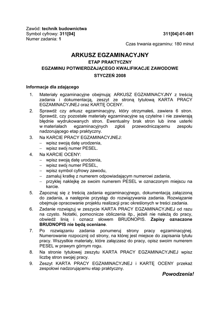 Zawód: technik budownictwa Symbol cyfrowy: 311[04] Numer zadania: 1 311[04]-01-081 Czas trwania egzaminu: 180 minut ARKUSZ EGZAMINACYJNY ETAP PRAKTYCZNY EGZAMINU POTWIERDZAJĄCEGO KWALIFIKACJE ZAWODOWE STYCZEŃ 2008 Informacje dla zdającego 1. 2. 3. 4. 5. 6. 7. 8. 9. Materiały egzaminacyjne obejmują: ARKUSZ EGZAMINACYJNY z treścią zadania i dokumentacją, zeszyt ze stroną tytułową KARTA PRACY EGZAMINACYJNEJ oraz KARTĘ OCENY. Sprawdź czy arkusz egzaminacyjny, który otrzymałeś, zawiera 6 stron. Sprawdź, czy pozostałe materiały egzaminacyjne są czytelne i nie zawierają błędnie wydrukowanych stron. Ewentualny brak stron lub inne usterki w materiałach egzaminacyjnych zgłoś przewodniczącemu zespołu nadzorującego etap praktyczny. Na KARCIE PRACY EGZAMINACYJNEJ: − wpisz swoją datę urodzenia, − wpisz swój numer PESEL. Na KARCIE OCENY: − wpisz swoją datę urodzenia, − wpisz swój numer PESEL, − wpisz symbol cyfrowy zawodu, − zamaluj kratkę z numerem odpowiadającym numerowi zadania, − przyklej naklejkę ze swoim numerem PESEL w oznaczonym miejscu na karcie. Zapoznaj się z treścią zadania egzaminacyjnego, dokumentacją załączoną do zadania, a następnie przystąp do rozwiązywania zadania. Rozwiązanie obejmuje opracowanie projektu realizacji prac określonych w treści zadania. Zadanie rozwiązuj w zeszycie KARTA PRACY EGZAMINACYJNEJ od razu na czysto. Notatki, pomocnicze obliczenia itp., jeŜeli nie naleŜą do pracy, obwiedź linią i oznacz słowem BRUDNOPIS. Zapisy oznaczone BRUDNOPIS nie będą oceniane. Po rozwiązaniu zadania ponumeruj strony pracy egzaminacyjnej. Numerowanie rozpocznij od strony, na której jest miejsce do zapisania tytułu pracy. Wszystkie materiały, które załączasz do pracy, opisz swoim numerem PESEL w prawym górnym rogu. Na stronie tytułowej zeszytu KARTA PRACY EGZAMINACYJNEJ wpisz liczbę stron swojej pracy. Zeszyt KARTA PRACY EGZAMINACYJNEJ i KARTĘ OCENY przekaŜ zespołowi nadzorującemu etap praktyczny. Powodzenia! Zadanie egzaminacyjne W jednym z pomieszczeń budynku jednorodzinnego naleŜy wykonać, na stropie Ŝelbetowym nad nieogrzewaną piwnicą, podłogę wielowarstwową z parkietu mozaikowego na kleju winylowym, bez szlifowania i lakierowania. Izolację termiczną stanowić będą płyty styropianowe o frezowanych krawędziach, układane na sucho, natomiast izolację przeciwwilgociową stanowić będzie jedna warstwa papy układana na sucho ze smarowaniem zakładów lepikiem. Warstwa wyrównawcza, zatarta na gładko, wykonana będzie z zaprawy cementowej. Materiały podłogowe dostarczone będą według zamówienia i składowane na miejscu w budynku. Opracuj projekt realizacji prac związanych z wykonaniem podłogi wielowarstwowej z parkietu mozaikowego. Projekt realizacji prac powinien zawierać: 1. Tytuł pracy egzaminacyjnej wynikający z treści zadania. 2. ZałoŜenia, czyli dane wynikające z treści zadania i załączników. 3. Wykaz robót związanych z wykonaniem podłogi przedstawiony w kolejności technologicznej, wraz z opisem wymagań dotyczących ich wykonania. 4. Wykaz materiałów, narzędzi i sprzętu, oraz odzieŜy roboczej do wykonania podłogi. 5. Przedmiar robót izolacyjnych, podkładowych i posadzkowych. 6. Kosztorys dla wykonywanej podłogi oraz cenę kosztorysową Ck Do wykonania zadania wykorzystaj: Rzut pomieszczenia, przekrój przegrody nad piwnicą, rysunek poglądowy podłogi– Załącznik 1. Wyciąg z Katalogu Nakładów Rzeczowych 2-02 oraz ceny jednostkowe – Załącznik 2. Czas na wykonanie zadania wynosi 180 minut. Strona 2 z 6 Załącznik 1. Rzut pomieszczenia, przekrój przegrody nad piwnicą, rysunek poglądowy podłogi Rzut pomieszczenia Przekrój przegrody nad piwnicą Rysunek poglądowy podłogi Strona 3 z 6 Załącznik 2. Wyciąg z Katalogów Nakładów Rzeczowych 2-02 oraz ceny jednostkowe Izolacje cieplne i przeciwdźwiękowe z płyt styropianowych Wyszczególnienie robót: 1.Oczyszczenie podłoŜa 2.UłoŜenie izolacji poziomej na wierzchu konstrukcji na sucho Tabela 1. Nakłady na 100m2 Izolacje poziome Na wierzchu konstrukcji Na sucho Jedna KaŜda następna warstwa warstwa Wyszczególnienie Jednostki miary, oznaczenia Rodzaje zawodów, materiałów i maszyn Literowe 01 02 03 04 r-g r-g r-g m2 8,19 0,72 8,91 105,00 6,51 0.72 7,23 105,00 Dekarze-grupa II Robotnicy-grupa I Razem Płyty styropianowe o grubości 12 cm Izolacje z papy asfaltowej na sucho Wyszczególnienie robót: 1.Oczyszczenie podłoŜa 2.UłoŜenie izolacji poziomej z jednej warstwy papy ze smarowaniem zakładów Tabela 2. Nakład na 100m² Wyszczególnienie Jednostki miary, oznaczenia Rodzaje zawodów, materiałów i maszyn Literowe 01 Dekarze-grupa II Robotnicy-grupa I Razem Papa asfaltowa na tekturze, izolacyjna Lepik asfaltowy bez wypełniaczy stosowany na gorąco Drewno opałowe Izolacja Pozioma Na sucho Jedna warstwa ze smarowaniem Jedna Dwie zakładów warstwa warstwy 02 03 04 05 r-g r-g r-g m² 7,14 1,18 8,32 119,00 9,98 2,44 12,42 238,00 13,45 1,34 14,79 119,00 kg - - 20,00 kg - - 30,00 Strona 4 z 6 Warstwy wyrównawcze pod posadzki Wyszczególnienie robót: 1.Oczyszczenie podłoŜa 2.UłoŜenie warstwy wyrównawczej gładzi grubości 40 mm zatartej na gładko Tabela 3. Nakład na 100m² Wyszczególnienie Rodzaje zawodów, materiałów i maszyn Warstwy Jednostki wyrównawcze miary, z zaprawy oznaczenia cementowej, grubości 20 mm, zatarte Na Literowe Na ostro gładko 01 Betoniarze-grupa II Robotnicy-grupa I Razem Zaprawa cementowa M 12 Cement 25 z dodatkami Masa asfaltowa Drewno opałowe Dodatek lub potrącenie za zmianę grubości 10 mm 02 03 04 05 r-g r-g r-g m³ t kg kg 27,14 8,50 35,64 2,06 7,00 12,00 57,19 8,69 65,88 2,06 0,03 7,00 12,00 2,84 4,32 7,16 1,05 - Posadzki z deszczułek i parkietu Wyszczególnienie robót: 1.Oczyszczenie podłoŜa 2.Smarowanie podłoŜa klejem 3.Przyklejenie parkietu 4.Przybicie listew przyściennych Tabela 4. Nakład na 100m2 Wyszczególnienie Rod