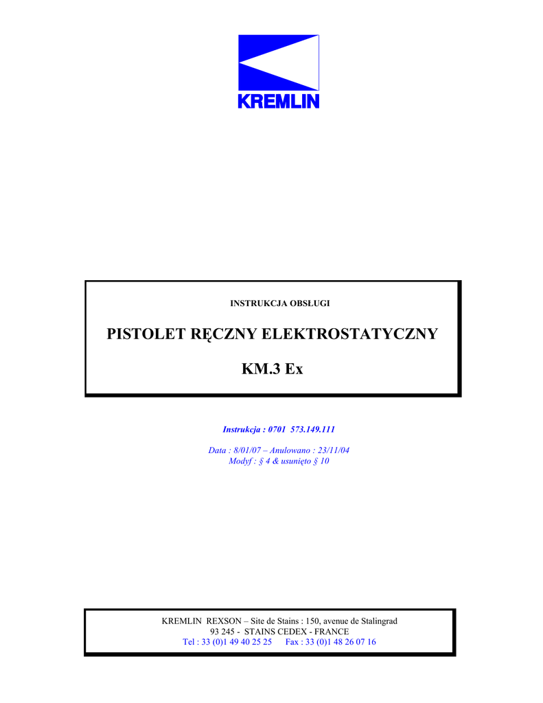 INSTRUKCJA OBSŁUGI PISTOLET RĘCZNY ELEKTROSTATYCZNY KM.3 Ex Instrukcja : 0701 573.149.111 Data : 8/01/07 – Anulowano : 23/11/04 Modyf : § 4 & usunięto § 10 KREMLIN REXSON – Site de Stains : 150, avenue de Stalingrad 93 245 - STAINS CEDEX - FRANCE Tel : 33 (0)1 49 40 25 25 Fax : 33 (0)1 48 26 07 16 INSTRUKCJA OBSŁUGI PISTOLET RĘCZNY ELEKTROSTATYCZNY KM.3 Ex SPIS TREŚCI 1. DEKLARACJA ZGODNOŚCI ................................................................................................................................2 2. ZALECENIA BHP ....................................................................................................................................................2 3. ZASADA DZIAŁANIA .............................................................................................................................................5 4. PARAMETRY TECHNICZNE ...............................................................................................................................6 5. MONTAŻ...................................................................................................................................................................9 6. URUCHOMIENIE ..................................................................................................................................................11 7. CODZIENNA KONSERWACJA ..........................................................................................................................12 8. USTERKI I KONTROLE TECHNICZNE ..........................................................................................................14 9. SERWIS ................................................................................................................................................................16 CZĘŚCI ZAMIENNE : GAMA PISTOLETÓW KM.3 Ex PISTOLET KMP 3 Ex PISTOLET KMV 3 Ex PISTOLET KMC 3 Ex PISTOLET KMX 3 Ex KREMLIN REXSON Strona 1 (Dok. 573.163.050) (Dok. 573.164.050) (Dok. 573.165.050) (Dok. 573.166.050) (Dok. 573.167.050) Instrukcja : 573.149.111 Szanowni Państwo, Dziękujemy za zakup nowego ręcznego pistoletu elektrostatycznego. Dołożyliśmy wszelkich starań, zarówno na etapie opracowywania jak i produkcji, aby wyrób ten w pełni Państwa zadowolił. Gdyby jednakże urządzenie to nie spełniało Państwa oczekiwań, prosimy o kontakt z naszą firmą. W celu poprawnego i optymalnego wykorzystania sprzętu, prosimy o dokładne zapoznanie się z niniejszą instrukcją przed uruchomieniem urządzenia. 1. DEKLARACJA CE ZGODNOŚCI Producent : KREMLIN REXSON o kapitale 6 720 000 euro Siedziba spółki : 150, avenue de Stalingrad – 93 245 - STAINS CEDEX – FRANCJA Tel. : 01.49.40.25.25 – Fax : 01.48.26.07.16 oświadcza, że poniższe urządzenie: Pistolet malarski typ KM.3 H2O jest zgodne z następującymi przepisami: CE - Dyrektywa maszynowa (dyrektywa 98/37/CE) i z przepisami wykonawczymi do niej. CE - Dyrektywa w sprawie kompatybilności elektromagnetycznej (dyrektywa 89/336/CE). Ex - Dyrektywa ATEX (Dyrektywa 94/9/CE) : II 2 G (klasa II, kategoria 2, gaz). Ujednolicone normy europejskie : EN 50 050-2000, EN 50 014+A1+A2-1997, EN 50 019-2000, EN 50 028-1987 Swiadectwo badania WE typu INERIS 03ATEX0026 X Przedstawione przez : INERIS 0080 – 60550 Verneuil-en-Halatte - FRANCJA świadectwo zgodności FTZÚ 99 Ex 0158 X (Republika Czech). Swiadectwo zgodności ENTELA 000 7065 493 (Kanada) - Model KMX3.Ex Sporządzono w STAINS, dnia 1ego lipca 2003. Daniel TRAGUS Dyrektor Generalny 2. ZALECENIA BHP 1- Urządzenie może być niebezpieczne, jeśli nie są przestrzegane zasady jego użytkowania określonych w niniejszej instrukcji. 2- Personel posługujący się sprzętem elektrostatycznym musi zostać przeszkolony w zakresie obsługi tego typu urządzeń. Kierownik zakładu powinien sprawdzić czy personel zapoznał się i dobrze zrozumiał zalecenia dotyczące BHP i czy stosuje je w praktyce. Zalecenia te dotyczą zarówno środków ostrożności, które należy przestrzegać przy rozpylaniu materiału malarskiego jak i szczególnych środków bezpieczeństwa związanych z obsługą urządzeń pracujących pod wysokim napięciem. Lokalne zasady bezpieczeństwa pracy mogą zostać wprowadzone jako uzupełnienie do ogólnych zasad bezpieczeństwa pożarowego : należy się z nimi zapoznać. 3- UWAGA: nieprzestrzeganie ogólnych zasad bezpieczeństwa i poniższych zaleceń może być przyczyną usterek w funkcjonowaniu urządzenia i stwarzać zagrożenie dla bezpieczeństwa pracy ze sprzętem. KREMLIN REXSON Strona 2 Instrukcja : 573.149.111 MONTAŻ Norma EN 50 053 określa zasady doboru, montażu i eksploatacji urządzeń do elektrostatycznego rozpylania materiałów palnych. Część 1 normy dotyczy ręcznych elektrostatycznych pistoletów malarskich. Pistolet KM.3 Ex jest wyłącznie przeznaczony do nakładania farb i lakierów. 45- 67- Rozpylanie materiału malarskiego oraz czyszczenie urządzenia może odbywać się w pomieszczeniach o odpowiedniej wentylacji. Skrzynka zasilacza powinna zostać umieszczona poza strefą rozpylania (poza strefą niebezpieczną zgodnie z normami BHP) i powinna znajdować się w odległości co najmniej 4 metrów od źródła palnych oparów (w szczególności rozpuszczalników). Połączyć zacisk masy skrzynki zasilacza z uziemieniem. Wszystkie metalowe części (elementy pompy do tłoczenia materiału malarskiego, pojemniki, wirówki itd …) znajdujące się w promieniu 3 metrów od pistoletu muszą być obowiązkowo podłączone do masy. Nigdy nie składować farb ani rozpuszczalników w strefie rozpylania ani w jej pobliżu. Zawsze dokładnie zamykać puszki i kanistry z materiałem malarskim. Stosować farby, których temperatura zapłonu jest możliwie najwyższa, najlepiej wyższa niż temperatura powietrza. Stanowisko pracy musi być utrzymywane w czystości – należy usuwać z niego wszelkie odpady. Podłoże powinno mieć odpowiednie