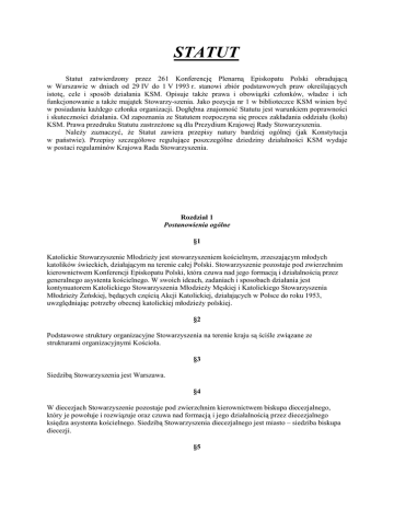 STATUT Statut zatwierdzony przez 261 Konferencję Plenarną Episkopatu Polski obradującą w Warszawie w dniach od 29 IV do 1 V 1993 r. stanowi zbiór podstawowych praw określających istotę, cele i sposób działania KSM. Opisuje także prawa i obowiązki członków, władze i ich funkcjonowanie a także majątek Stowarzy-szenia. Jako pozycja nr 1 w biblioteczce KSM winien być w posiadaniu każdego członka organizacji. Dogłębna znajomość Statutu jest warunkiem poprawności i skuteczności działania. Od zapoznania ze Statutem rozpoczyna się proces zakładania oddziału (koła) KSM. Prawa przedruku Statutu zastrzeżone są dla Prezydium Krajowej Rady Stowarzyszenia. Należy zaznaczyć, że Statut zawiera przepisy natury bardziej ogólnej (jak Konstytucja w państwie). Przepisy szczegółowe regulujące poszczególne dziedziny działalności KSM wydaje w postaci regulaminów Krajowa Rada Stowarzyszenia. Rozdział 1 Postanowienia ogólne §1 Katolickie Stowarzyszenie Młodzieży jest stowarzyszeniem kościelnym, zrzeszającym młodych katolików świeckich, działającym na terenie całej Polski. Stowarzyszenie pozostaje pod zwierzchnim kierownictwem Konferencji Episkopatu Polski, która czuwa nad jego formacją i działalnością przez generalnego asystenta kościelnego. W swoich ideach, zadaniach i sposobach działania jest kontynuatorem Katolickiego Stowarzyszenia Młodzieży Męskiej i Katolickiego Stowarzyszenia Młodzieży Żeńskiej, będących częścią Akcji Katolickiej, działających w Polsce do roku 1953, uwzględniając potrzeby obecnej katolickiej młodzieży polskiej. §2 Podstawowe struktury organizacyjne Stowarzyszenia na terenie kraju są ściśle związane ze strukturami organizacyjnymi Kościoła. §3 Siedzibą Stowarzyszenia jest Warszawa. §4 W diecezjach Stowarzyszenie pozostaje pod zwierzchnim kierownictwem biskupa diecezjalnego, który je powołuje i rozwiązuje oraz czuwa nad formacją i jego działalnością przez diecezjalnego księdza asystenta kościelnego. Siedzibą Stowarzyszenia diecezjalnego jest miasto – siedziba biskupa diecezji. §5 Stowarzyszenie jako całość posiada osobowość prawną kościelną i cywilną. W diecezjach Stowarzyszenie posiada osobowość prawną kościelną i może posiadać osobowość prawną cywilną, o którą występuje w trybie analogicznym jak Stowarzyszenie ogólnopolskie. §6 Katolickie Stowarzyszenie Młodzieży nie podlega prawu o stowarzyszeniach. §7 Podstawowymi ogniwami Stowarzyszenia są Oddziały parafialne oraz równorzędne i współpracujące z nimi Koła Środowiskowe na terenie parafii (np. Koła Szkolne), które powołuje Stowarzyszenie diecezjalne za zgodą księdza proboszcza lub księdza biskupa. §8 W ramach jednego lub kilku dekanatów, prezesi oddziałów parafialnych i kół środowiskowych, w porozumieniu z Zarządem Diecezjalnym Stowarzyszenia, mogą utworzyć okręg celem wzajemnej współpracy i kontaktu. §9 Zarząd Stowarzyszenia stanowi Krajowa Rada Stowarzyszenia, w skład której wchodzą prezesi Zarządów Diecezjalnych i po jednym delegacie Stowarzyszeń Diecezjalnych. W skład rady wchodzi generalny ksiądz asystent, a także asystenci diecezjalni – z kompetencjami jakie daje statut. §10 Z ramienia władzy kościelnej opiekę duchowną nad Stowarzyszeniem sprawują księża asystenci. Czuwają oni nad duchową formacją członków oraz doktrynalną prawowiernością w sprawach wiary i moralności, a także nad zgodnością działalności ze statutem Stowarzyszenia. 1. Asystenta generalnego, którego proponują diecezjalni księża asystenci, mianuje Konferencja Episkopatu Polski, asystenta diecezjalnego – biskup diecezjalny, asystentem oddziału parafialnego i koła środowiskowego jest ksiądz proboszcz lub wyznaczony przez niego ksiądz wikariusz albo ksiądz katecheta. 2. Ksiądz asystent w Stowarzyszeniu jest przedstawicielem tej władzy, która go mianowała: * ma prawo udziału we wszystkich zebraniach Stowarzyszenia; * ma głos decydujący w sprawach wiary i moralności, od którego przysługuje Stowarzyszeniu prawo do odwołania do biskupa diecezjalnego oraz głos doradczy w kwestiach organizacyjnych. §11 Świętem patronalnym Stowarzyszenia jest uroczystość Chrystusa Króla Wszechświata. Patronami Stowarzyszenia są: św. Stanisław Kostka, bł. Karolina Kózkówna. §12 Godłem Stowarzyszenia jest połączenie Krzyża i Orła Polskiego. Stowarzyszenie używa własnej roty, przyrzeczenia, hymnu, sztandaru, odznaki organizacyjnej, legitymacji członkowskich oraz pieczęci okrągłej i podłużnej z nazwą i adresem. Rozdział 2 Cel, zadania, środki §13 Zasadniczym celem Stowarzyszenia jest kształtowanie dojrzałych chrześcijan oraz aktywne uczestnictwo we wspólnocie i misji Kościoła przez szerzenie i upowszechnianie katolickich wartości i zasad we wszystkich dziedzinach życia, zwłaszcza społecznego i kulturalnego. §14 Zadaniem Katolickiego Stowarzyszenia Młodzieży jest w szczególności: 1. pomoc we wszechstronnym rozwoju młodego człowieka, zwłaszcza stwarzanie atmosfery mobilizującej do pracy nad sobą i do kształtowania osobowości katolika i Polaka; 2. ubogacenie wiary: szerzenie wiedzy religijnej, prawd wiary, zasad moralnych, rozwijanie praktyk religijnych w życiu osobistym i wspólnotowym, zwłaszcza pełnego uczestniczenia we Mszy św.; 3. szerzenie nauki społecznej Kościoła oraz wprowadzanie jej w życie; zapoznawanie się na bieżąco z dokumentami Kościoła powszechnego i lokalnego, szczególnie dotyczącymi młodzieży; 4. organizowanie życia młodzieżowego, możliwie różnych jego dziedzin; 5. troska o rozwój wiedzy ogólnej, specjalistycznej i kwalifikacji zawodowych; 6. zapoznawanie się z dorobkiem kultury narodowej i twórcze angażowanie się w rozwój życia kulturalnego, a także dbałość o kulturę osobistą (kulturę bycia, zachowań, życia na co dzień), troska o czystość i piękno otoczenia oraz poszanowan