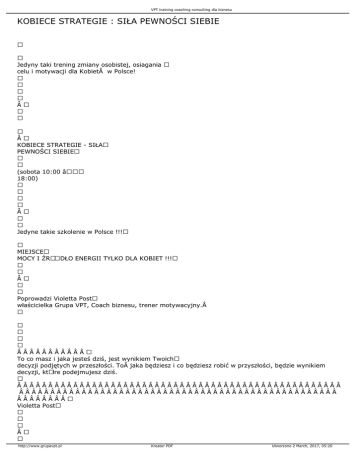 VPT training coaching consulting dla biznesu KOBIECE STRATEGIE : SIŁA PEWNOŚCI SIEBIE Jedyny taki trening zmiany osobistej, osiagania celu i motywacji dla Kobiet w Polsce!   KOBIECE STRATEGIE - SIŁA PEWNOŚCI SIEBIE (sobota 10:00 – 18:00)  Jedyne takie szkolenie w Polsce !!! MIEJSCE MOCY I ŹRÓDŁO ENERGII TYLKO DLA KOBIET !!!  Poprowadzi Violetta Post właścicielka Grupa VPT, Coach biznesu, trener motywacyjny. Â To co masz i jaka jesteś dziś, jest wynikiem Twoich decyzji podjętych w przeszłości. To jaka będziesz i co będziesz robić w przyszłości, będzie wynikiem decyzji, ktÃłre podejmujesz dziś.    Violetta Post  http://www.grupavpt.pl Kreator PDF Utworzono 2 March, 2017, 05:20 VPT training coaching consulting dla biznesu Pierwszy krok do bycia NAPRAWDĘ kochaną, szanowaną, pewną siebie i silną wewnętrznie. Spokojną, tym samym naturalną, ciepłą i tajemniczą. Szczęśliwą i spełnioną, czyli prawdziwie kobiecą i delikatną jednocześnie.  Wiara w siebie jest jedną z najważniejszych umiejętności inteligencji emocjonalnej, ktÃłra jest odpowiedzialna za sukces człowieka w życiu. Decyduje o tym, czy masz motywację do działania, radość i czy potrafisz pokonywać trudności. Przekonywać innych do swoich pomysłÃłw, dzielić się swoją wiedzą oraz kierować innymi. To decyzyjność na temat tego jak przewodzić, radzić sobie ze stresem, emocjami i nowymi obowiązkami. Wiara, ktÃłra nauczy jak efektywnie pracować i mieć dobre relacje z innymi ludźmi. To umiejętność i przekonanie, że potrafisz wywierać na nich wpływ oraz poczucie spełnienia osobistego i zawodowego.  Dla kobiety pewnej siebie, życie to wyzwanie. Kobieta pewna siebie, nie boi się odrzucenia. Potrafi podejmować ryzyko, zaraża innych dobrym humorem, optymizmem. To kobieta, ktÃłra wie doskonale, jak poradzić sobie w każdej sytuacji. Jak asertywnie wyrażać swoje zdanie. Nie usprawiedliwiająca się i nie umniejszająca sobie wobec nadchodzącej porażki. Potrafi ocenić sytuację w momencie nieosiągnięcia założonego celu, wyciągnąć wnioski i dokonywać zmian. Wie, że ma prawo się obawiać i że ma prawo do słabszych dni. Wie czego chce i co zrobić, by osiągnąć osobisty SUKCES.   Â Większość z nas, z uwagi na wychowanie oraz role pełnione w życiu jako matki, żony czy aktywne zawodowo kobiety, odczuwa braku pewności siebie. Powodują to często związane z tym napięcia. Kiedy kończy się dzień, poddajemy się, sabotujemy swoje wysiłki i czujemy tak strasznie niedowartościowane. Zaczynamy się bać. Pojawia się wtedy taka nieodparta chęć podjęcia działania i mÃłwienia o swoich potrzebach. Zamiast czuć MOC, poddajemy się,  stając tym samym uległymi, a czasem nawet agresywnymi. Dlatego musisz sobie odpowiedzieć na BARDZO WAŻNE PYTANIA:  Â Brak Ci odwagi, by odezwać się kiedy ktoś zachowuje się wobec Ciebie agresywnie?  Z http://www.grupavpt.pl Kreator PDF Utworzono 2 March, 2017, 05:20 VPT training coaching consulting dla biznesu czymś się nie zgadzasz, a jednak to robisz w obawie przed krytyką albo konfliktem?  Trudno znosisz porażki i niepowodzenia ?  Masz poczucie niesprawiedliwości ?  Szybko tracisz panowanie nad sobą ?  Chcesz zrobić w końcu cos więcej dla siebie ?  Masz poczucie przeciążenia, wypalenia i mijającego czasu?  Czujesz się wykorzystywana przez innych w pracy i w domu ?  Trudno Ci zrozumieć okres buntu Twoich dzieci ?  Nie akceptujesz siebie samej?  Tak, TwÃłj umysł informuje Cię, że czas na zmianę. Dokładnie tak, jak informuje nas mÃłzg o narastającym bÃłlu naszego ciała. Na początku też nie dostrzegasz dyskomfortu. Zaczynasz działać dopiero wtedy, kiedy bÃłl narasta. Jedni od razu prÃłbują to zaleczyć, mając świadomość uniknięcia większych problemÃłw. Inni jeszcze zwlekają w dziecięcej naiwności, że samo przejdzie. Wiara w siebie, określana rÃłwnież jako „Samoskuteczność― – to Wiara w skuteczność własnych działań, celÃłw i marzeń. Poznaj narzędzia, ktÃłre Ci to umożliwią. Po prostu musisz przeżyć to z Nami!  http://www.grupavpt.pl Kreator PDF Utworzono 2 March, 2017, 05:20 VPT training coaching consulting dla biznesu Violetta Post Business coach, vipcoaching.pl Coach ICC Międzynarodowy certyfikat Coach’a wydany przez International Coaching Community, certyfikowany trener NLP, Master Practitioner NLP in Neurolingwistic Insitut.   W biznesie od ponad 15 lat. Właścicielka firmy szkoleniowo - coachingowej GRUPA VPT. Autorka projektÃłw coachingowych i treningÃłw dla biznesu oraz osÃłb indywidualnych w zakresie perswazji, psychologii zarządzania, HR. Coach wyższej kadry menedżerskiej (ponad 20 właścicieli firm i kadry zarządzającej). Coach projektu „Kobieta spełniona w biznesie― TVP2. Członek- założyciel Polskiej Izby Coachingu, Ery Kobiet i vipcoachingu.pl. Dodatkowo uczyła się u : Frank Farelly, Suzi Smith, Robert Dilts, Braian Tracy. Prywatnie szczęśliwa mama Olgierda i Oliwii.  Co zyskujesz po treningu: §        zwiększy się Twoja samoświadomość §        wzmocni samoakceptacja i poczucie pewności siebie §        zwiększy poczucie kontroli nad sytuacjami życiowymi §        nauczysz się lepiej wyrażać swoje mocne strony §        poznasz werbalne i niewerbalne strategie budowania pewności siebie §        poczujesz http://www.grupavpt.pl Kreator PDF Utworzono 2 March, 2017, 05:20 VPT training coaching consulting dla biznesu więcej radości i spokoju §        poznasz strategie kobiet sukcesu §        zrobisz pierwszy krok do pozytywnych zmian w relacjach z osobami, na ktÃłrych Ci zależy §        poznasz dużo wspaniałych kobiet.  Program: §         Inteligencja emocjonalna u ludzi pewnych siebie. §         Analiza transakcyjna: wyjście z kręgu ofiary i s