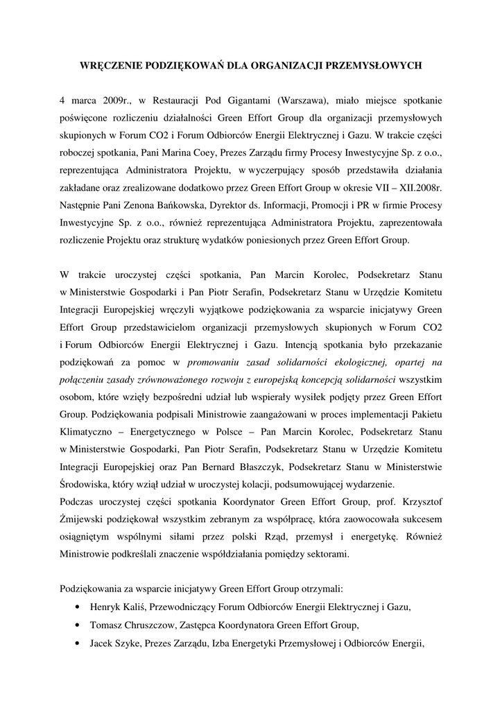 WRĘCZENIE PODZIĘKOWAŃ DLA ORGANIZACJI PRZEMYSŁOWYCH 4 marca 2009r., w Restauracji Pod Gigantami (Warszawa), miało miejsce spotkanie poświęcone rozliczeniu działalności Green Effort Group dla organizacji przemysłowych skupionych w Forum CO2 i Forum Odbiorców Energii Elektrycznej i Gazu. W trakcie części roboczej spotkania, Pani Marina Coey, Prezes Zarządu firmy Procesy Inwestycyjne Sp. z o.o., reprezentująca Administratora Projektu, w wyczerpujący sposób przedstawiła działania zakładane oraz zrealizowane dodatkowo przez Green Effort Group w okresie VII – XII.2008r. Następnie Pani Zenona Bańkowska, Dyrektor ds. Informacji, Promocji i PR w firmie Procesy Inwestycyjne Sp. z o.o., również reprezentująca Administratora Projektu, zaprezentowała rozliczenie Projektu oraz strukturę wydatków poniesionych przez Green Effort Group. W trakcie uroczystej części spotkania, Pan Marcin Korolec, Podsekretarz Stanu w Ministerstwie Gospodarki i Pan Piotr Serafin, Podsekretarz Stanu w Urzędzie Komitetu Integracji Europejskiej wręczyli wyjątkowe podziękowania za wsparcie inicjatywy Green Effort Group przedstawicielom organizacji przemysłowych skupionych w Forum CO2 i Forum Odbiorców Energii Elektrycznej i Gazu. Intencją spotkania było przekazanie podziękowań za pomoc w promowaniu zasad solidarności ekologicznej, opartej na połączeniu zasady zrównoważonego rozwoju z europejską koncepcją solidarności wszystkim osobom, które wzięły bezpośredni udział lub wspierały wysiłek podjęty przez Green Effort Group. Podziękowania podpisali Ministrowie zaangażowani w proces implementacji Pakietu Klimatyczno – Energetycznego w Polsce – Pan Marcin Korolec, Podsekretarz Stanu w Ministerstwie Gospodarki, Pan Piotr Serafin, Podsekretarz Stanu w Urzędzie Komitetu Integracji Europejskiej oraz Pan Bernard Błaszczyk, Podsekretarz Stanu w Ministerstwie Środowiska, który wziął udział w uroczystej kolacji, podsumowującej wydarzenie. Podczas uroczystej części spotkania Koordynator Green Effort Group, prof. Krzysztof Żmijewski podziękował wszystkim zebranym za współpracę, która zaowocowała sukcesem osiągniętym wspólnymi siłami przez polski Rząd, przemysł i energetykę. Również Ministrowie podkreślali znaczenie współdziałania pomiędzy sektorami. Podziękowania za wsparcie inicjatywy Green Effort Group otrzymali: • Henryk Kaliś, Przewodniczący Forum Odbiorców Energii Elektrycznej i Gazu, • Tomasz Chruszczow, Zastępca Koordynatora Green Effort Group, • Jacek Szyke, Prezes Zarządu, Izba Energetyki Przemysłowej i Odbiorców Energii, • Tadeusz Michurski, Dyrektor Biura, Izba Energetyki Przemysłowej i Odbiorców Energii, • Romuald Talarek, Prezes Zarządu, Hutnicza Izba Przemysłowo – Handlowa • Kazimierz Kowalski, Wiceprezes Zarządu, Hutnicza Izba Przemysłowo – Handlowa, • Janusz Olszowski, Prezes, Górnicza Izba Przemysłowo – Handlowa, • Jacek Szymczak, Prezes Zarządu, Izba Gospodarcza „Ciepłownictwo Polskie”, • Bogusław Regulski, Wiceprezes Zarządu, Izba Gospodarcza Ciepłownictwo Polskie, • Roland Stasiak, Prezes Zarządu, Izba Gospodarcza Metali Nieżelaznych, • Emil Główczyk, Ekspert Izby Gospodarczej Metali Nieżelaznych, • Wojciech Lubiewa – Wieleżyński, Prezes Zarządu, Polska Izba Przemysłu Chemicznego, • Jerzy Majchrzak, Dyrektor Biura, Polska Izba Przemysłu Chemicznego, • Waldemar Tuszewicki, Ekspert, Polska Izba Przemysłu Chemicznego, • Michał Jarczyński, Prezes, Stowarzyszenie Papierników Polskich, • Zbigniew Fornalski, Dyrektor Generalny, Stowarzyszenie Papierników Polskich, • Janusz Turski, Dyrektor Zarządzający, Stowarzyszenie Papierników Polskich, • Andrzej Balcerek, Przewodniczący, Stowarzyszenie Producentów Cementu, • Jan Deja, Dyrektor Biura, Stowarzyszenie Producentów Cementu, • Dariusz Konieczny, Ekspert, Stowarzyszenie Producentów Cementu, • Czesław Kalamarz, Przewodniczący, Stowarzyszenie Przemysłu Wapienniczego, • Tomasz Laskowski, Ekspert, Stowarzyszenie Przemysłu Wapienniczego, • Jan Świątek, Prezes, Związek Pracodawców „Polskie Szkło”, • Michał Staszewski, Przewodniczący, Związek Pracodawców Ceramiki Budowlanej i Silikatów, • Jolanta Kapuścińska, Dyrektor Biura, Związek Pracodawców Ceramiki Budowlanej i Silikatów, • Tadeusz Kosień, Prezydent, Stowarzyszenie Producentów Płyt Drewnopochodnych w Polsce, • Piotr Herchel, Ekspert, Stowarzyszenie Producentów Płyt Drewnopochodnych w Polsce, • Michał Staszewski, po raz drugi, jako Prezes Zarządu Konfederacji Budownictwa i Nieruchomości, • Henryk Kaliś, Przewodniczący, Forum Odbiorców Energii Elektrycznej i Gazu, • Daniel Borsucki, Wiceprzewodniczący, Forum Odbiorców Energii Elektrycznej i Gazu, • Andrzej Zielaskowski, Ekspert, Forum Odbiorców Energii Elektrycznej i Gazu, • Mirosław Semczuk, Ekspert, Forum Odbiorców Energii Elektrycznej i Gazu, • Andrzej Werkowski, Przewodniczący Forum CO2, • Tomasz Chruszczow, Wiceprzewodniczący Forum CO2, Wiceprzewodniczący Forum Odbiorców Energii Elektrycznej i Gazu oraz Dyrektor Biura Związku Pracodawców „Polskie Szkło”. W trakcie uroczystości przedstawiciele Forum CO2 oraz Forum Odbiorców Energii Elektrycznej i Gazu wyrazili swoją wdzięczność prof. Krzysztofowi Żmijewskiemy, wręczając mu specjalny dyplom – podziękowania za ogromny wysiłek jaki włożył we wspólny sukces, za wsparcie merytoryczne i znakomitą koordynację przeprowadzonych działań. Przedstawiciele organizacji przemysłowych nie zapomnieli również o Administratorze Green Effort Group. Wyjątkowe wyrazy uznania za często anonimową, lecz mozolną i niezwykle istotną pracę, zostały wręczone Pani Marinie Coey, Prezes Zarządu firmy Procesy Inwestycyjne Sp. z .o. Po zakończeniu części oficjalnej Pan Prof. Krzysztof Żmijewski zaprezentował szczegóły wynegocjowanego podczas grudniowego szczytu UE
