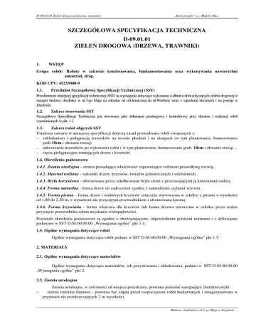 D-09.01.01 Zieleń drogowa (drzewa, trawniki) „Kom-projekt” s.c. Maków Maz. SZCZEGÓŁOWA SPECYFIKACJA TECHNICZNA D-09.01.01 ZIELEŃ DROGOWA (DRZEWA, TRAWNIKI) 1. WSTĘP Grupa robót: Roboty w zakresie konstruowania, fundamentowania oraz wykonywania nawierzchni autostrad, dróg. KOD CPV: 45233000-9 1.1. Przedmiot Szczegółowej Specyfikacji Technicznej (SST) Przedmiotem niniejszej specyfikacji technicznej (SST) są wymagania dotyczące wykonania i odbioru robót dotyczących zieleni drogowej w ramach budowy chodnika w ul.3-go Maja na odcinku od ul.Granicznej do ul.Werbeny wraz z wjazdami ulicznymi i na posesje w Józefowie . 1.2. Zakres stosowania SST Szczegółowa Specyfikacja Techniczna jest stosowana jako dokument przetargowy i kontraktowy przy zlecaniu i realizacji robót wymienionych w pkt. 1.1. 1.3. Zakres robót objętych SST Ustalenia zawarte w niniejszej specyfikacji dotyczą zasad prowadzenia robót związanych z: − zakładaniem i pielęgnacją trawników na terenie płaskim i na skarpach (w tym plantowanie, humusowanie grub.10cm i obsianie trawą) − odtworzenie trawników po wykonaniu robót ( w tym plantowanie, humusowanie grub. 10cm i obsianie trawą) – − cięcia pielęgnacyjne istniejących drzew i krzewów. 1.4. Określenia podstawowe 1.4.1. Ziemia urodzajna - ziemia posiadająca właściwości zapewniające roślinom prawidłowy rozwój. 1.4.2. Materiał roślinny - sadzonki drzew, krzewów, kwiatów jednorocznych i wieloletnich. 1.4.3. Bryła korzeniowa - uformowana przez szkółkowanie bryła ziemi z przerastającymi ją korzeniami rośliny. 1.4.4. Forma naturalna - forma drzew do zadrzewień zgodna z naturalnymi cechami wzrostu. 1.4.5. Forma pienna - forma drzew i niektórych krzewów sztucznie wytworzona w szkółce z pniami o wysokości od 1,80 do 2,20 m, z wyraźnym nie przyciętym przewodnikiem i uformowaną koroną. 1.4.6. Forma krzewiasta - forma właściwa dla krzewów lub forma drzewa utworzona w szkółce przez niskie przycięcie przewodnika celem uzyskania wielopędowości. Pozostałe określenia podstawowe są zgodne z obowiązującymi, odpowiednimi polskimi normami i z definicjami podanymi w SST D-M-00.00.00 „Wymagania ogólne” pkt 1.4. 1.5. Ogólne wymagania dotyczące robót Ogólne wymagania dotyczące robót podano w SST D-M-00.00.00 „Wymagania ogólne” pkt 1.5. 2. MATERIAŁY 2.1. Ogólne wymagania dotyczące materiałów Ogólne wymagania dotyczące materiałów, ich pozyskiwania i składowania, podano w SST D-M-00.00.00 „Wymagania ogólne” pkt 2. 2.2. Ziemia urodzajna − Ziemia urodzajna, w zależności od miejsca pozyskania, powinna posiadać następujące charakterystyki: ziemia rodzima (humus) - powinna być zdjęta przed rozpoczęciem robót budowlanych i zmagazynowana w pryzmach nie przekraczających 2 m wysokości, Budowa chodnika w ul.3-go Maja w Józefowie „Kom-projekt” s.c. Maków Maz. D-09.01.01 Zieleń drogowa (drzewa, trawniki) ziemia pozyskana w innym miejscu i dostarczona na plac budowy - nie może być zagruzowana, przerośnięta korzeniami, zasolona lub zanieczyszczona chemicznie. Do humusowania należy użyć ziemię roślinną (humus) z dowozu. − 2.3. Ziemia kompostowa Do nawożenia gleby mogą być stosowane komposty, powstające w wyniku rozkładu różnych odpadków roślinnych i zwierzęcych (np. torfu, fekaliów, kory drzewnej, chwastów, plewów), przy kompostowaniu ich na otwartym powietrzu w pryzmach, w sposób i w warunkach zapewniających utrzymanie wymaganych cech i wskaźników jakości kompostu. Kompost fekaliowo-torfowy - wyrób uzyskuje się przez kompostowanie torfu z fekaliami i ściekami bytowymi z osadników, z osiedli mieszkaniowych. Kompost fekalowo-torfowy powinien odpowiadać wymaganiom BN-73/0522-01 [5], a torf użyty jako komponent do wyrobu kompostu - PN-G-98011 [1]. Kompost z kory drzewnej - wyrób uzyskuje się przez kompostowanie kory zmieszanej z mocznikiem i osadami z oczyszczalni ścieków pocelulozowych, przez okres około 3-ch miesięcy. Kompost z kory sosnowej może być stosowany jako nawóz organiczny przy przygotowaniu gleby pod zieleń w okresie jesieni, przez zmieszanie kompostu z glebą. 2.4. Nasiona traw Nasiona traw najczęściej występują w postaci gotowych mieszanek z nasion różnych gatunków. Gotowa mieszanka traw powinna mieć oznaczony procentowy skład gatunkowy, klasę, numer normy wg której została wyprodukowana, zdolność kiełkowania. 2.5. Nawozy mineralne Nawozy mineralne powinny być w opakowaniu, z podanym składem chemicznym (zawartość azotu, fosforu, potasu - N.P.). Nawozy należy zabezpieczyć przed zawilgoceniem i zbryleniem w czasie transportu i przechowywania. 3. SPRZĘT 3.1. Ogólne wymagania dotyczące sprzętu Ogólne wymagania dotyczące sprzętu podano w SST D-M-00.00.00 „Wymagania ogólne” pkt 3. 3.2. Sprzęt stosowany do wykonania zieleni drogowej Wykonawca przystępujący do wykonania zieleni drogowej powinien wykazać się możliwością korzystania z następującego sprzętu: − glebogryzarek, pługów, kultywatorów, bron do uprawy gleby, − wału kolczatki oraz wału gładkiego do zakładania trawników, − kosiarki mechanicznej do pielęgnacji trawników, − sprzętu do pozyskiwania ziemi urodzajnej (np. spycharki gąsiennicowej, koparki), a ponadto do pielęgnacji zadrzewień: − pił mechanicznych i ręcznych, − drabin, − podnośników hydraulicznych. 4. TRANSPORT 4.1. Ogólne wymagania dotyczące transportu Ogólne wymagania dotyczące transportu podano w SST D-M-00.00.00 „Wymagania ogólne” pkt 4. 4.2. Transport materiałów do wykonania nasadzeń Transport materiałów do zieleni drogowej może być dowolny pod warunkiem, że nie uszkodzi, ani też nie pogorszy jakości transportowanych materiałów. Budowa chodnika w ul.3-go Maja w Józefowie D-09.01.01 Zieleń drogowa (drzewa, trawniki) „Kom-projekt” s.c. Maków Maz. 5. WYKONANIE ROBÓT 5.1. Ogólne zasady wykonania robót Ogólne zasady wyko