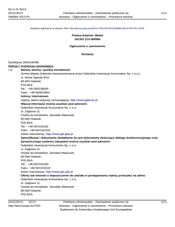 Dz.U./S S213 02/11/2013 369584-2013-PL Państwa członkowskie - Zamówienie publiczne na dostawy - Ogłoszenie o zamówieniu - Procedura otwarta 1/11 Niniejsze ogłoszenie w witrynie TED: http://ted.europa.eu/udl?uri=TED:NOTICE:369584-2013:TEXT:PL:HTML Polska-Gdańsk: Meble 2013/S 213-369584 Ogłoszenie o zamówieniu Dostawy Dyrektywa 2004/18/WE Sekcja I: Instytucja zamawiająca I.1) Nazwa, adresy i punkty kontaktowe Gmina Miasta Gdańska (reprezentowana przez Gdańskie Inwestycje Komunalne Sp. z o.o.) ul. Nowe Ogrody 8/12 80-803 Gdańsk POLSKA Tel.: +48 583236000 Faks: +48 583023941 Adresy internetowe: Ogólny adres instytucji zamawiającej: http://www.gdansk.pl Więcej informacji można uzyskać pod adresem: Gdańskie Inwestycje Komunalne Sp. z o.o. ul. Żaglowa 11 Osoba do kontaktów: Jarosław Małuszek 80-560 Gdańsk POLSKA Tel.: +48 587220100 Faks: +48 587220103 Adres internetowy: http://www.gik.gda.pl Specyfikacje i dokumenty dodatkowe (w tym dokumenty dotyczące dialogu konkurencyjnego oraz dynamicznego systemu zakupów) można uzyskać pod adresem: Gdańskie Inwestycje Komunalne Sp. z o.o. ul. Żaglowa 11 Osoba do kontaktów: Jarosław Małuszek 80-560 Gdańsk POLSKA Tel.: +48 587220100 Faks: +48 587220103 Adres internetowy: http://www.gik.gda.pl Oferty lub wnioski o dopuszczenie do udziału w postępowaniu należy przesyłać na adres: Gdańskie Inwestycje Komunalne Sp. z o.o. ul. Żaglowa 11 Osoba do kontaktów: Jarosław Małuszek 80-560 Gdańsk POLSKA 02/11/2013 S213 http://ted.europa.eu/TED Państwa członkowskie - Zamówienie publiczne na dostawy - Ogłoszenie o zamówieniu - Procedura otwarta Suplement do Dziennika Urzędowego Unii Europejskiej 1/11 Dz.U./S S213 02/11/2013 369584-2013-PL Państwa członkowskie - Zamówienie publiczne na dostawy - Ogłoszenie o zamówieniu - Procedura otwarta 2/11 Tel.: +48 587220100 Faks: +48 587220103 Adres internetowy: http://www.gik.gda.pl I.2) Rodzaj instytucji zamawiającej Organ władzy regionalnej lub lokalnej I.3) Główny przedmiot lub przedmioty działalności Ogólne usługi publiczne I.4) Udzielenie zamówienia w imieniu innych instytucji zamawiających Instytucja zamawiająca dokonuje zakupu w imieniu innych instytucji zamawiających: nie Sekcja II: Przedmiot zamówienia II.1) Opis II.1.1) Nazwa nadana zamówieniu przez instytucję zamawiającą: Wyposażenie trzech zespołów gastronomicznych: kawiarni, baru oraz restauracji znajdujących się w nowobudowanym budynku Europejskiego Centrum Solidarności w Gdańsku w meble i urządzenia kuchenne stanowiące tzw. wyposażenie technologiczne. II.1.2) Rodzaj zamówienia oraz lokalizacja robót budowlanych, miejsce realizacji dostawy lub świadczenia usług Dostawy Główne miejsce lub lokalizacja robót budowlanych, miejsce realizacji dostawy lub świadczenia usług: Gdańsk. Kod NUTS PL634 II.1.3) Informacje na temat zamówienia publicznego, umowy ramowej lub dynamicznego systemu zakupów (DSZ) Ogłoszenie dotyczy zamówienia publicznego II.1.4) Informacje na temat umowy ramowej II.1.5) Krótki opis zamówienia lub zakupu Przedmiotem zamówienia jest wyposażenie trzech zespołów gastronomicznych: kawiarni, baru oraz restauracji znajdujących się w nowobudowanym budynku Europejskiego Centrum Solidarności w Gdańsku w meble i urządzenia kuchenne stanowiące tzw. wyposażenie technologiczne. II.1.6) Wspólny Słownik Zamówień (CPV) 39100000, 39140000, 39141000 II.1.7) Informacje na temat Porozumienia w sprawie zamówień rządowych (GPA) Zamówienie jest objęte Porozumieniem w sprawie zamówień rządowych (GPA): tak II.1.8) Części To zamówienie podzielone jest na części: nie II.1.9) Informacje o ofertach wariantowych Dopuszcza się składanie ofert wariantowych: nie II.2) Wielkość lub zakres zamówienia II.2.1) Całkowita wielkość lub zakres: 1. Przedmiot zamówienia. 02/11/2013 S213 http://ted.europa.eu/TED Państwa członkowskie - Zamówienie publiczne na dostawy - Ogłoszenie o zamówieniu - Procedura otwarta Suplement do Dziennika Urzędowego Unii Europejskiej 2/11 Dz.U./S S213 02/11/2013 369584-2013-PL Państwa członkowskie - Zamówienie publiczne na dostawy - Ogłoszenie o zamówieniu - Procedura otwarta 3/11 Przedmiotem zamówienia jest wyposażenie trzech zespołów gastronomicznych: kawiarni, baru oraz restauracji znajdujących się w nowobudowanym budynku Europejskiego Centrum Solidarności w Gdańsku w meble i urządzenia kuchenne stanowiące tzw. wyposażenie technologiczne. 1) Kawiarnia Pomieszczenie o powierzchni całkowitej 74,02 m2 stanowi wydzielony lokal gastronomiczny składający się z zaplecza i sali konsumpcyjnej oznaczony w dokumentacji jako zespół pomieszczeń 0.37 księgarnia i cafe bar. Dostęp dla klientów jest zapewniony od strony hallu głównego. Wejście dostawcze znajduje się od strony przedsionka hali rozładunku (pomieszczenia oznaczonego w dokumentacji jako 0.36). Zaplecze kawiarni składa się z WC i zaplecza socjalnego dla pracowników oraz ze zmywalni. Sala konsumpcyjna przewidziana na 20 osób o powierzchni 56,49 m2 składa się z baru (bufetu) oraz z miejsc siedzących dla klientów. W kawiarni będą serwowane gotowe wyroby w postaci kanapek, sałatek oraz innych drobnych artykułów spożywczych dostarczanych do lokalu w formie gotowej do spożycia. Na miejscu będą przygotowywane napoje ciepłe takie jak kawa i herbata. Wydawanie potraw i napojów przewidziano wyłącznie przez bar, w naczyniach wielorazowego użytku. W zakres wyposażenia kawiarni nie wchodzą: - elementy będące w zakresie Generalnego Wykonawcy robót budowlano-montażowych: - armatura WC tj.: miska ustępowa i umywalka, - umywalka nablatowa baru (bufetu), - elementy będące przedmiotem odrębnego postępowania przetargowego: - umeblowanie sali konsumpcyjnej w stoły i krzesła i sofy, - elementy których dostawa będzie znajdowała się w zakresie przyszłego najemcy lokalu: - bar (bufet) składający się z 2 elementów: baru z nadstawką ora