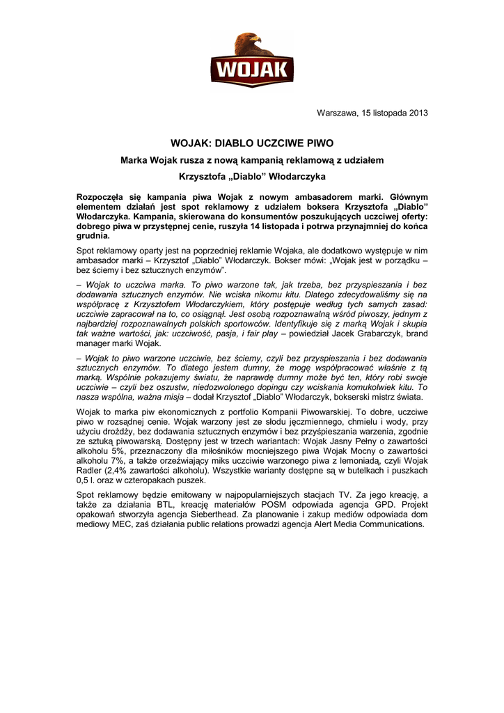 Warszawa, 15 listopada 2013 WOJAK: DIABLO UCZCIWE PIWO Marka Wojak rusza z nową kampanią reklamową z udziałem Krzysztofa „Diablo” Włodarczyka Rozpoczęła się kampania piwa Wojak z nowym ambasadorem marki. Głównym elementem działań jest spot reklamowy z udziałem boksera Krzysztofa „Diablo” Włodarczyka. Kampania, skierowana do konsumentów poszukujących uczciwej oferty: dobrego piwa w przystępnej cenie, ruszyła 14 listopada i potrwa przynajmniej do końca grudnia. Spot reklamowy oparty jest na poprzedniej reklamie Wojaka, ale dodatkowo występuje w nim ambasador marki – Krzysztof „Diablo” Włodarczyk. Bokser mówi: „Wojak jest w porządku – bez ściemy i bez sztucznych enzymów”. – Wojak to uczciwa marka. To piwo warzone tak, jak trzeba, bez przyspieszania i bez dodawania sztucznych enzymów. Nie wciska nikomu kitu. Dlatego zdecydowaliśmy się na współpracę z Krzysztofem Włodarczykiem, który postępuje według tych samych zasad: uczciwie zapracował na to, co osiągnął. Jest osobą rozpoznawalną wśród piwoszy, jednym z najbardziej rozpoznawalnych polskich sportowców. Identyfikuje się z marką Wojak i skupia tak ważne wartości, jak: uczciwość, pasja, i fair play – powiedział Jacek Grabarczyk, brand manager marki Wojak. – Wojak to piwo warzone uczciwie, bez ściemy, czyli bez przyspieszania i bez dodawania sztucznych enzymów. To dlatego jestem dumny, że mogę współpracować właśnie z tą marką. Wspólnie pokazujemy światu, że naprawdę dumny może być ten, który robi swoje uczciwie – czyli bez oszustw, niedozwolonego dopingu czy wciskania komukolwiek kitu. To nasza wspólna, ważna misja – dodał Krzysztof „Diablo” Włodarczyk, bokserski mistrz świata. Wojak to marka piw ekonomicznych z portfolio Kompanii Piwowarskiej. To dobre, uczciwe piwo w rozsądnej cenie. Wojak warzony jest ze słodu jęczmiennego, chmielu i wody, przy użyciu drożdży, bez dodawania sztucznych enzymów i bez przyśpieszania warzenia, zgodnie ze sztuką piwowarską. Dostępny jest w trzech wariantach: Wojak Jasny Pełny o zawartości alkoholu 5%, przeznaczony dla miłośników mocniejszego piwa Wojak Mocny o zawartości alkoholu 7%, a także orzeźwiający miks uczciwie warzonego piwa z lemoniadą, czyli Wojak Radler (2,4% zawartości alkoholu). Wszystkie warianty dostępne są w butelkach i puszkach 0,5 l. oraz w czteropakach puszek. Spot reklamowy będzie emitowany w najpopularniejszych stacjach TV. Za jego kreację, a także za działania BTL, kreację materiałów POSM odpowiada agencja GPD. Projekt opakowań stworzyła agencja Sieberthead. Za planowanie i zakup mediów odpowiada dom mediowy MEC, zaś działania public relations prowadzi agencja Alert Media Communications. *** Wojak Wojak to piwo dla konsumentów poszukujących uczciwej oferty: dobrego piwa w przystępnej cenie. To jedyna marka Kompanii Piwowarskiej w segmencie piw ekonomicznych. Po Wojaka sięgają mężczyźni ceniący w nim przyzwoitą jakość i odpowiednią, uczciwą cenę. Każdy z wariantów – Jasny Pełny (5% alkoholu), Mocny (7% alkoholu) oraz Radler (2,4% alkoholu) – pozwala cieszyć się smakiem piwa przy różnych okazjach. Wojak jest warzony według uczciwych reguł, bez pośpiechu i wykorzystania sztucznych enzymów. Wojak od 2009 roku jest sponsorem tytularnym gal boksu zawodowego „Wojak Boxing Night”. Kompania Piwowarska – lider branży piwowarskiej w Polsce Kompania Piwowarska jest liderem rynku piwa w Polsce. Gwarancją najwyższej, niezmiennej jakości warzonego w browarach KP piwa jest zespół świetnych fachowców, kilkusetletnie doświadczenie oraz nowoczesne technologie. Do portfela marek KP należą najpopularniejsze polskie piwa – m.in. Tyskie, Żubr, Lech, Dębowe Mocne, Redd's, a także międzynarodowe marki premium: Pilsner Urquell, Grolsch, Peroni Nastro Azzurro oraz specjalności, jak warzone według tradycyjnych receptur Tyskie Klasyczne czy kolekcja Książęcego. Wielbicielom piwa niepasteryzowanego w wybranych lokalach firma oferuje też piwo prosto z browaru, czyli Tyskie z tanka. Nowością w portfelu KP od 2013 roku jest cydr - Green Mill Cider - napój produkowany ze 100% soku jabłkowego. Kompania Piwowarska (utworzona w 1999 roku) posiada trzy browary (w Tychach, Poznaniu i Białymstoku) oraz oddziały handlowe na terenie całego kraju. KP od lat jest jednym z czołowych sponsorów sportu, prowadzi także działalność społeczną oraz programy edukacyjne popularyzujące odpowiedzialność i umiar w konsumowaniu alkoholu. Wielkość sprzedaży osiągniętej przez KP w roku finansowym zakończonym 31 marca 2013 r. wyniosła 14,5 mln hektolitrów piwa. Kompania Piwowarska jest częścią międzynarodowej grupy piwowarskiej SABMiller. SABMiller – jeden z największych na świecie producentów piwa Kompania Piwowarska jest częścią jednego z największych na świecie producentów piwa – SABMiller plc. Grupa produkuje lub dystrybuuje piwo na sześciu kontynentach, a jej ogólnoświatowy portfel obejmuje międzynarodowe piwa premium, takie jak Grolsch, Miller Genuine Draft, Peroni Nastro Azzurro czy Pilsner Urquell oraz czołowe marki lokalne, takie jak Aquila, Castle, Miller Lite, Snow czy Tyskie. SABMiller jest jedną z największych na świecie (poza USA) firm rozlewających produkty Coca-Coli. W roku finansowym zakończonym 31 marca 2012 SABMiller osiągnął przychody w wysokości 31,4 mld USD oraz wypracował zysk brutto (EBITA) w wysokości 5,6 mld USD. SABMiller plc jest notowany na giełdach papierów wartościowych w Londynie i Johannesburgu. Dodatkowych informacji udzielają: Jędrzej HUGO-BADER Account Manager Alert Media Communications [email protected] Tel. +48 22 546 11 00 Tel. kom. +48 505 113 146 Paulina ZŁOTNICKA Specjalista ds. mediów Kompania Piwowarska [email protected] Tel. +48 22 315 28 57 Tel. kom. +48 695 596 447