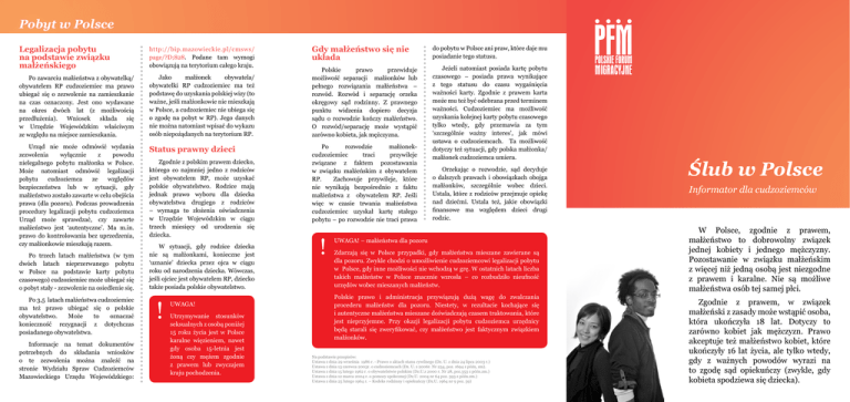 Pobyt w Polsce Legalizacja pobytu na podstawie związku małżeńskiego http://bip.mazowieckie.pl/cmsws/ page/?D;828. Podane tam wymogi obowiązują na terytorium całego kraju. Po zawarciu małżeństwa z obywatelką/ obywatelem RP cudzoziemiec ma prawo ubiegać się o zezwolenie na zamieszkanie na czas oznaczony. Jest ono wydawane na okres dwóch lat (z możliwością przedłużenia). Wniosek składa się w Urzędzie Wojewódzkim właściwym ze względu na miejsce zamieszkania. Jako małżonek obywatela/ obywatelki RP cudzoziemiec ma też podstawę do uzyskania polskiej wizy (to ważne, jeśli małżonkowie nie mieszkają w Polsce, a cudzoziemiec nie ubiega się o zgodę na pobyt w RP). Jego danych nie można natomiast wpisać do wykazu osób niepożądanych na terytorium RP. Urząd nie może odmówić wydania zezwolenia wyłącznie z powodu nielegalnego pobytu małżonka w Polsce. Może natomiast odmówić legalizacji pobytu cudzoziemca ze względów bezpieczeństwa lub w sytuacji, gdy małżeństwo zostało zawarte w celu obejścia prawa (dla pozoru). Podczas prowadzenia procedury legalizacji pobytu cudzoziemca Urząd może sprawdzać, czy zawarte małżeństwo jest ‘autentyczne’. Ma m.in. prawo do kontrolowania bez uprzedzenia, czy małżonkowie mieszkają razem. Status prawny dzieci Po trzech latach małżeństwa (w tym dwóch latach nieprzerwanego pobytu w Polsce na podstawie karty pobytu czasowego) cudzoziemiec może ubiegać się o pobyt stały - zezwolenie na osiedlenie się. Po 3,5 latach małżeństwa cudzoziemiec ma też prawo ubiegać się o polskie obywatelstwo. Może to oznaczać konieczność rezygnacji z dotychczas posiadanego obywatelstwa. Informacje na temat dokumentów potrzebnych do składania wniosków o te zezwolenia można znaleźć na stronie Wydziału Spraw Cudzoziemców Mazowieckiego Urzędu Wojewódzkiego: Zgodnie z polskim prawem dziecko, którego co najmniej jedno z rodziców jest obywatelem RP, może uzyskać polskie obywatelstwo. Rodzice mają jednak prawo wyboru dla dziecka obywatelstwa drugiego z rodziców – wymaga to złożenia oświadczenia w Urzędzie Wojewódzkim w ciągu trzech miesięcy od urodzenia się dziecka. W sytuacji, gdy rodzice dziecka nie są małżonkami, konieczne jest ‘uznanie’ dziecka przez ojca w ciągu roku od narodzenia dziecka. Wówczas, jeśli ojciec jest obywatelem RP, dziecko także posiada polskie obywatelstwo. UWAGA! Utrzymywanie stosunków seksualnych z osobą poniżej 15 roku życia jest w Polsce karalne więzieniem, nawet gdy osoba 15-letnia jest żoną czy mężem zgodnie z prawem lub zwyczajem kraju pochodzenia. Gdy małżeństwo się nie układa do pobytu w Polsce ani praw, które daje mu posiadanie tego statusu. Polskie prawo przewiduje możliwość separacji małżonków lub pełnego rozwiązania małżeństwa – rozwód. Rozwód i separację orzeka okręgowy sąd rodzinny. Z prawnego punktu widzenia dopiero decyzja sądu o rozwodzie kończy małżeństwo. O rozwód/separację może wystąpić zarówno kobieta, jak mężczyzna. Jeżeli natomiast posiada kartę pobytu czasowego – posiada prawa wynikające z tego statusu do czasu wygaśnięcia ważności karty. Zgodnie z prawem karta może mu też być odebrana przed terminem ważności. Cudzoziemiec ma możliwość uzyskania kolejnej karty pobytu czasowego tylko wtedy, gdy przemawia za tym ‘szczególnie ważny interes’, jak mówi ustawa o cudzoziemcach. Ta możliwość dotyczy też sytuacji, gdy polska małżonka/ małżonek cudzoziemca umiera. Po rozwodzie małżonekcudzoziemiec traci przywileje związane z faktem pozostawania w związku małżeńskim z obywatelem RP. Zachowuje przywileje, które nie wynikają bezpośrednio z faktu małżeństwa z obywatelem RP. Jeśli więc w czasie trwania małżeństwa cudzoziemiec uzyskał kartę stałego pobytu – po rozwodzie nie traci prawa Orzekając o rozwodzie, sąd decyduje o dalszych prawach i obowiązkach obojga małżonków, szczególnie wobec dzieci. Ustala, które z rodziców przejmuje opiekę nad dziećmi. Ustala też, jakie obowiązki finansowe ma względem dzieci drugi rodzic. UWAGA! – małżeństwa dla pozoru Zdarzają się w Polsce przypadki, gdy małżeństwa mieszane zawierane są dla pozoru. Zwykle chodzi o umożliwienie cudzoziemcowi legalizacji pobytu w Polsce, gdy inne możliwości nie wchodzą w grę. W ostatnich latach liczba takich małżeństw w Polsce znacznie wzrosła – co rozbudziło nieufność urzędów wobec mieszanych małżeństw. Polskie prawo i administracja przywiązują dużą wagę do zwalczania procederu małżeństw dla pozoru. Niestety, w rezultacie kochające się i autentyczne małżeństwa mieszane doświadczają czasem traktowania, które jest nieprzyjemne. Przy okazji legalizacji pobytu cudzoziemca urzędnicy będą starali się zweryfikować, czy małżeństwo jest faktycznym związkiem małżonków. Na podstawie przepisów: Ustawa z dnia 29 września 1986 r. - Prawo o aktach stanu cywilnego (Dz. U. z dnia 24 lipca 2003 r.) Ustawa z dnia 13 czerwca 2003r. o cudzoziemcach (Dz. U. z 2006r. Nr 234, poz. 1694 z późn, zm). Ustawa z dnia 15 lutego 1962 r. o obywatelstwie polskim (Dz.U.z 2000 r. Nr 28, poz.353 z późn.zm.) Ustawa z dnia 12 marca 2004 r. o pomocy społecznej (Dz.U. 2004 nr 64 poz. 593 z późn.zm.) Ustawa z dnia 25 lutego 1964 r. – Kodeks rodzinny i opiekuńczy (Dz.U. 1964 nr 9 poz. 59) Ślub w Polsce Informator dla cudzoziemców W Polsce, zgodnie z prawem, małżeństwo to dobrowolny związek jednej kobiety i jednego mężczyzny. Pozostawanie w związku małżeńskim z więcej niż jedną osobą jest niezgodne z prawem i karalne. Nie są możliwe małżeństwa osób tej samej płci. Zgodnie z prawem, w związek małżeński z zasady może wstąpić osoba, która ukończyła 18 lat. Dotyczy to zarówno kobiet jak mężczyzn. Prawo akceptuje też małżeństwo kobiet, które ukończyły 16 lat życia, ale tylko wtedy, gdy z ważnych powodów wyraz
