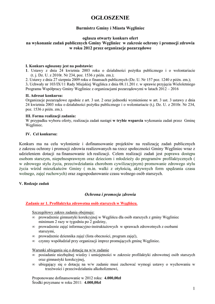OGŁOSZENIE Burmistrz Gminy i Miasta Węgliniec ogłasza otwarty konkurs ofert na wykonanie zadań publicznych Gminy Węgliniec w zakresie ochrony i promocji zdrowia w roku 2012 przez organizacje pozarządowe I. Konkurs ogłoszony jest na podstawie: 1. Ustawy z dnia 24 kwietnia 2003 roku o działalności poŜytku publicznego i o wolontariacie (t. j. Dz. U. z 2010r. Nr 234, poz. 1536 z późn. zm.); 2. Ustawy z dnia 27 sierpnia 2009 roku o finansach publicznych (Dz. U. Nr 157 poz. 1240 z późn. zm.); 3. Uchwały nr 103/IX/11 Rady Miejskiej Węglińca z dnia 08.11.201 r. w sprawie przyjęcia Wieloletniego Programu Współpracy Gminy Węgliniec z organizacjami pozarządowymi w latach 2012 – 2016 II. Adresat konkursu: Organizacje pozarządowe zgodnie z art. 3 ust. 2 oraz jednostki wymienione w art. 3 ust. 3 ustawy z dnia 24 kwietnia 2003 roku o działalności poŜytku publicznego i o wolontariacie (t.j. Dz. U. z 2010r. Nr 234, poz. 1536 z późn. zm.). III. Forma realizacji zadania: W przypadku wyboru oferty, realizacja zadań nastąpi w trybie wsparcia wykonania zadań przez Gminę Węgliniec. IV. Cel konkursu: Konkurs ma na celu wyłonienie i dofinansowanie projektów na realizację zadań publicznych z zakresu ochrony i promocji zdrowia realizowanych na rzecz społeczności Gminy Węgliniec wraz z udzieleniem dotacji na finansowanie ich realizacji. Celem realizacji zadań jest poprawa dostępu osobom starszym, niepełnosprawnym oraz dzieciom i młodzieŜy do programów profilaktycznych ( w zdrowego stylu Ŝycia, przeciwdziałania chorobom cywilizacyjnym) promowanie zdrowego stylu Ŝycia wśród mieszkańców Gminy ( m.in. walki z otyłością, aktywnych form spędzania czasu wolnego, zajęć ruchowych) oraz zagospodarowanie czasu wolnego osób starszych. V. Rodzaje zadań Ochrona i promocja zdrowia Zadanie nr 1. Profilaktyka zdrowotna osób starszych w Węglińcu. Szczegółowy zakres zadania obejmuje: • prowadzenie gimnastyki korekcyjnej w Węglińcu dla osób starszych z gminy Węgliniec minimum 2 razy w tygodniu po 2 godziny, • prowadzenie zajęć informacyjno-instruktaŜowych w sprawach zdrowotnych z osobami starszymi, • prowadzenie dziennika zajęć (lista obecności, program zajęć), • czynny współudział przy organizacji imprez promujących gminę Węgliniec. Warunki ubiegania się o dotację na w/w zadanie • posiadanie niezbędnej wiedzy i umiejętności w zakresie profilaktyki zdrowotnej osób starszych oraz gimnastyki korekcyjnej, • ubiegający się o dotację na w/w zadanie musi zachować wymogi ustawy o wychowaniu w trzeźwości i przeciwdziałaniu alkoholizmowi, Proponowane dofinansowanie w 2012 roku: 4.000,00zł Środki przyznane w roku 2011: 4.000,00zł 1 Środki przyznane w 2012 roku: 1.000,00 zł Zadanie nr 2. Profilaktyka zdrowotna osób starszych w Starym Węglińcu. Szczegółowy zakres zadania obejmuje: • prowadzenie gimnastyki korekcyjnej w Starym Węglińcu dla osób starszych z gminy Węgliniec minimum 2 razy w tygodniu po 2 godziny, • prowadzenie zajęć informacyjno-instruktaŜowych w sprawach zdrowotnych z osobami starszymi, • prowadzenie dziennika zajęć (lista obecności, program zajęć), • czynny współudział przy organizacji imprez promujących gminę Węgliniec. Warunki ubiegania się o dotację na w/w zadanie • posiadanie niezbędnej wiedzy i umiejętności w zakresie profilaktyki zdrowotnej osób • starszych oraz gimnastyki korekcyjnej, ubiegający się o dotację na w/w zadanie musi zachować wymogi ustawy o wychowaniu w trzeźwości i przeciwdziałaniu alkoholizmowi, Proponowane dofinansowanie w 2012 roku: 4.000,00zł Środki przyznane w roku 2011: 4.000,00zł Środki przyznane w 2012 roku: 1.000,00 zł VI. Zasady przyznawania dotacji. 1. ZłoŜenie oferty nie jest równoznaczne z zapewnieniem przyznania dotacji lub przyznaniem dotacji w oczekiwanej wysokości. Wysokość dotacji moŜe być niŜsza niŜ wnioskowana w ofercie. Wówczas podmiotowi przysługuje prawo do rezygnacji z realizacji zadania lub negocjowania zmniejszenia zakresu rzeczowego zadania. W takim wypadku podmiot zobowiązany jest do przedstawienia korekty kosztorysu i harmonogramu realizacji zadania. 2. Burmistrz Gminy i Miasta w Węglińcu moŜe odmówić podmiotowi wyłonionemu w konkursie przyznania dotacji i podpisania umowy w przypadku, gdy: a. rzeczywisty zakres zadania znacząco odbiega od opisanego w ofercie, b. podmiot lub jego reprezentanci utracą zdolność do czynności prawnych, c. zostaną ujawnione nieznane wcześniej okoliczności podwaŜające wiarygodność merytoryczną lub finansową oferenta. 3. Szczegółowe i ostateczne warunki realizacji, finansowania i rozliczania zadania reguluje umowa zawarta pomiędzy oferentem a Gminą Węgliniec. 4. Oferent przystępujący do zawarcia umowy winien przedstawić: a. zaktualizowany harmonogram realizacji zadania publicznego podpisany przez osoby upowaŜnione (o ile nastąpiły zmiany w stosunku do złoŜonej oferty) -1 egzemplarz, b. zaktualizowany kosztorys realizacji zadania publicznego podpisany przez osoby upowaŜnione (o ile nastąpiły zmiany w stosunku do złoŜonej oferty) - 1 egzemplarz, c. kopię aktualnego odpisu z Krajowego Rejestru Sądowego lub innego właściwego rejestru lub ewidencji (o ile nastąpiły zmiany w stosunku do dokumentu złoŜonego wraz z ofertą). Kopia musi być potwierdzona na kaŜdej stronie za zgodność z oryginałem przez uprawnione osoby reprezentujące podmiot występujący o dotację lub osoby upowaŜnione do potwierdzania dokumentów (w niniejszym przypadku do oferty powinno być dołączone upowaŜnienie do potwierdzania dokumentów dla tych osób). d. oświadczenie o nie podleganiu wykluczeniu e. w przypadku oferty wspólnej - umowę zawartą między organizacjami pozarządowymi zgodnie z art. 3 ust. 2 oraz jednostkami wymienionymi w art. 3 ust.3 ustawy z dnia 24 kwietnia 2003 roku o działalności poŜytku publicznego i o wolontariacie (t.j. Dz. U. 