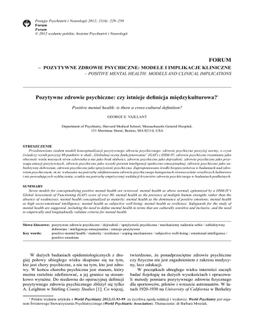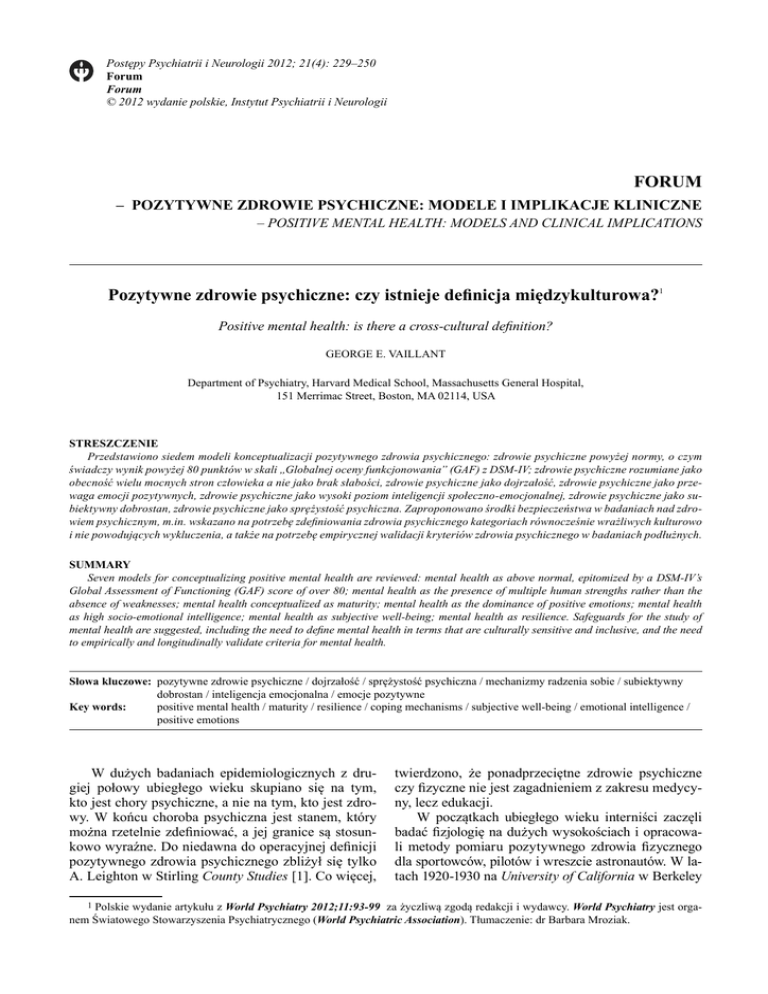 Postępy Psychiatrii i Neurologii 2012; 21(4): 229–250 Forum Forum © 2012 wydanie polskie, Instytut Psychiatrii i Neurologii FORUM – POZYTYWNE ZDROWIE PSYCHICZNE: MODELE I IMPLIKACJE KLINICZNE – POSITIVE MENTAL HEALTH: MODELS AND CLINICAL IMPLICATIONS Pozytywne zdrowie psychiczne: czy istnieje definicja międzykulturowa?1 Positive mental health: is there a cross-cultural definition? GEORGE E. VAILLANT Department of Psychiatry, Harvard Medical School, Massachusetts General Hospital, 151 Merrimac Street, Boston, MA 02114, USA STRESZCZENIE Przedstawiono siedem modeli konceptualizacji pozytywnego zdrowia psychicznego: zdrowie psychiczne powyżej normy, o czym świadczy wynik powyżej 80 punktów w skali „Globalnej oceny funkcjonowania” (GAF) z DSM-IV; zdrowie psychiczne rozumiane jako obecność wielu mocnych stron człowieka a nie jako brak słabości, zdrowie psychiczne jako dojrzałość, zdrowie psychiczne jako przewaga emocji pozytywnych, zdrowie psychiczne jako wysoki poziom inteligencji społeczno-emocjonalnej, zdrowie psychiczne jako subiektywny dobrostan, zdrowie psychiczne jako sprężystość psychiczna. Zaproponowano środki bezpieczeństwa w badaniach nad zdrowiem psychicznym, m.in. wskazano na potrzebę zdefiniowania zdrowia psychicznego kategoriach równocześnie wrażliwych kulturowo i nie powodujących wykluczenia, a także na potrzebę empirycznej walidacji kryteriów zdrowia psychicznego w badaniach podłużnych. SUMMARY Seven models for conceptualizing positive mental health are reviewed: mental health as above normal, epitomized by a DSM-IV’s Global Assessment of Functioning (GAF) score of over 80; mental health as the presence of multiple human strengths rather than the absence of weaknesses; mental health conceptualized as maturity; mental health as the dominance of positive emotions; mental health as high socio-emotional intelligence; mental health as subjective well-being; mental health as resilience. Safeguards for the study of mental health are suggested, including the need to define mental health in terms that are culturally sensitive and inclusive, and the need to empirically and longitudinally validate criteria for mental health. Słowa kluczowe: pozytywne zdrowie psychiczne / dojrzałość / sprężystość psychiczna / mechanizmy radzenia sobie / subiektywny dobrostan / inteligencja emocjonalna / emocje pozytywne Key words: positive mental health / maturity / resilience / coping mechanisms / subjective well-being / emotional intelligence / positive emotions W dużych badaniach epidemiologicznych z drugiej połowy ubiegłego wieku skupiano się na tym, kto jest chory psychiczne, a nie na tym, kto jest zdrowy. W końcu choroba psychiczna jest stanem, który można rzetelnie zdefiniować, a jej granice są stosunkowo wyraźne. Do niedawna do operacyjnej definicji pozytywnego zdrowia psychicznego zbliżył się tylko A. Leighton w Stirling County Studies [1]. Co więcej, twierdzono, że ponadprzeciętne zdrowie psychiczne czy fizyczne nie jest zagadnieniem z zakresu medycyny, lecz edukacji. W początkach ubiegłego wieku interniści zaczęli badać fizjologię na dużych wysokościach i opracowali metody pomiaru pozytywnego zdrowia fizycznego dla sportowców, pilotów i wreszcie astronautów. W latach 1920-1930 na University of California w Berkeley 1 Polskie wydanie artykułu z World Psychiatry 2012;11:93-99 za życzliwą zgodą redakcji i wydawcy. World Psychiatry jest organem Światowego Stowarzyszenia Psychiatrycznego (World Psychiatric Association). Tłumaczenie: dr Barbara Mroziak. 230 FORUM – pozytywne zdrowie psychiczne: modele i implikacje kliniczne powstał Institute of Human Development (Instytut Rozwoju Człowieka), którego założycielami byli H. Jones, N. Bayley i J. McFarlane [2,3]. Instytut, który pierwotnie miał badać rozwój zdrowego dziecka, wywarł ogromny wpływ na opracowany przez E. Eriksona model rozwoju zdrowego człowieka dorosłego. Pod koniec lat 30. A. Bock, internista specjalizujący się w fizjologii dużych wysokości i zainteresowany pozytywnym zdrowiem psychicznym, zorganizował Study of Adult Development (Studium Rozwoju Człowieka Dorosłego) na Uniwersytecie Harvarda [4,5], pomyślane jako interdyscyplinarne studia nad zdrowiem zarówno psychicznym, jak fizycznym. Podobnie jak sprawność fizyczna, pozytywne zdrowie psychiczne jest zbyt ważne, żeby je ignorować, lecz niełatwo je zdefiniować. Należy zachować kilka środków ostrożności. Po pierwsze, definiując zdrowie psychiczne trzeba pamiętać o różnicach międzykulturowych. Moje własne próby zdefiniowania zdrowia psychicznego mogą się wydawać prowincjonalne autorom z innych kontynentów. Komentarze do tego artykułu będą zatem szczególnie ważne. Po drugie, trzeba pamiętać, że „przeciętny” to nie znaczy zdrowy. W badaniach środowiskowych ludzie zdrowi zawsze stanowią domieszkę wśród przeważającej liczebnie psychopatologii. Jeśli chodzi o liczbę czerwonych ciałek krwi czy funkcje tarczycy, zdrowy jest środek krzywej dzwonowej (czyli rozkładu normalnego). W przypadku wzroku zdrowy jest tylko górny kraniec krzywej dzwonowej, a w przypadku cholesterolu i bilirubiny tylko niskie wartości z krańca krzywej dzwonowej są zdrowe. Po trzecie, trzeba sprecyzować, czy przedmiotem dyskusji jest cecha, czy stan. Szczególne znaczenie mają badania podłużne. Światowej klasy piłkarz chwilowo siedzący na ławce rezerwowych z powodu skręconej kostki (stan) jest prawdopodobnie zdrowszy niż diabetyk z cukrzycą typu 1 (cecha), który chwilowo ma normalny poziom cukru we krwi. I wreszcie, zdrowie psychiczne należy widzieć w kontekście. Komórki sierpowate jako cecha są niezdrowe w Paryżu, lecz nie w Afryce Centralnej, gdzie malaria jest endemiczna. W latach 40. ktoś z osobowością paranoidalną byłby bardzo kiepskim marynarzem na łodzi podwodnej, lecz znakomitym obserwatorem w samolocie myśliwskim. Punktualność i p